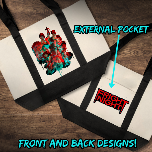 Welcome to Fright Night Canvas Tote Bag with Pocket – Horror Convention Carryall, Glitch Effect Design, Durable Zippered Tote
