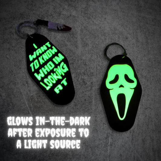 Ghostface Glow-in-the-Dark Motel Keychain | Scream Horror Inspired Retro Tag with Knife Charm | holographic horror keychain