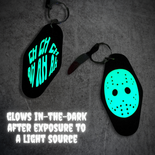 Jason Voorhees Glow-in-the-Dark Motel Keychain | Horror Quote Tag with Mask Design & Bloody Knife Charm | Halloween fan gift