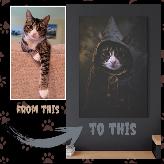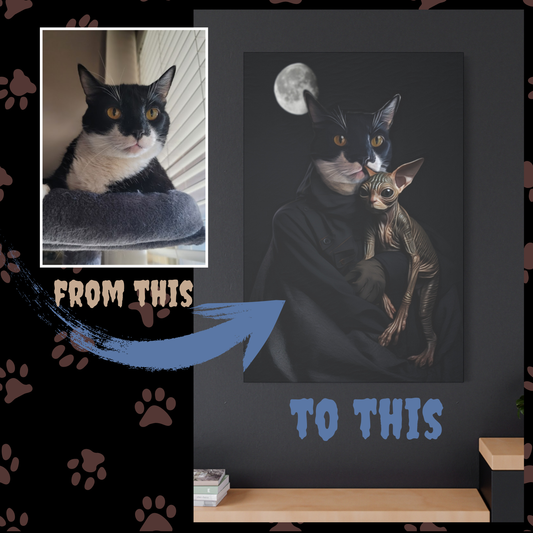 Elevate the spook factor with our bespoke Creepy Pet Portraits! Just share your pet's snapshots, and we'll transform them into a uniquely eerie masterpiece. Opt for the digital download for a swift turnaround at an affordable rate. But that's not all – we also offer canvases in diverse sizes, keychains, and 15oz mugs, allowing you to materialize your creepy creation into a tangible keepsake.