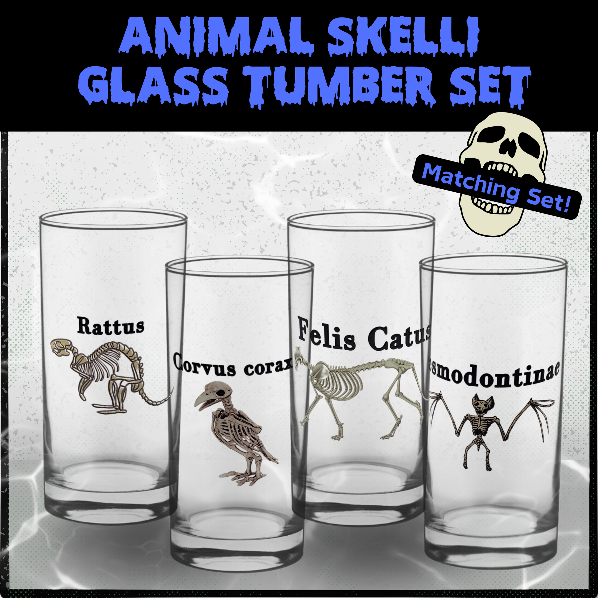 Are you an animal lover? Are you a fan of the macabre and creepy? Know someone else who is? Look no further! Our Animal Skelli Glass Tumbler Set includes 4 high-quality 15.5oz Libby brand glass tumblers. Each features the skeletal body of an animal ( cat, bat, crow and rat) and its scientific name labeled above. Macabre can be educational too!