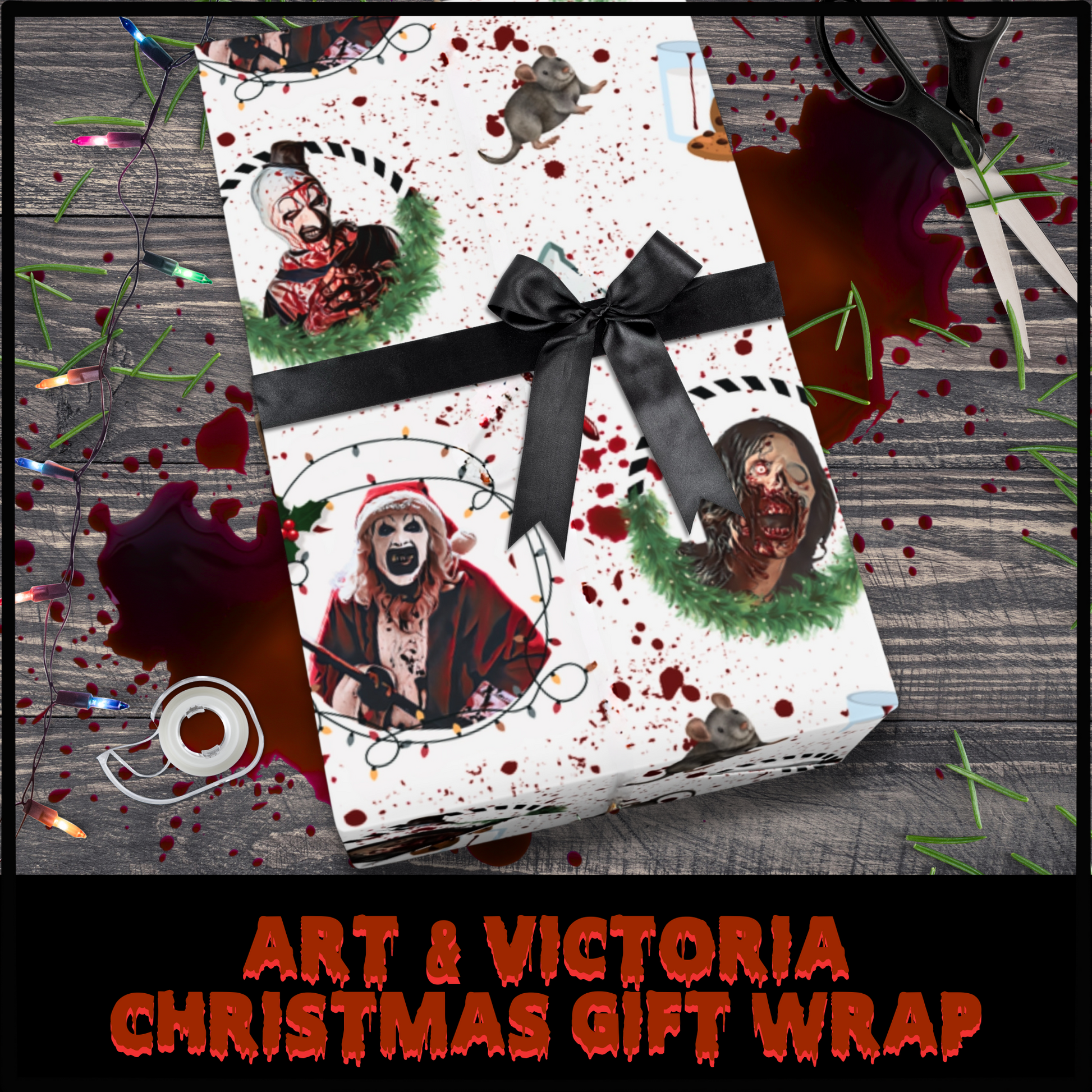 Our **Art & Victoria Christmas Gift Wrap** brings the loveable, yet horrifying killer clown, Art, and his disturbing sidekick, Victoria to your holiday festivities. Inspired by the latest Terrifier film, this wrap features gruesome details like bloody glass shards, filthy rats, etc.—all splattered with blood spatter across a crisp white background. It’s the perfect mix of holiday spirit and horror, adding a truly terrifying twist to any gift under the tree!