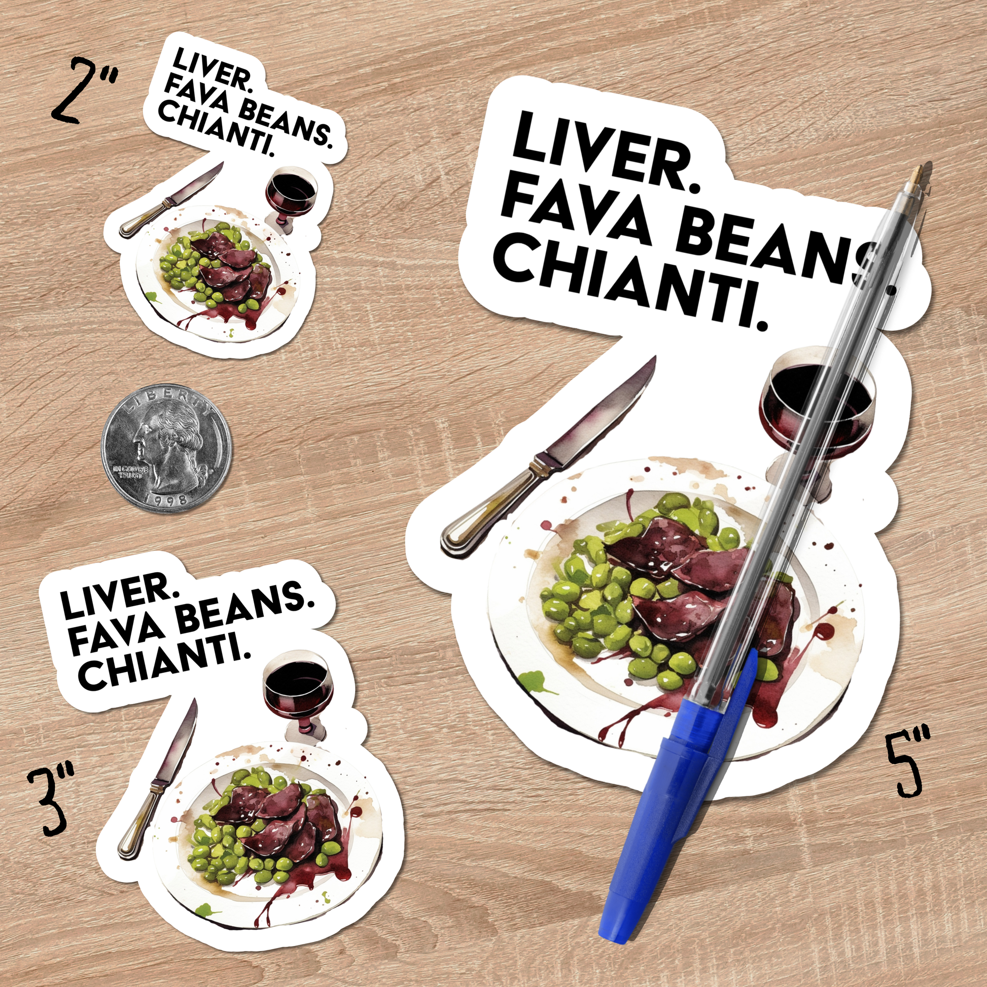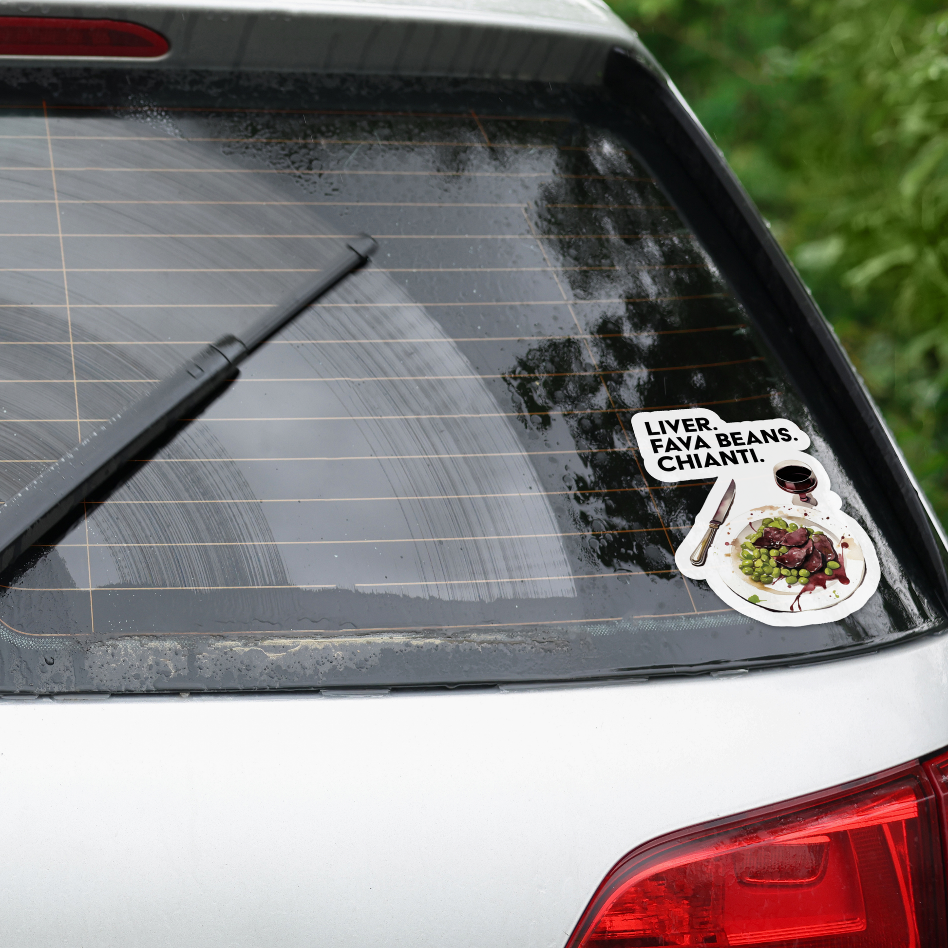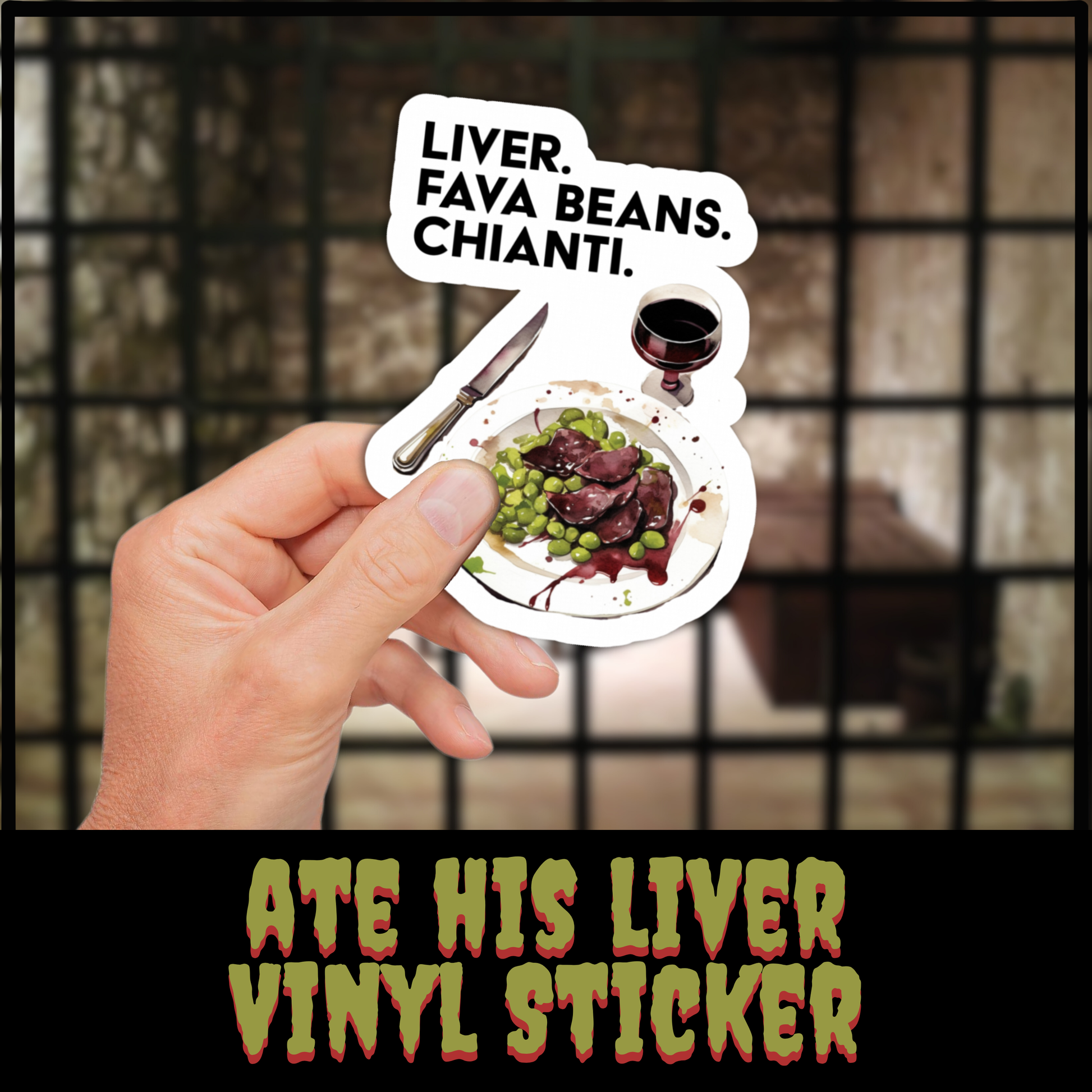 Introducing our *Ate His Liver* vinyl sticker – a subtle nod to one of cinema’s creepiest culinary moments. Only true fans of *Silence of the Lambs* will recognize the clever simplicity of this design: a plate with liver and fava beans, drenched in bloody-style gravy, and a glass of Chianti ready on the side. Bold text spells out the infamous line: "Liver. Fava Beans. Chianti."