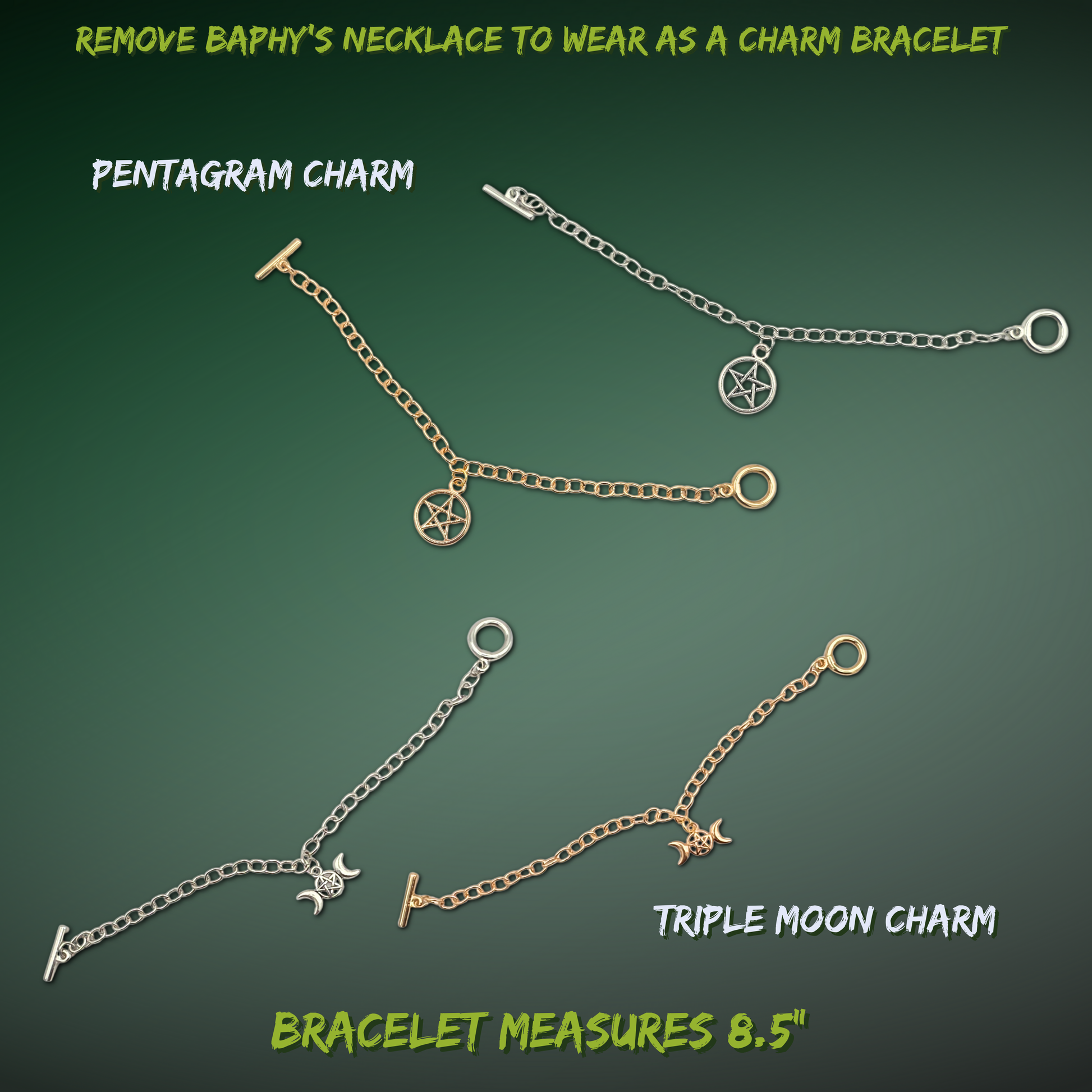 Meet Bad Baphy, our sinister little nickname for Baphomet, and he is every bit as baaaaad as he looks. This gothic black goat plushie clutches a plastic bloody heart in his mouth and wears a removable charm necklace that doubles as a wearable bracelet for you. His chain features a toggle closure for easy on and off, making it simple to leave it on Baphy as an accessory or remove it to wear as a statement charm bracelet. Choose between silver or gold finishes, with either a pentagram or triple moon charm to suit your personal style. Bad Baphy stands approximately 6 inches tall, 8 inches long, and 4 inches wide, making him the perfect size for altars, shelves, desks, or gothic décor displays. The bracelet measures approximately 8.5 inches and is designed for comfortable everyday wear. This piece makes an unforgettable gift for witches, occult lovers, gothic collectors, or anyone with a dark sense of humor. For a truly unique proposal or gift moment, the removable necklace can even hold an engagement ring for a witchy surprise. Designed and created by Sinister Studios AZ in Arizona, this plushie is equal parts creepy, playful, and collectible.