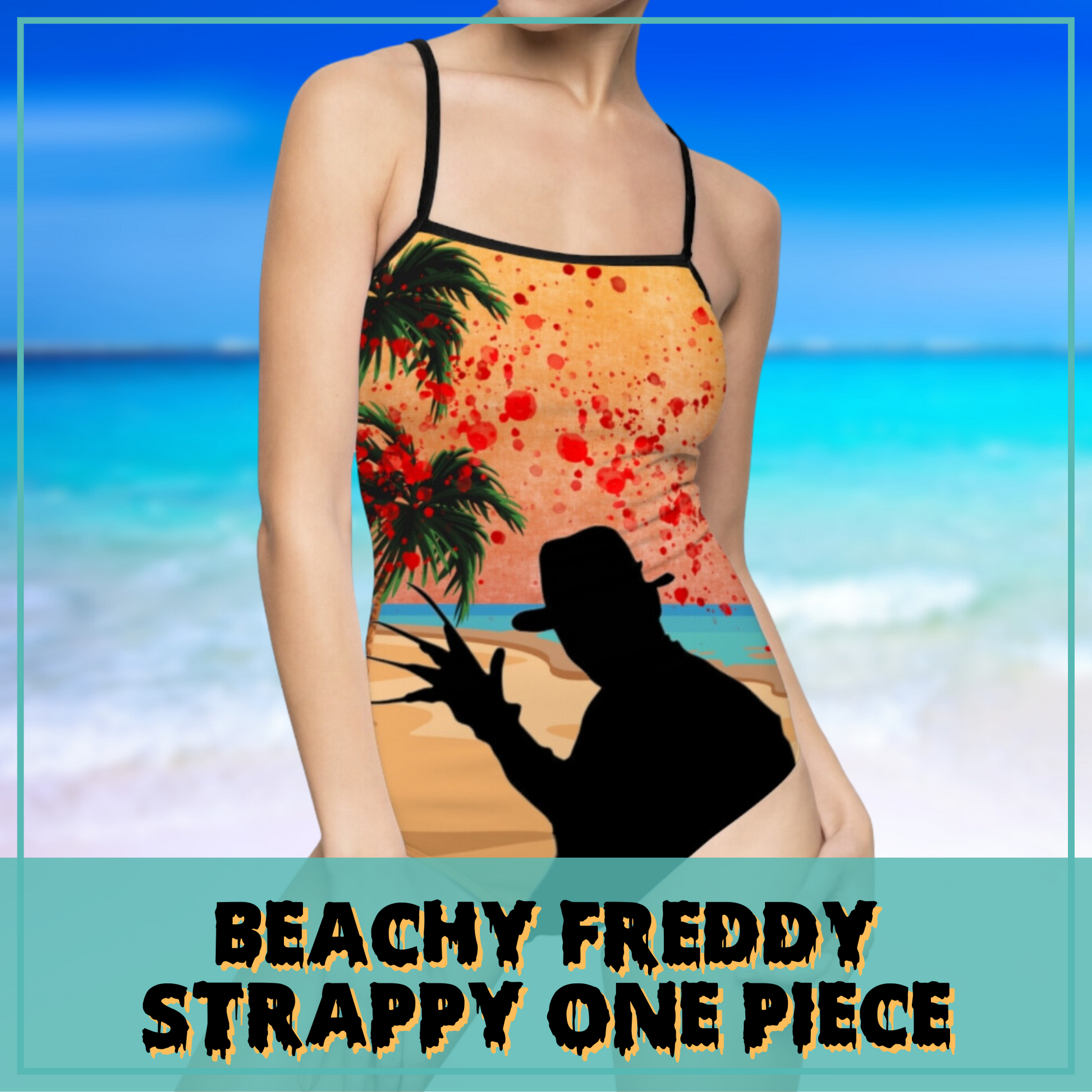 Dive into the sinister allure of our Beachy Freddy strappy one-piece swimsuit, showcasing the ominous silhouette of Freddy Krueger against a captivating beach sunset backdrop. A must-have for fans of Freddy and Nightmare on Elm Street, this swimsuit seamlessly captures your personal style.