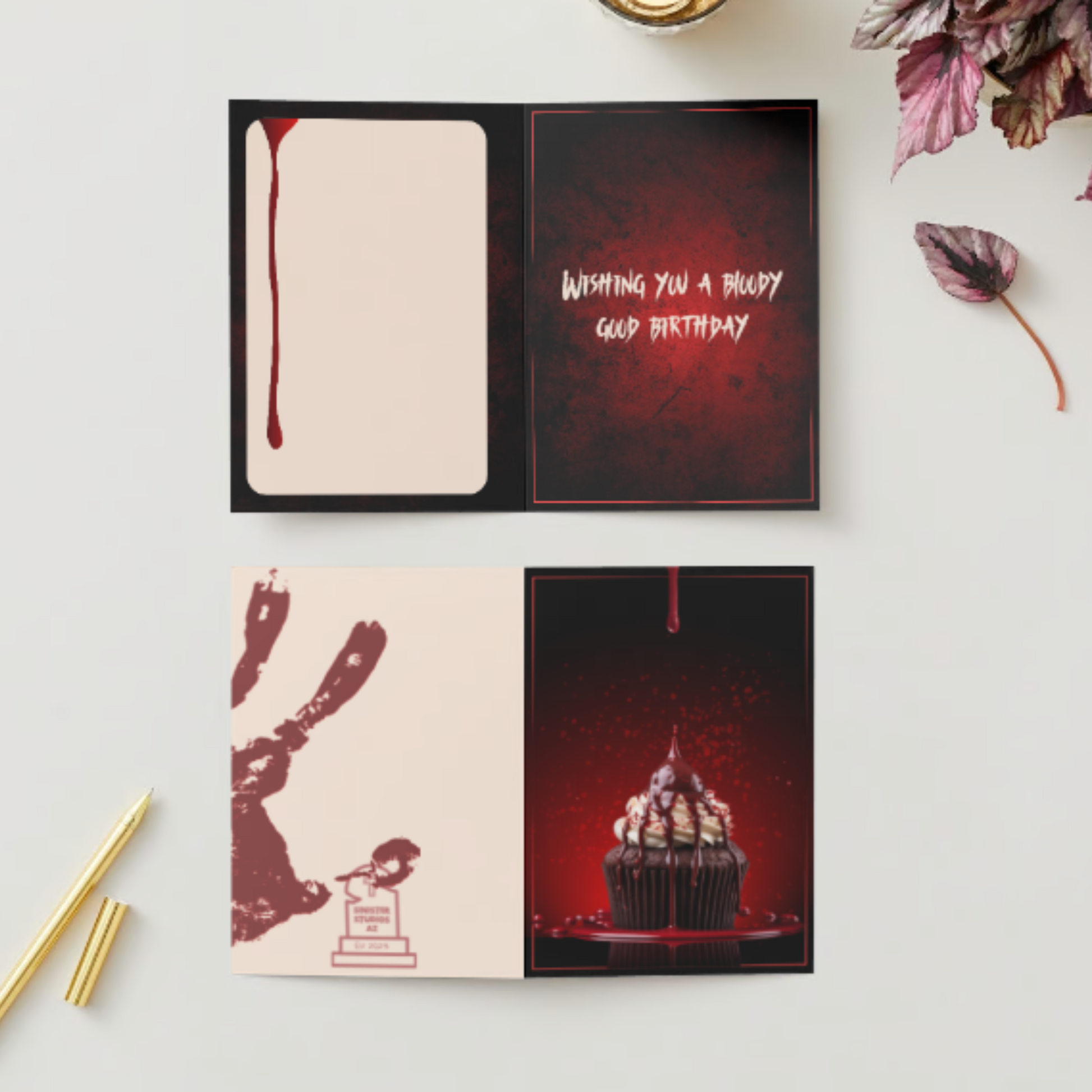 Our "Bloody Good Birthday" card features a decadent cupcake with a blood-like substance dripping onto it against a black and red background