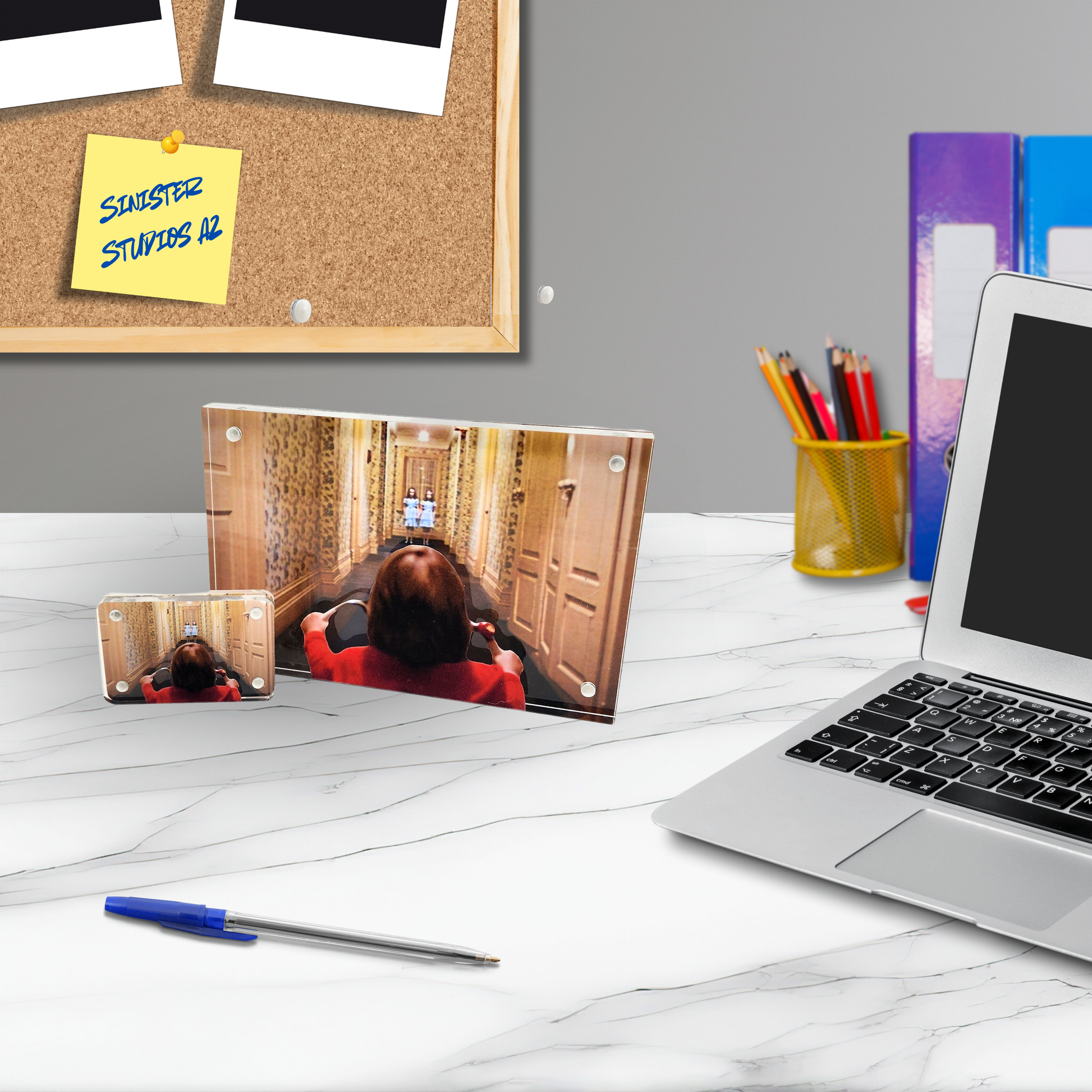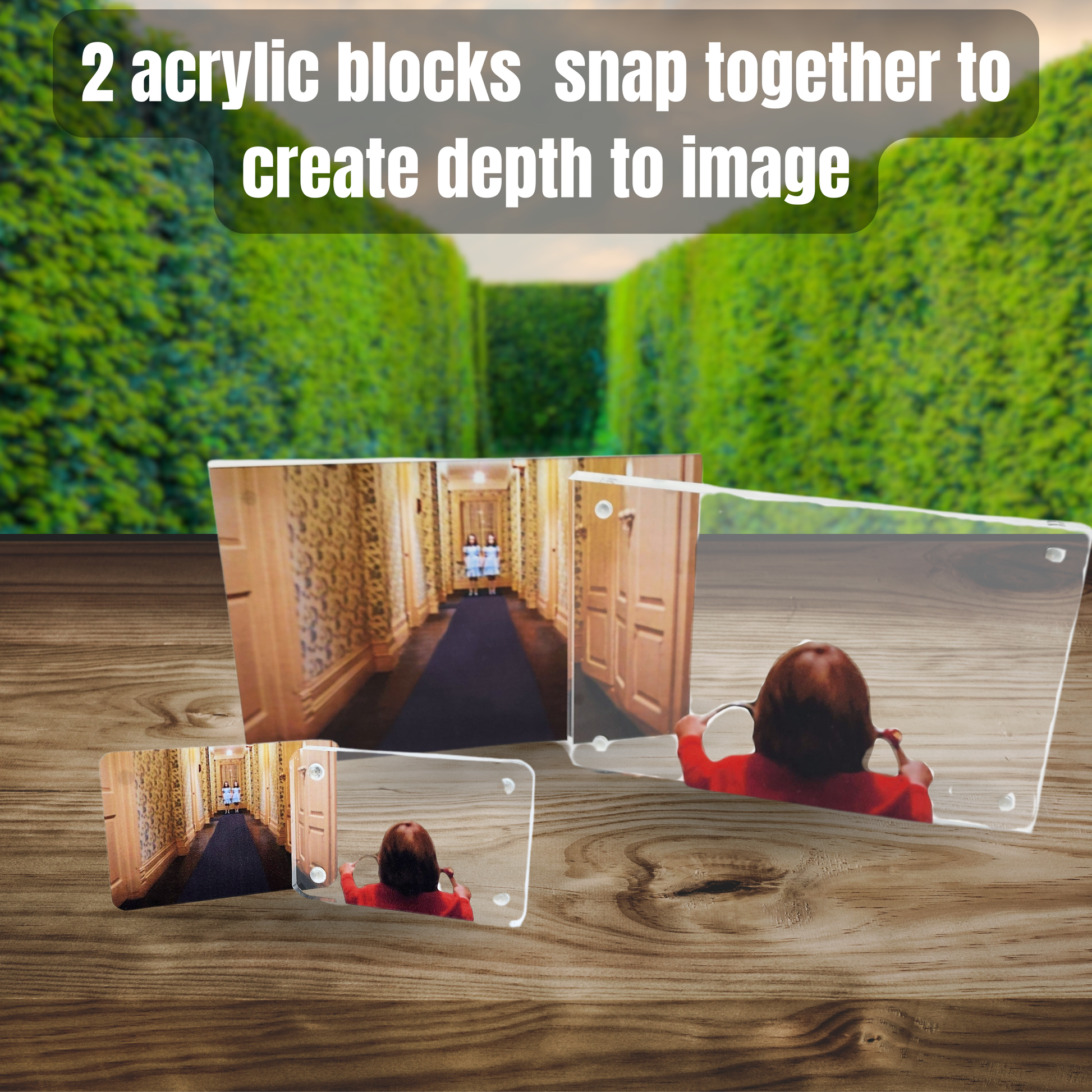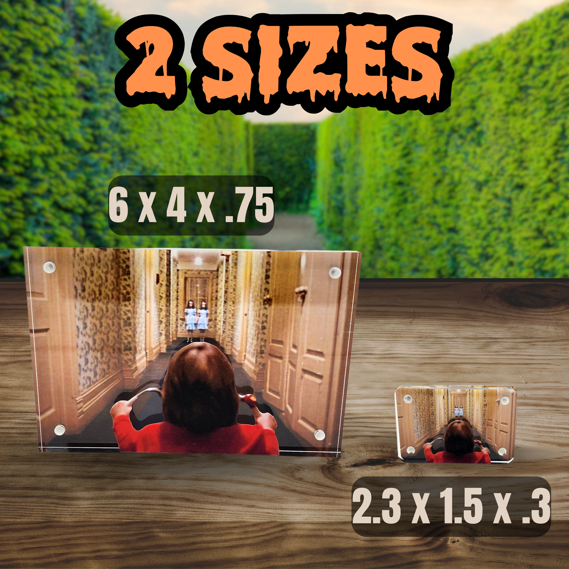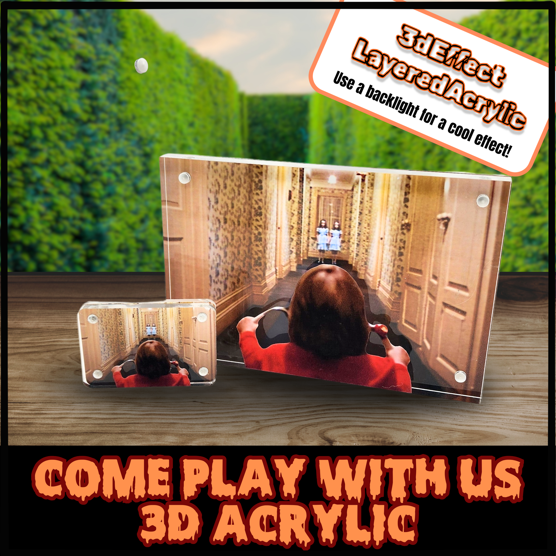 Step into the eerie world with our chilling 3D acrylic creation - an homage to the haunting scene of Danny and the twins from The Shining. This unique item consists of two acrylic blocks that effortlessly click together, thanks to discreet magnets. One block captures the Grady twins in the ominous hallway, while the other showcases the image of Danny on his tricycle. When combined, the blocks create a captivating 3D depth, bringing the scene to life.