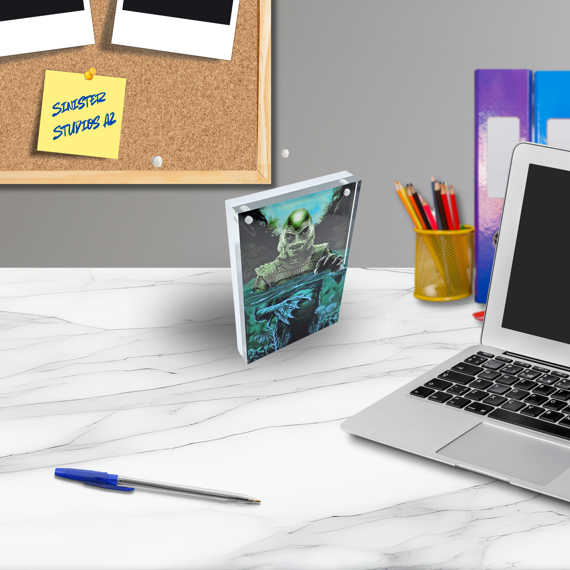 The acrylic measures approximately 4 inches wide by 6 inches tall and .75 inches thick inside the frame. It stands on its own on a desk, shelf, horror display case, or spooky office setup.