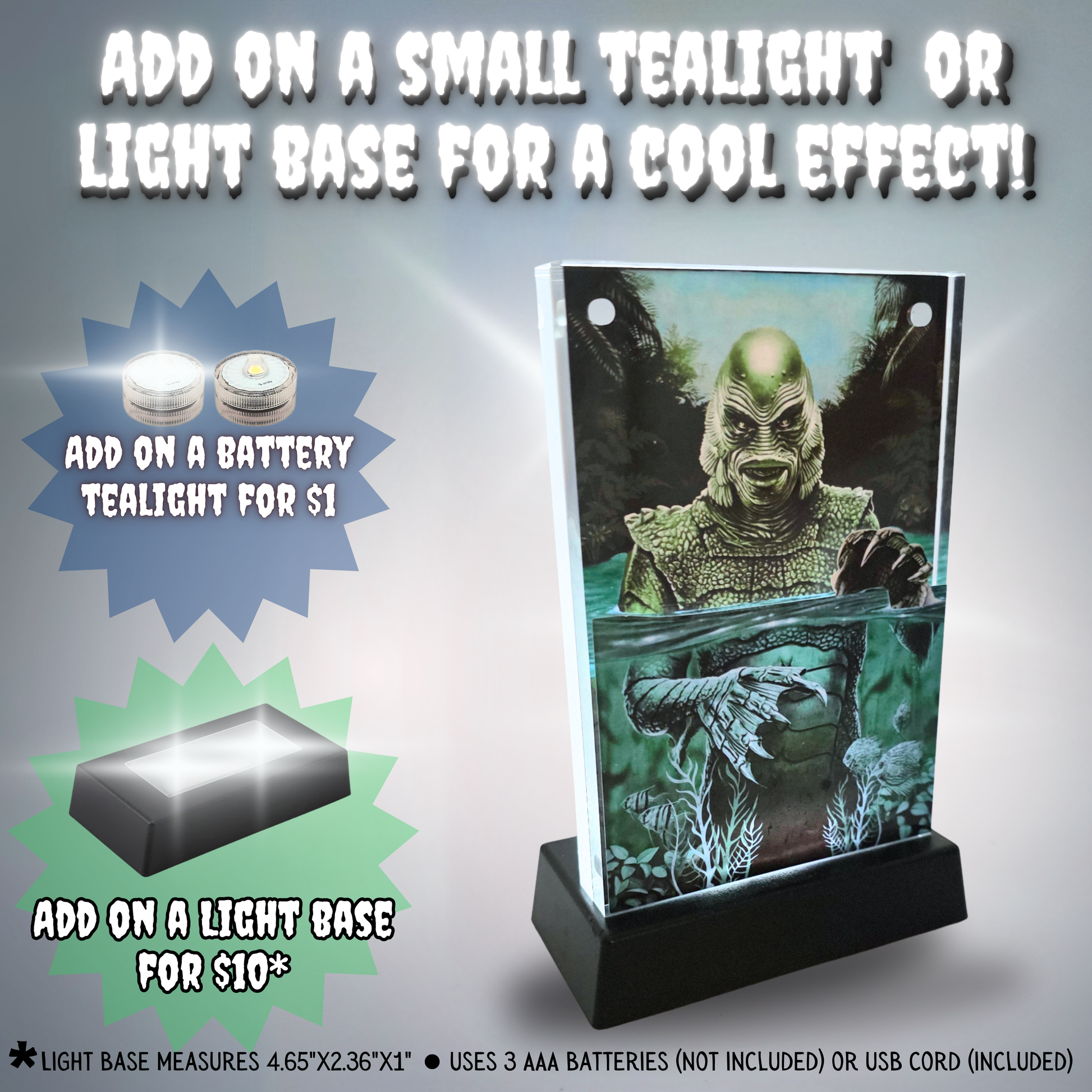 For maximum visual impact, you can upgrade with an optional RGB LED light base. The base measures approximately 4.65” x 2.36” x 1” and operates with either 3 AAA batteries (not included) or the included USB cord. When backlit, the greens intensify and the underwater tones glow dramatically, making this piece especially striking in darker settings.