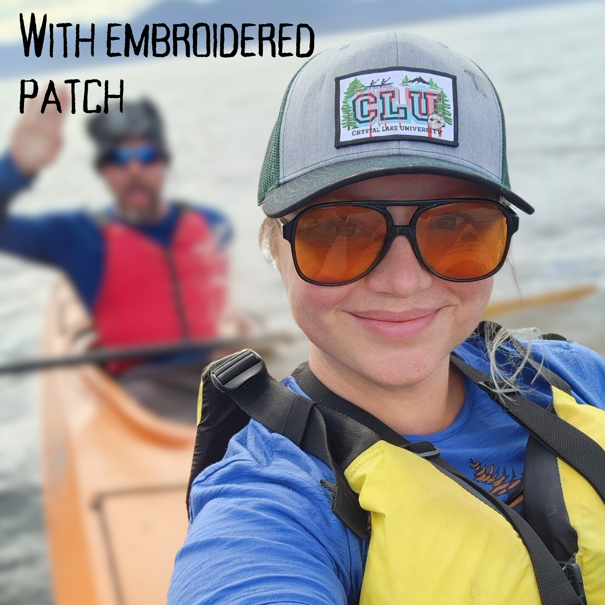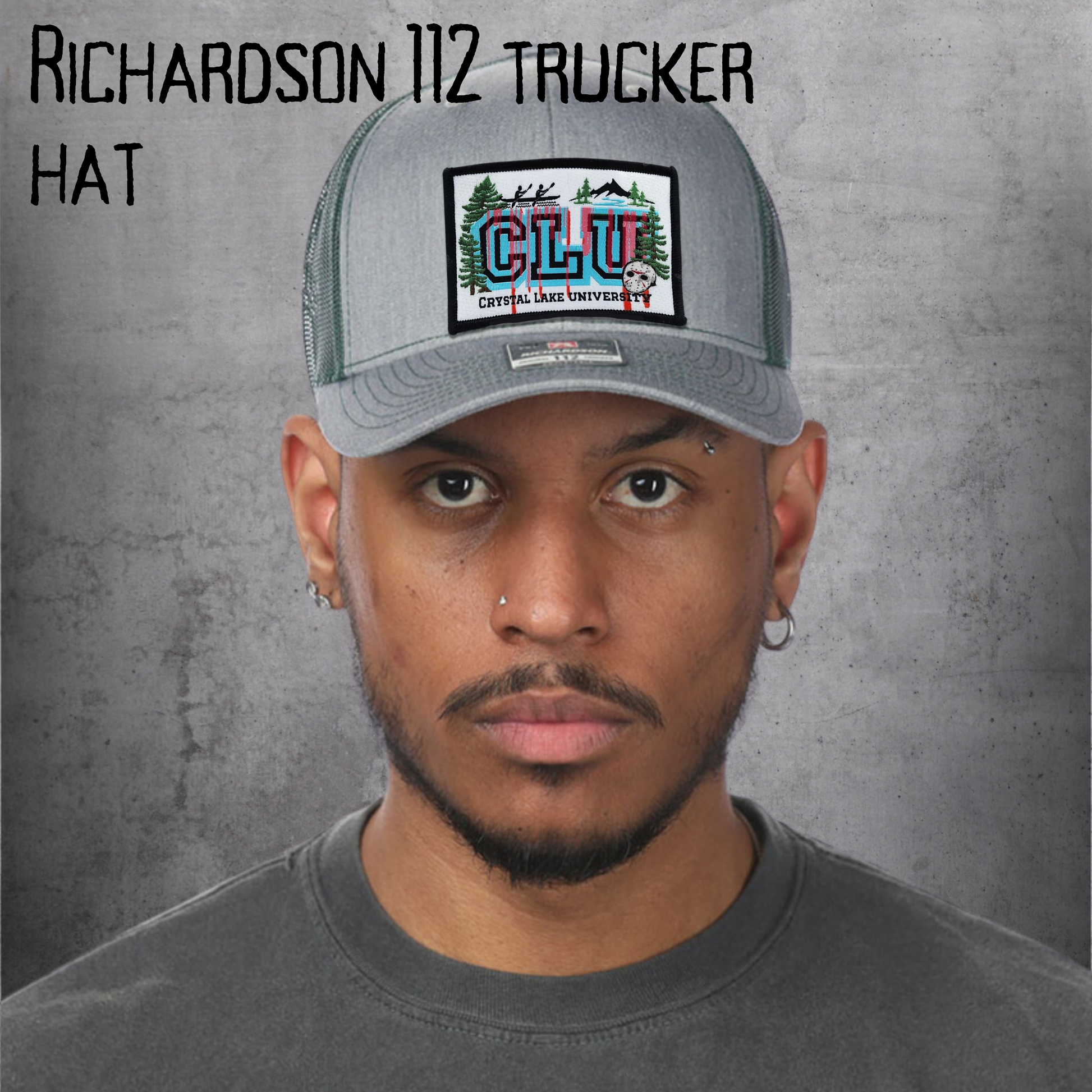 This design features our original embroidered patch on the ever-popular Richardson 112 Trucker Hat. CLU (Crystal Lake University) is stitched in bold blue and black, with a lake scene that includes kayakers, pine trees, and, of course, Jason’s iconic hockey mask complete with blood drips. Below, “Crystal Lake University” is embroidered in black, bringing the whole horror vibe together.