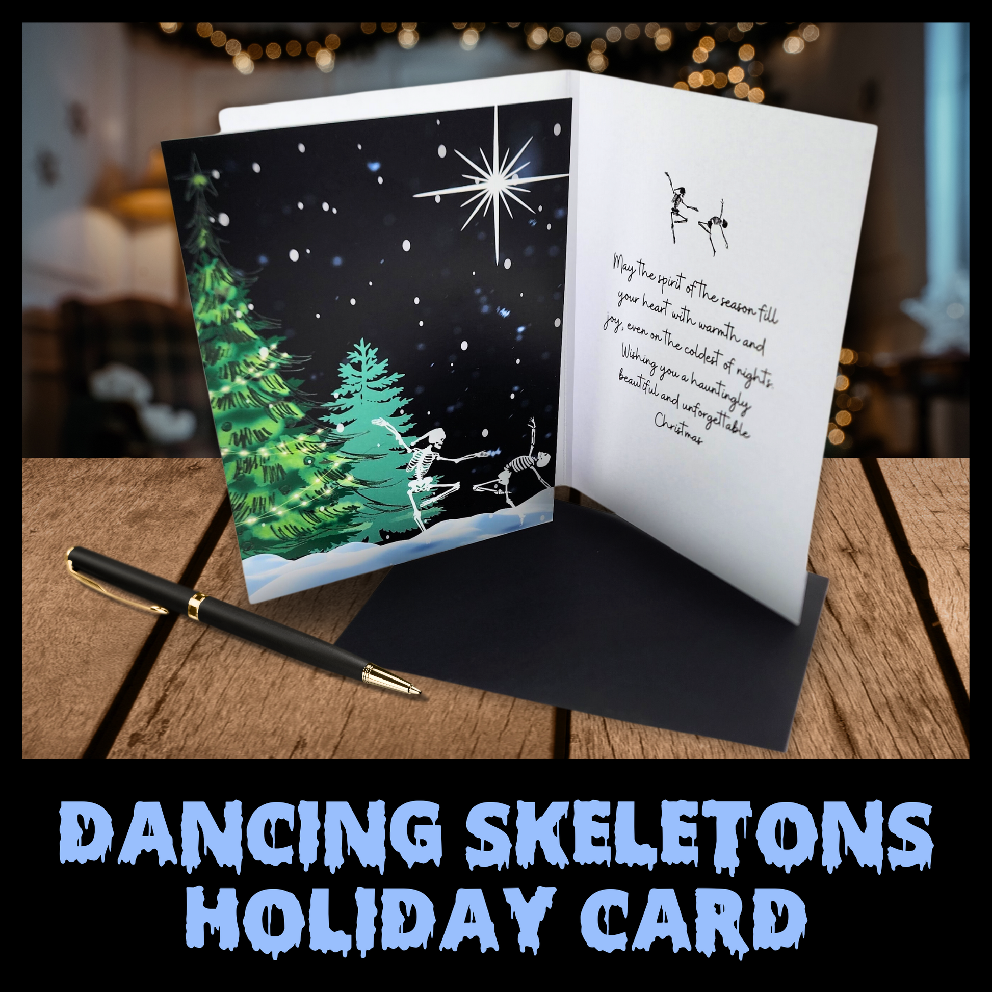 This holiday card from Sinister Studios AZ features a snowy, nighttime forest scene with skeletons dancing joyfully under a starry sky. Snowflakes drift down gently, and pine trees are decorated with glowing lights, adding a festive yet spooky touch. Perfect for anyone who loves a blend of holiday cheer and gothic charm, this card brings a unique twist to seasonal greetings. Each card includes a black envelope and matching sticker, making it ideal for sharing a hauntingly merry Christmas spirit.
