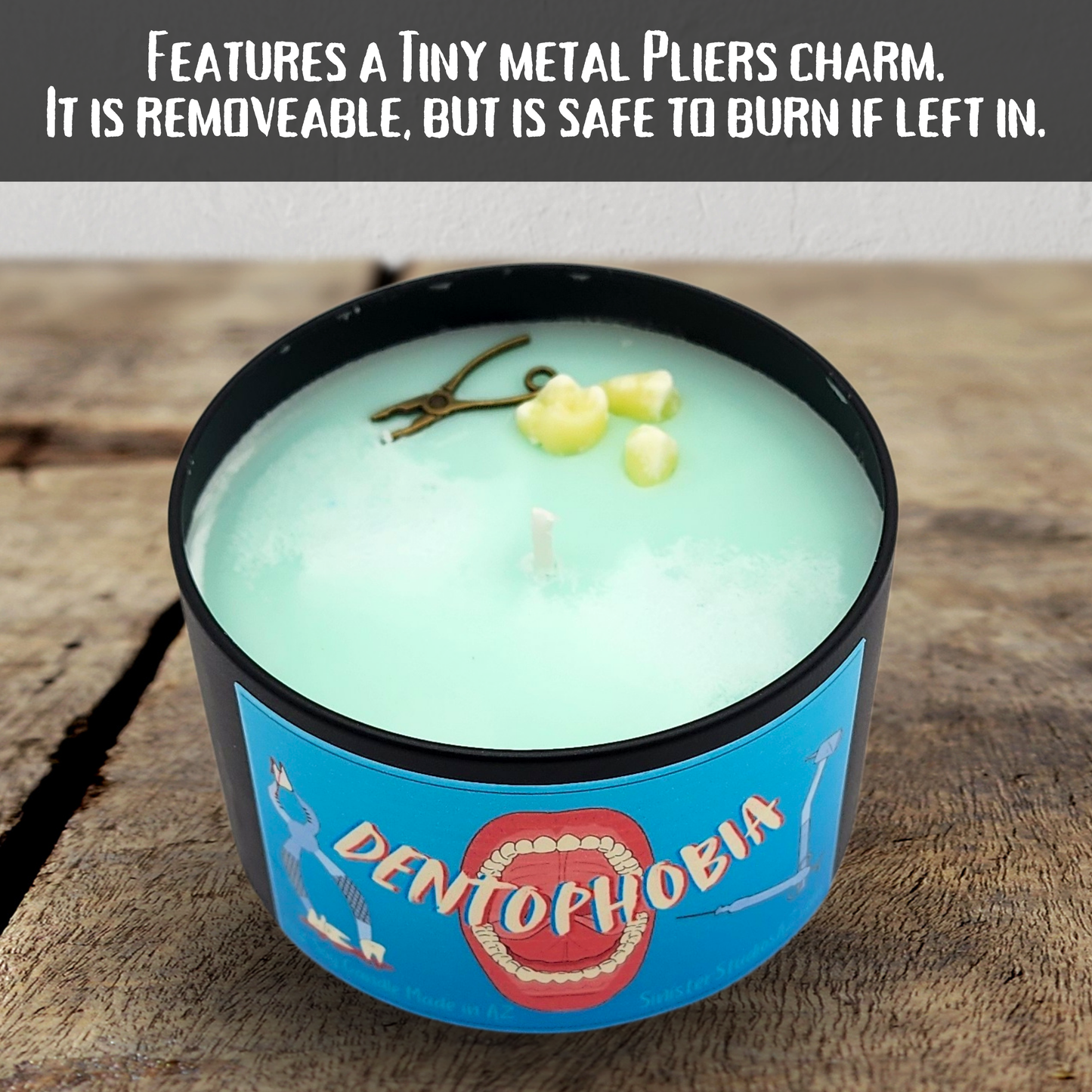 Nestled atop the minty green wax, you’ll find a few freshly “pulled” wax teeth, along with a metal charm—a pair of pliers or a drill (which one you receive depends on our inventory, so brace yourself).