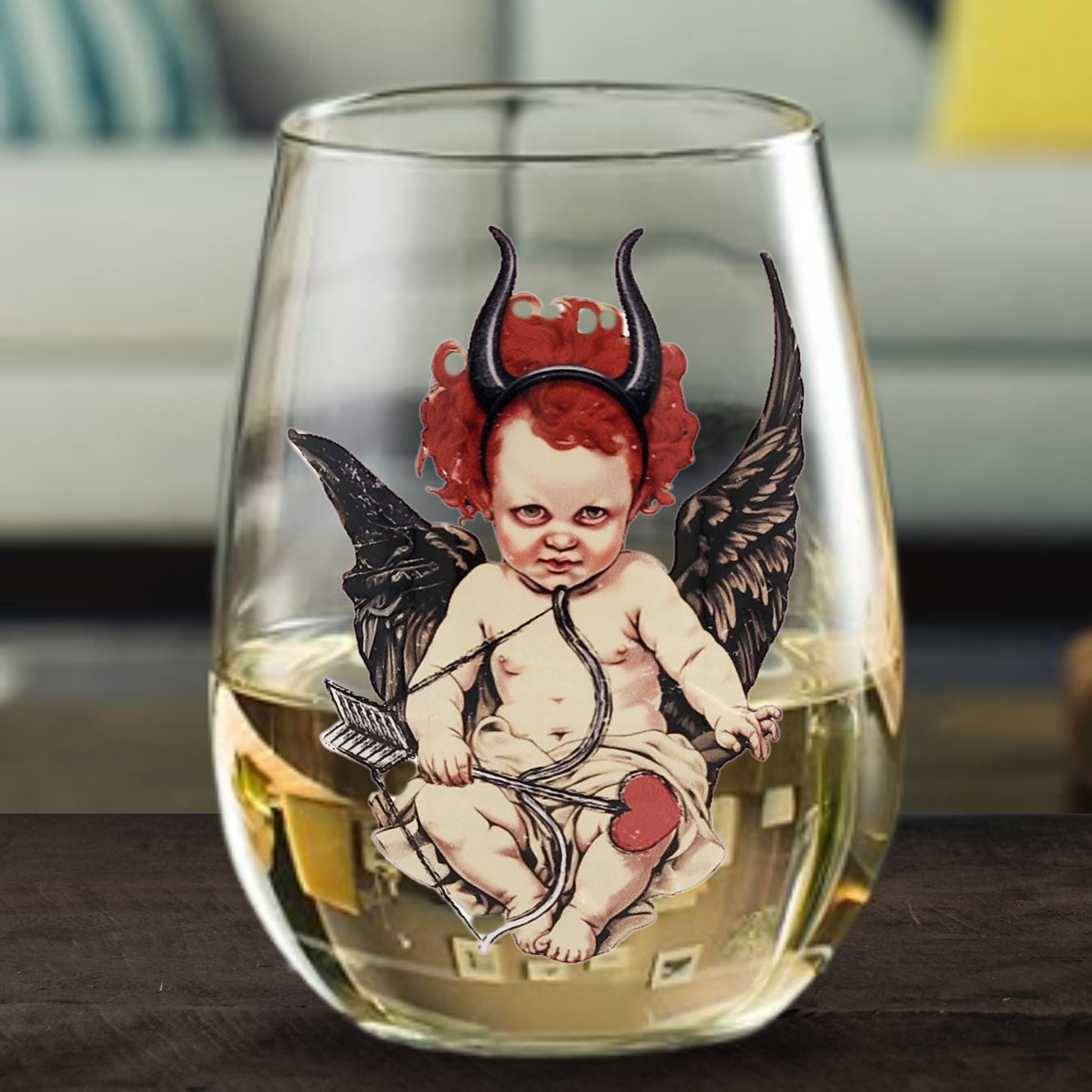 Our original design, the Evil Cupid Stemless Wine Glass, adds the perfect touch of mischevious charm to your table.