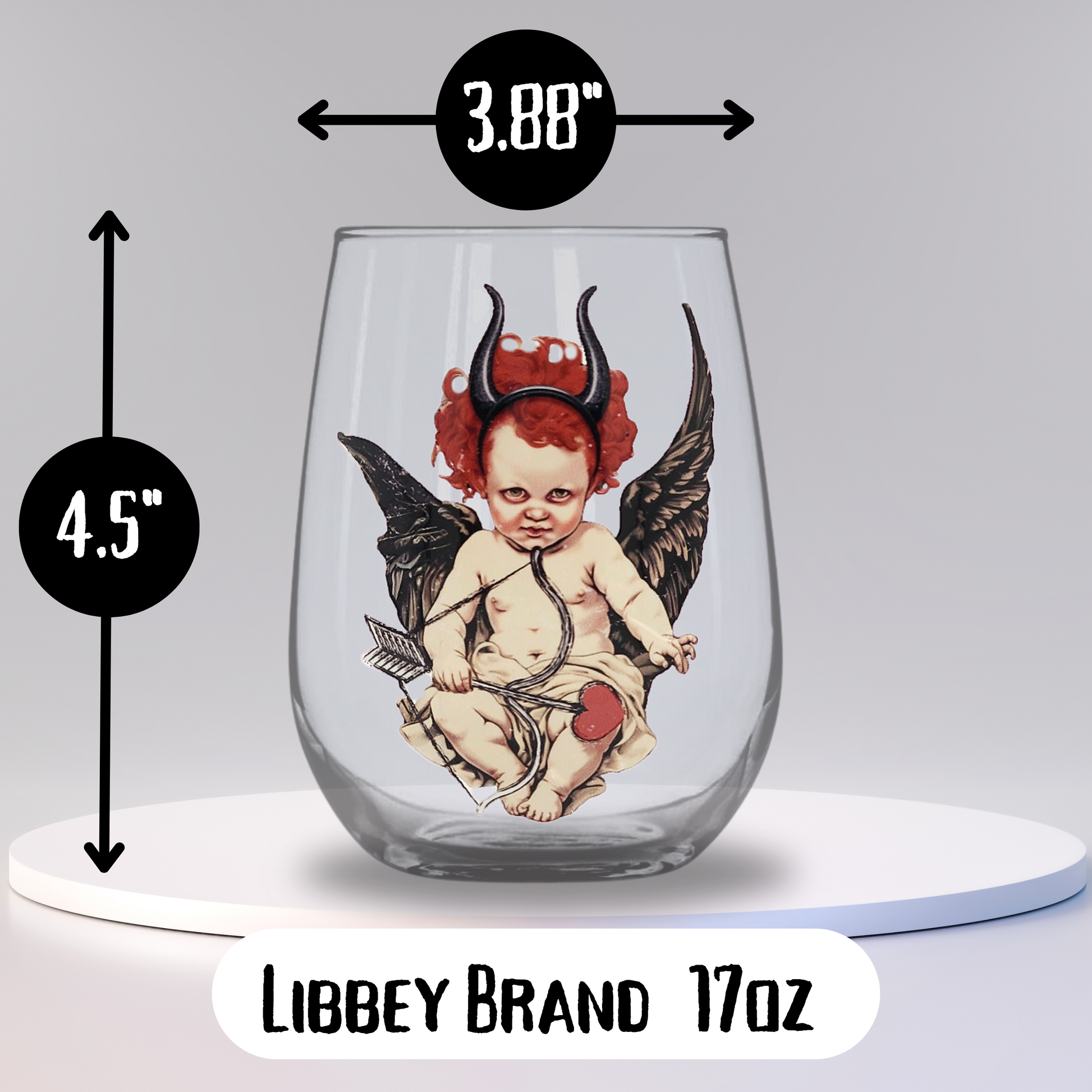 Evil Cupid Stemless Wine Glass – 17oz Libbey Glass with Dark Gothic Valentine Horror Design, Perfect for Spooky Drinkware Lovers