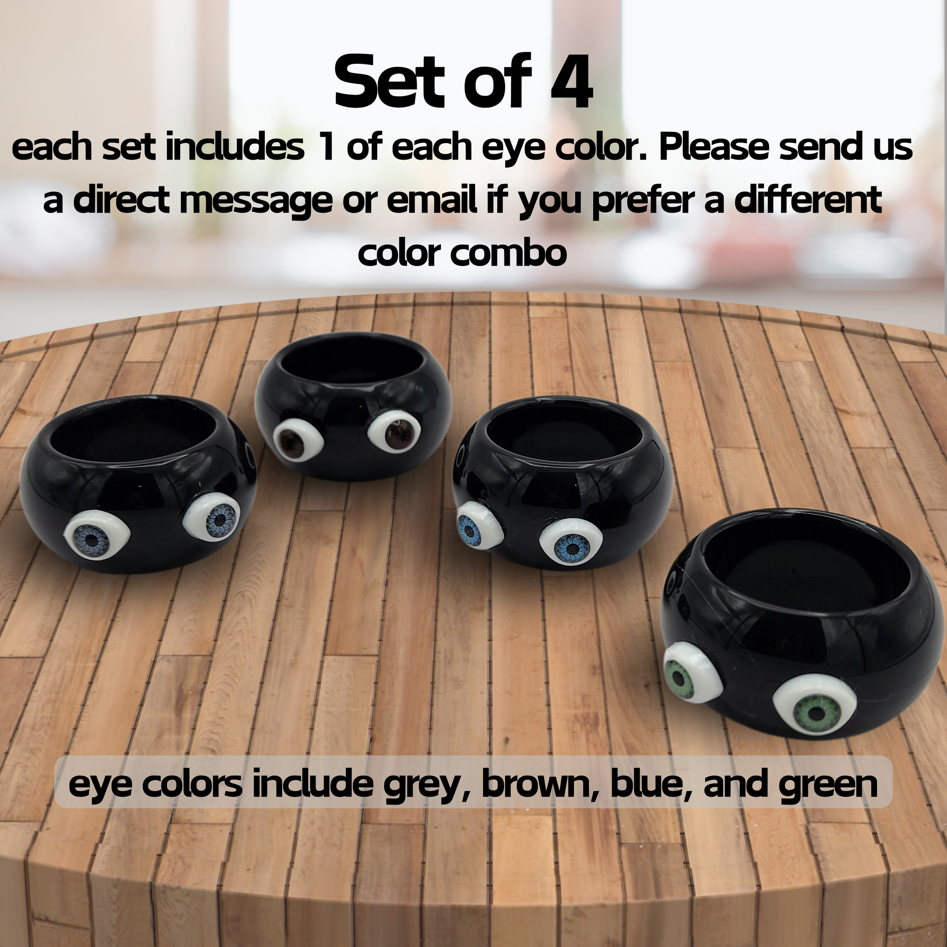 Spooky eyes staring back at you at the table? YES, please! Our "EYE See You" napkin ring set is the perfect touch of eerie elegance for your next gathering. This set includes 4 napkin rings, each featuring a pair of realistic eyes. Made from premium quality acrylic with a glossy black finish, they measure 1.5" in diameter inside and 2.5" outside (with the eyes adding an extra .25").
