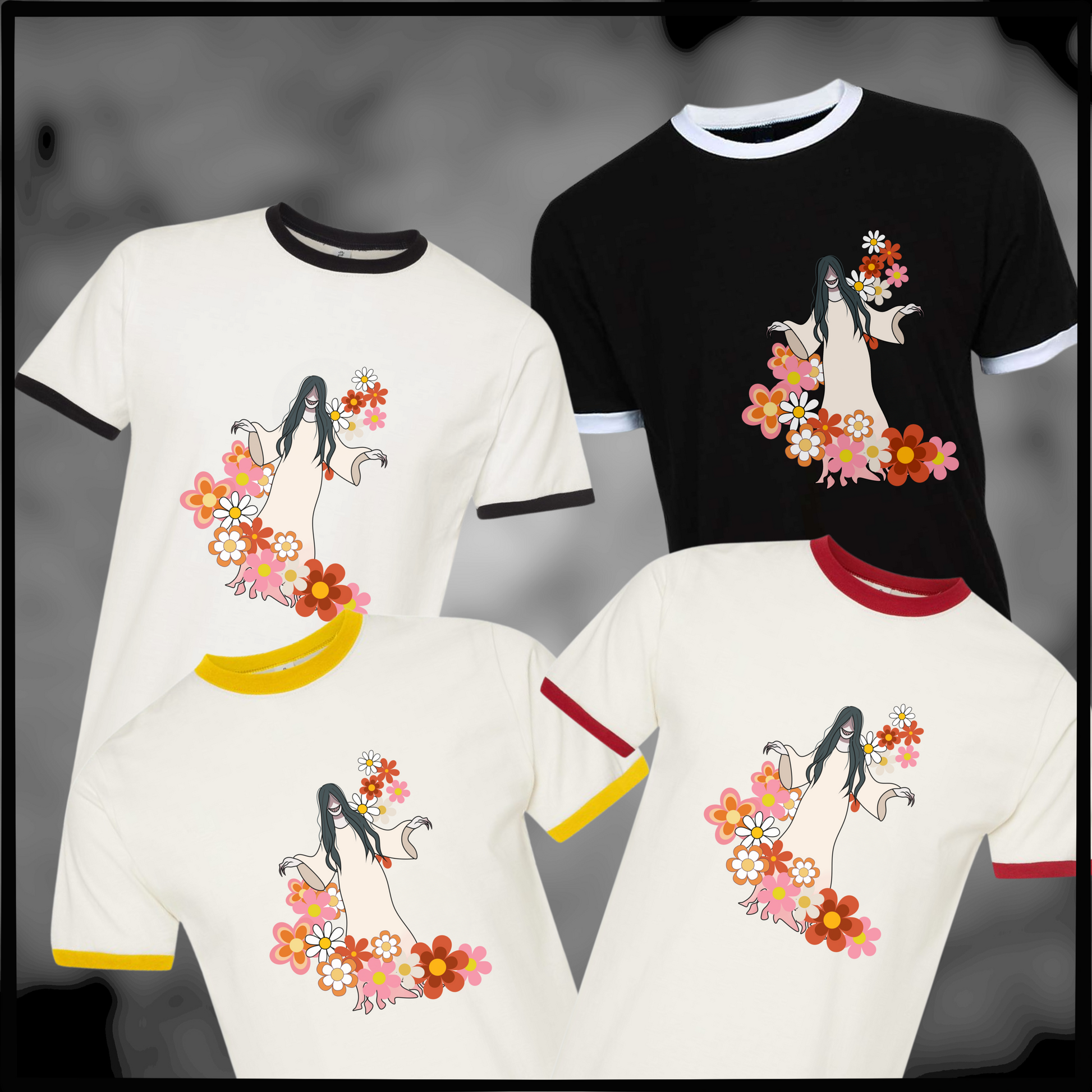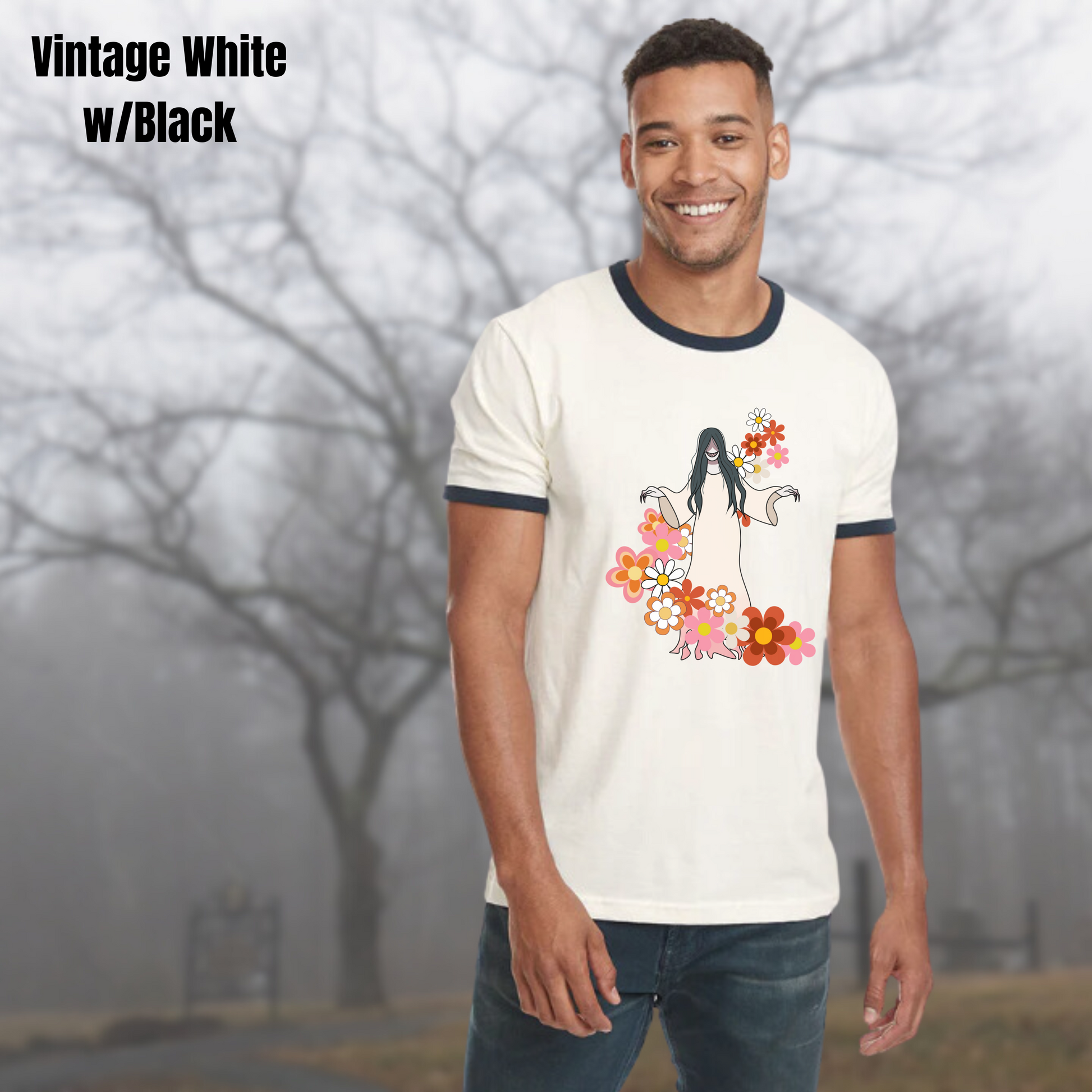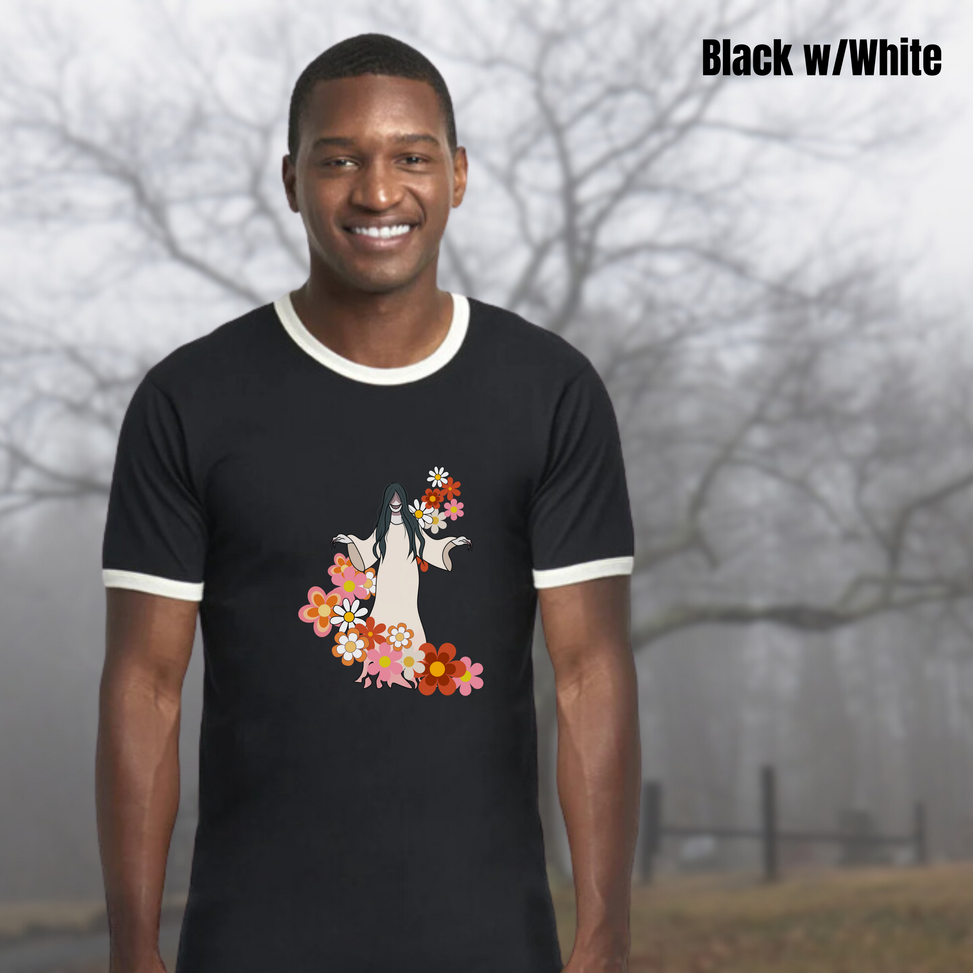 Groovy and creepy, this tee embodies a hauntingly unique aesthetic that's bound to turn heads. Featuring a mysterious ghoulish creature, adorned with long, stringy hair and a chilling absence of a face, except for those menacingly sharp teeth. Wrapped in a long, flowing cloak, she emerges from the shadows, surrounded by an array of retro flowers.