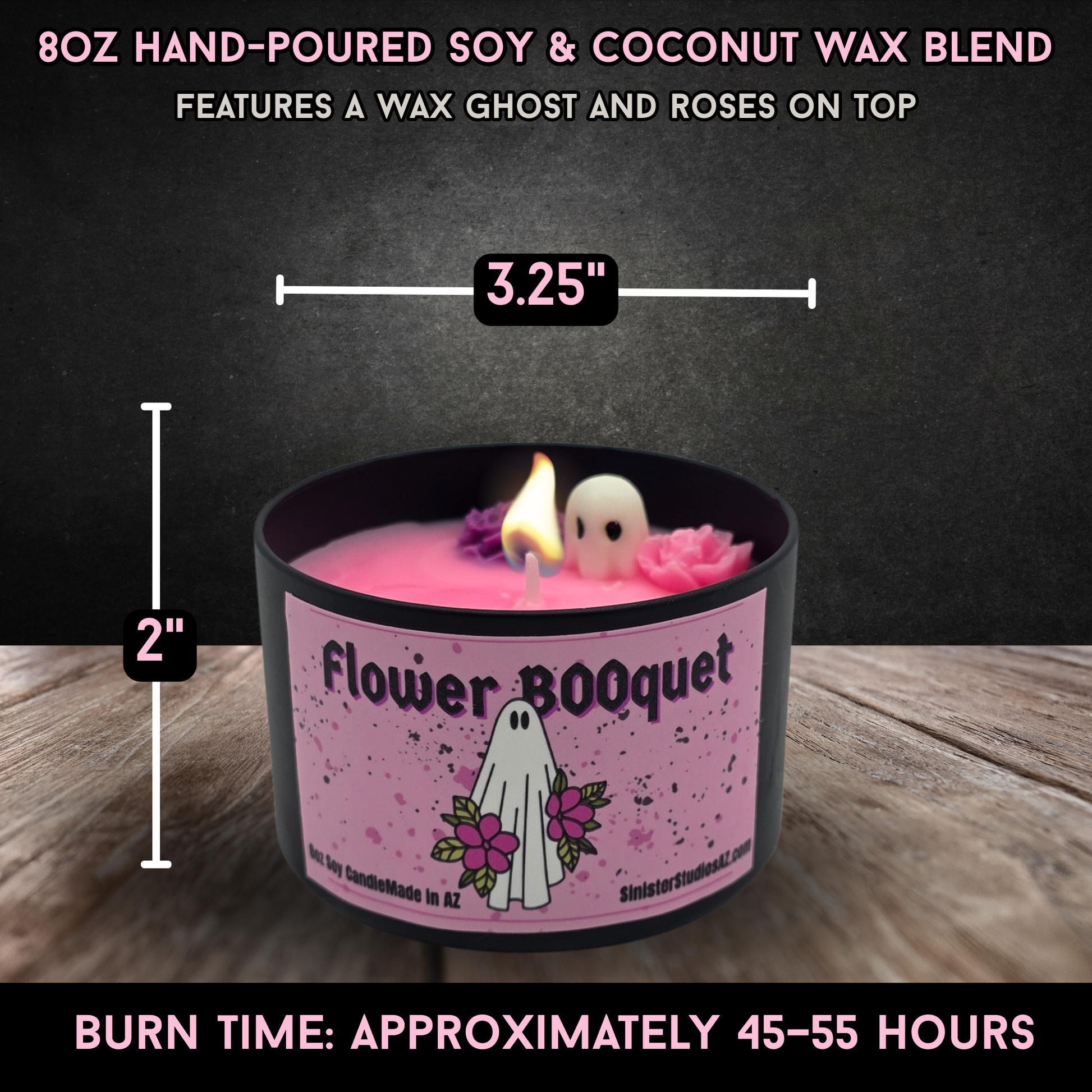 The candle is hand-poured using a premium soy and coconut wax blend, offering a clean, even burn and excellent scent throw. Housed in a matte black tin with our exclusive Flower BOOquet artwork, it fits beautifully into gothic, horror, or alternative home décor styles. Burn time is approximately 45–55 hours, making it both decorative and functional.