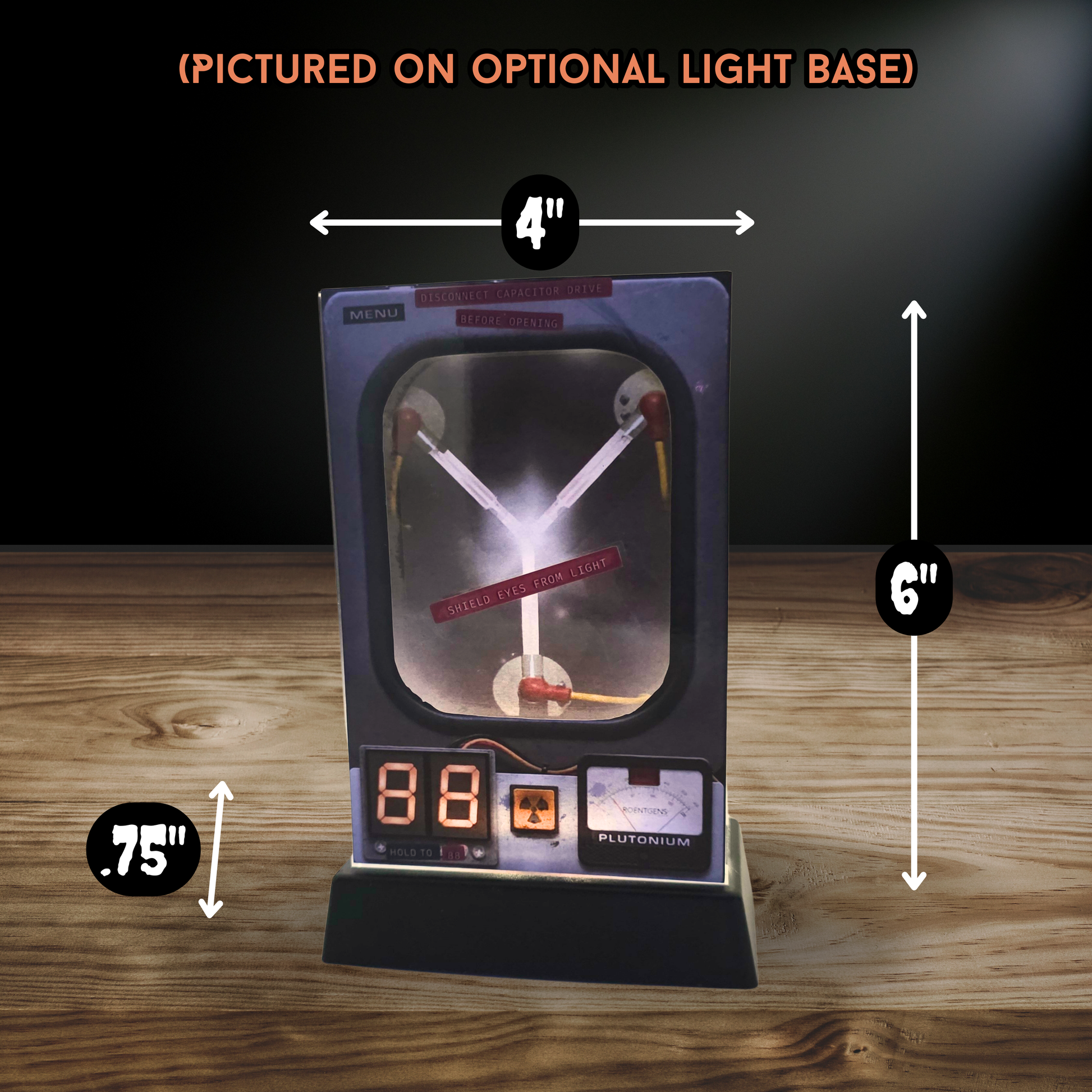 The layered construction creates a dimensional, shadowed 3D effect that shifts with lighting and viewing angle. When paired with the optional light base, the center of the flux capacitor appears to glow, enhancing the illusion and giving the piece a dramatic, futuristic presence.