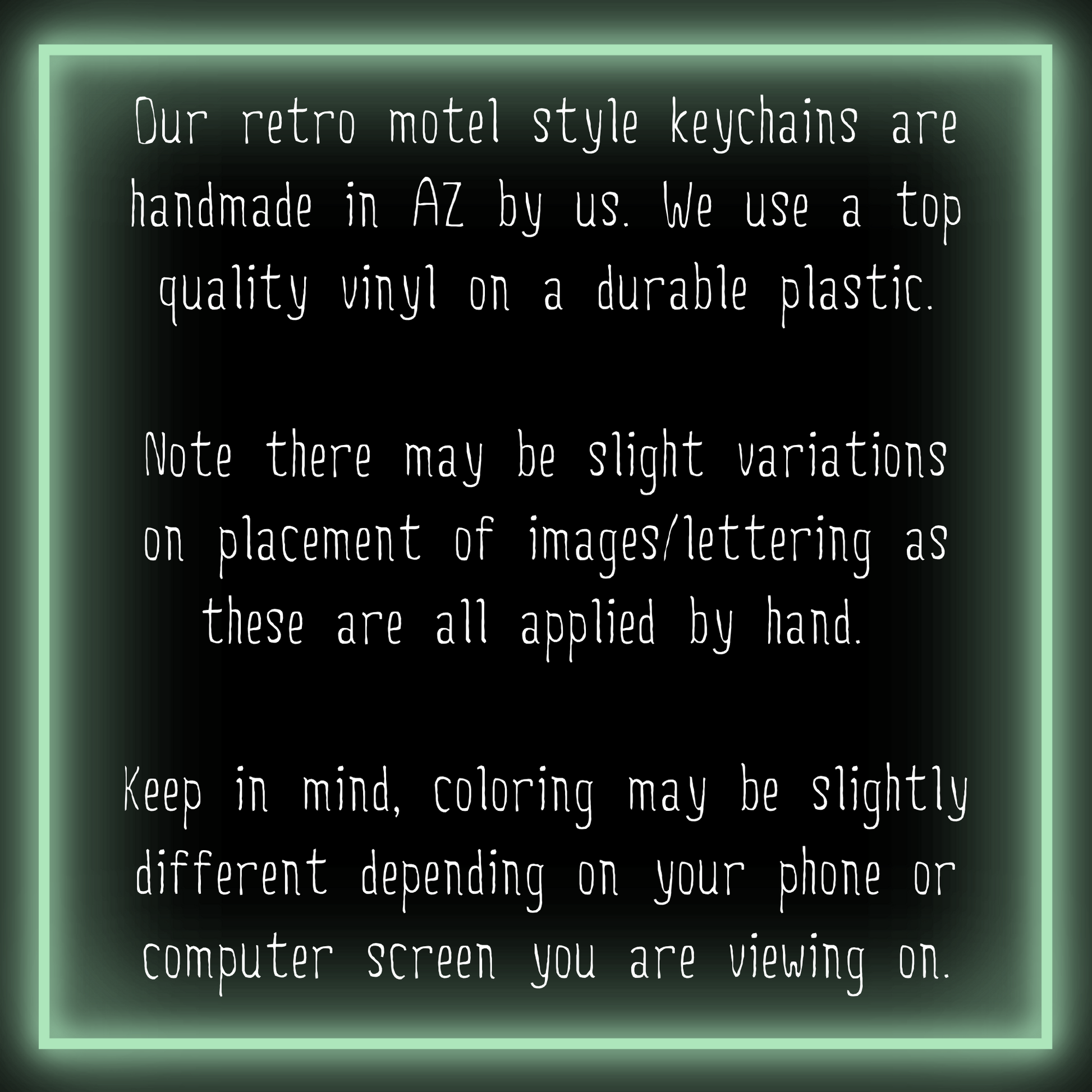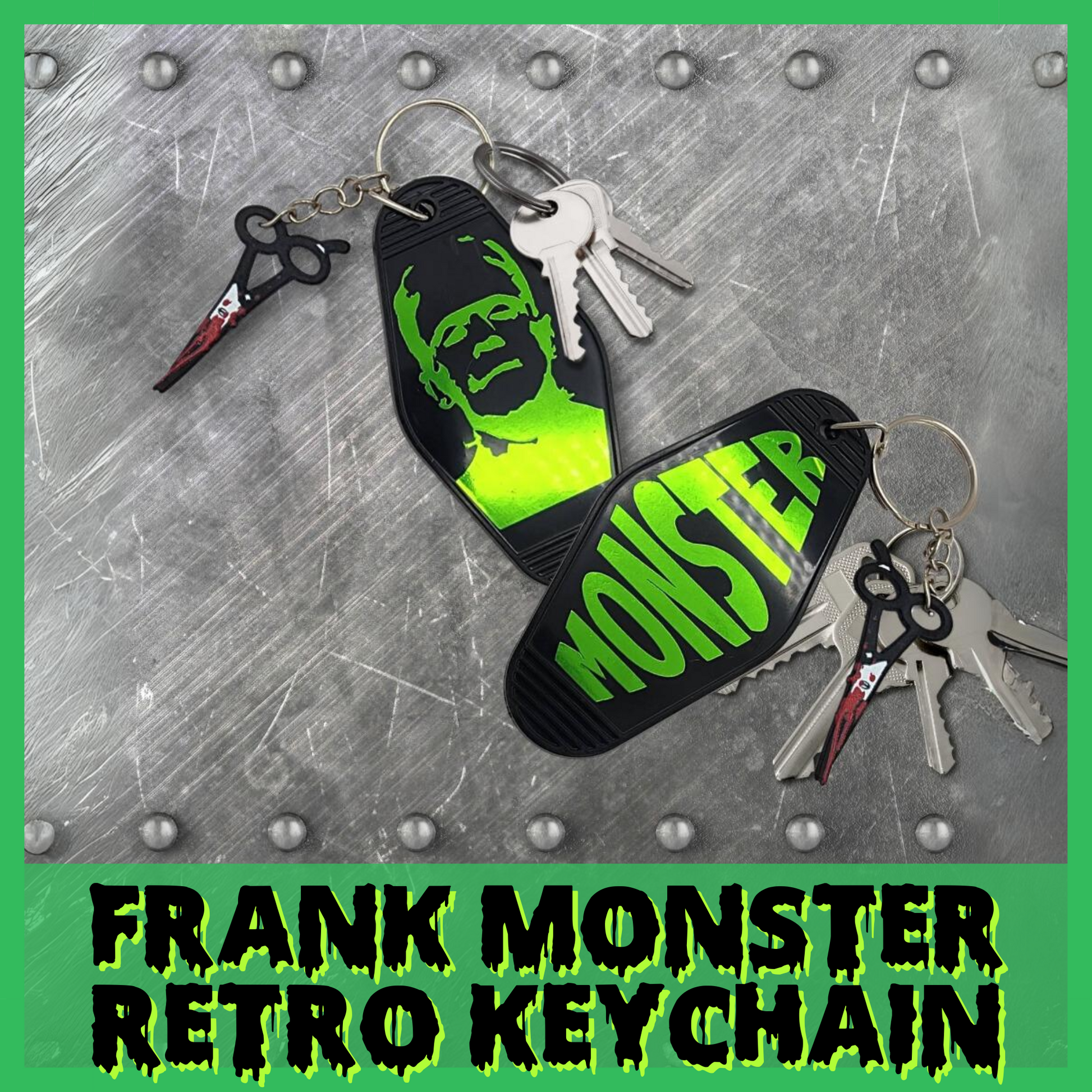 Check out our throwback motel keychain spotlighting the iconic monster, Frankenstein, captured in a stunning green metallic vinyl. One side showcases Frank, while the flip side boldly sports the word "Monster."