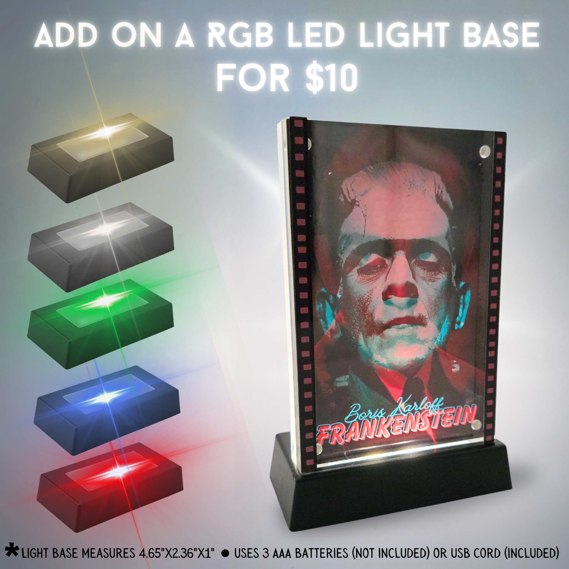 The optional light base measures approximately 4.65” x 2.36” x 1” and operates using either 3 AAA batteries (not included) or the included USB cord. Different light colors intensify different aspects of the artwork, allowing you to shift between the Monster and the Karloff reveal.