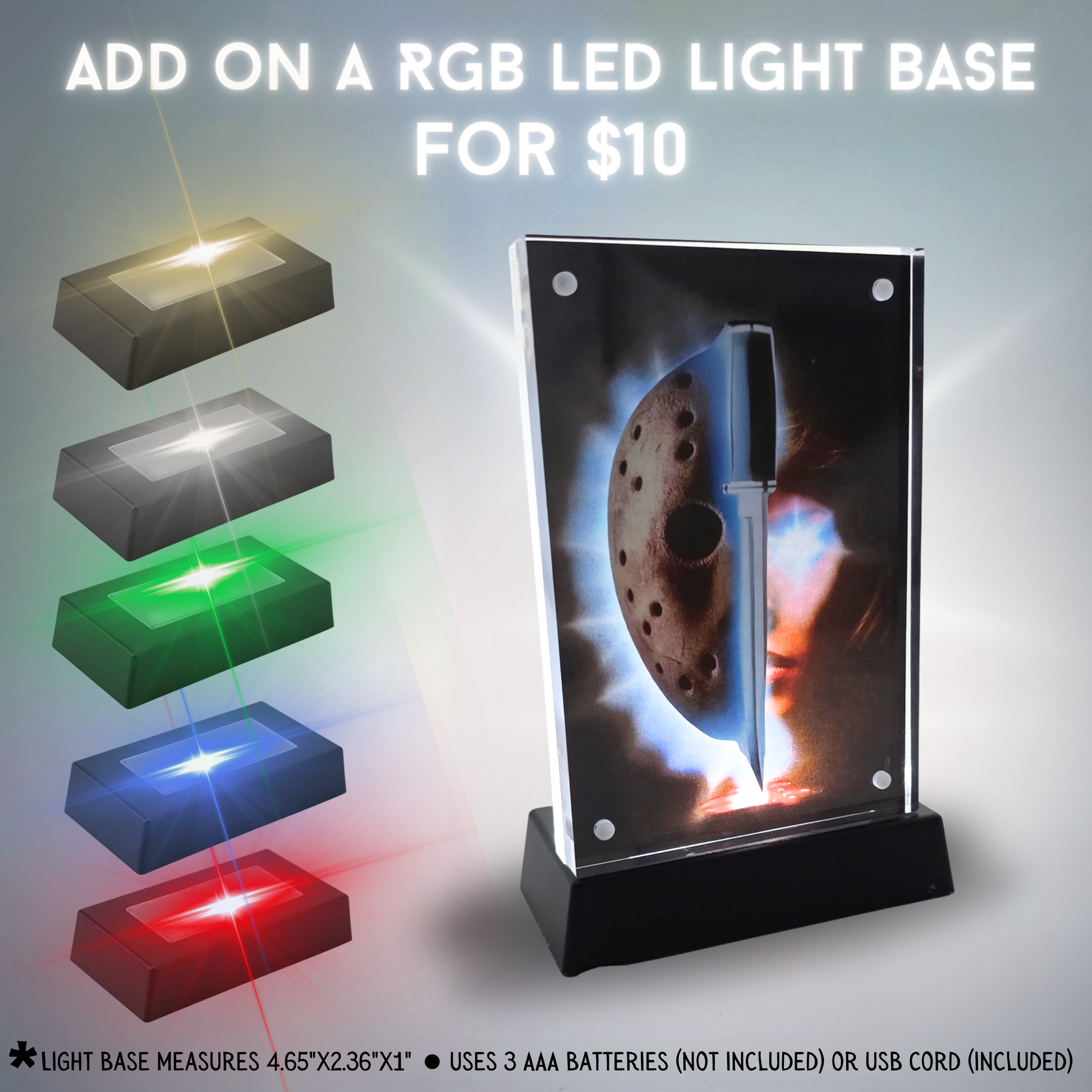 This piece is built for serious collectors and convention-goers, combining bold horror imagery with a layered acrylic construction that creates a striking 3D visual effect, especially when paired with backlighting or the optional RGB LED base.