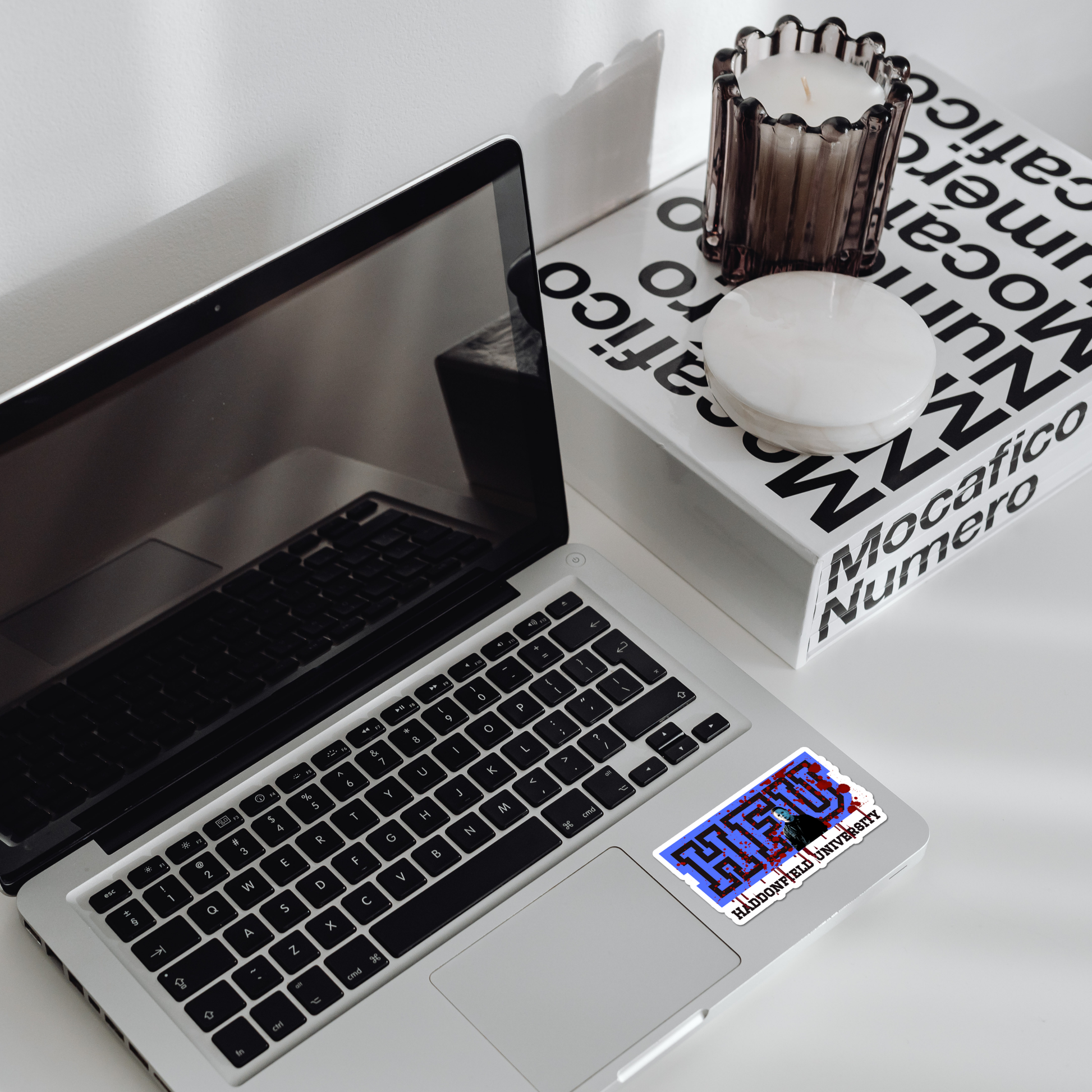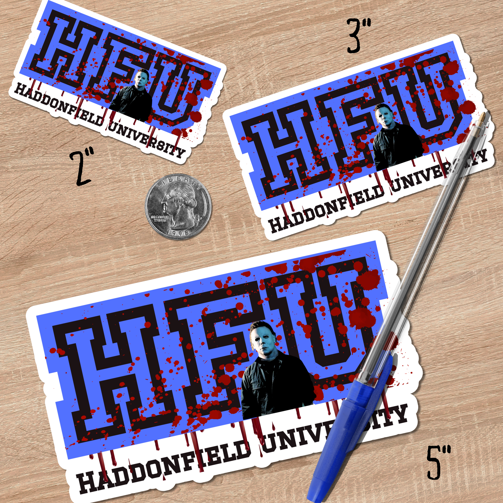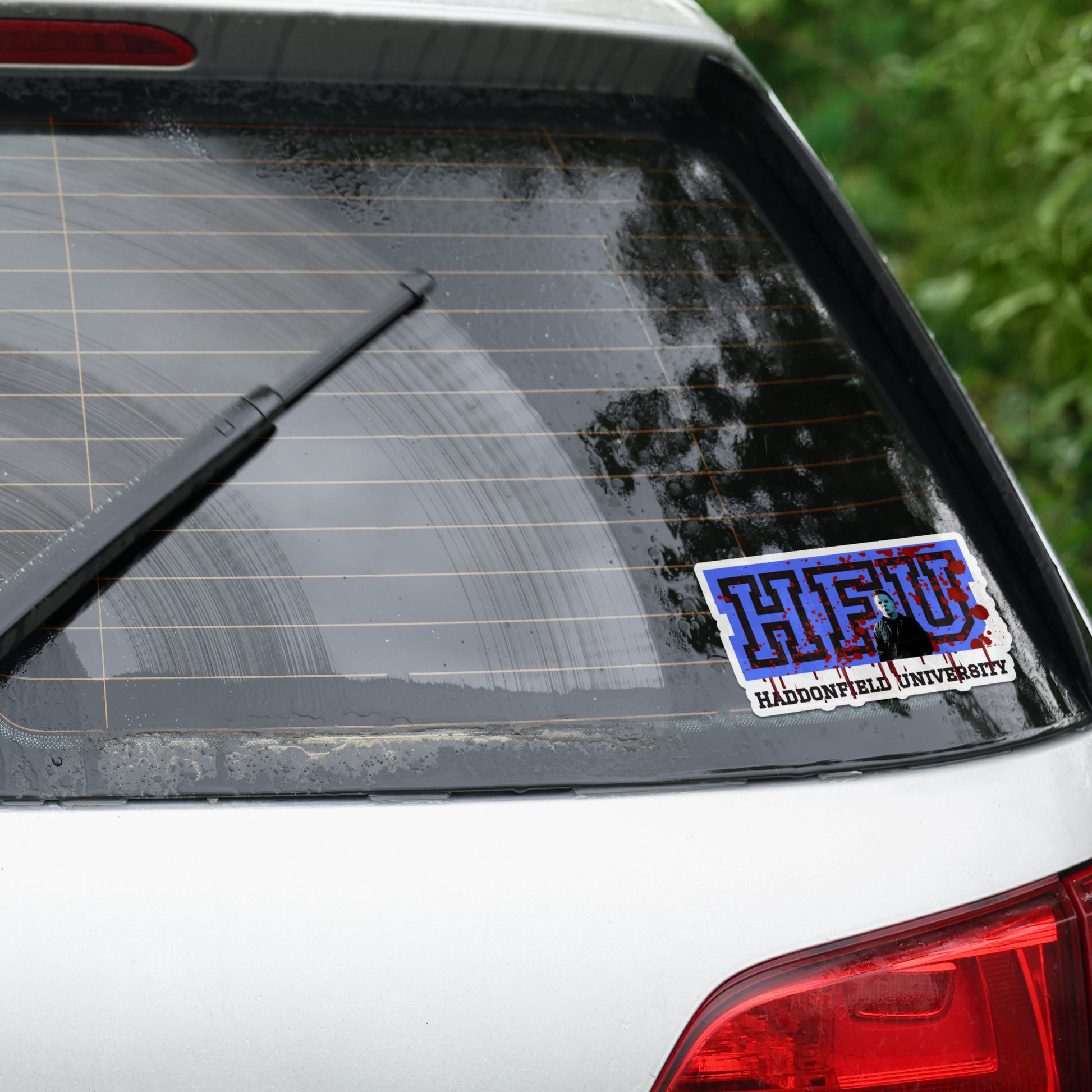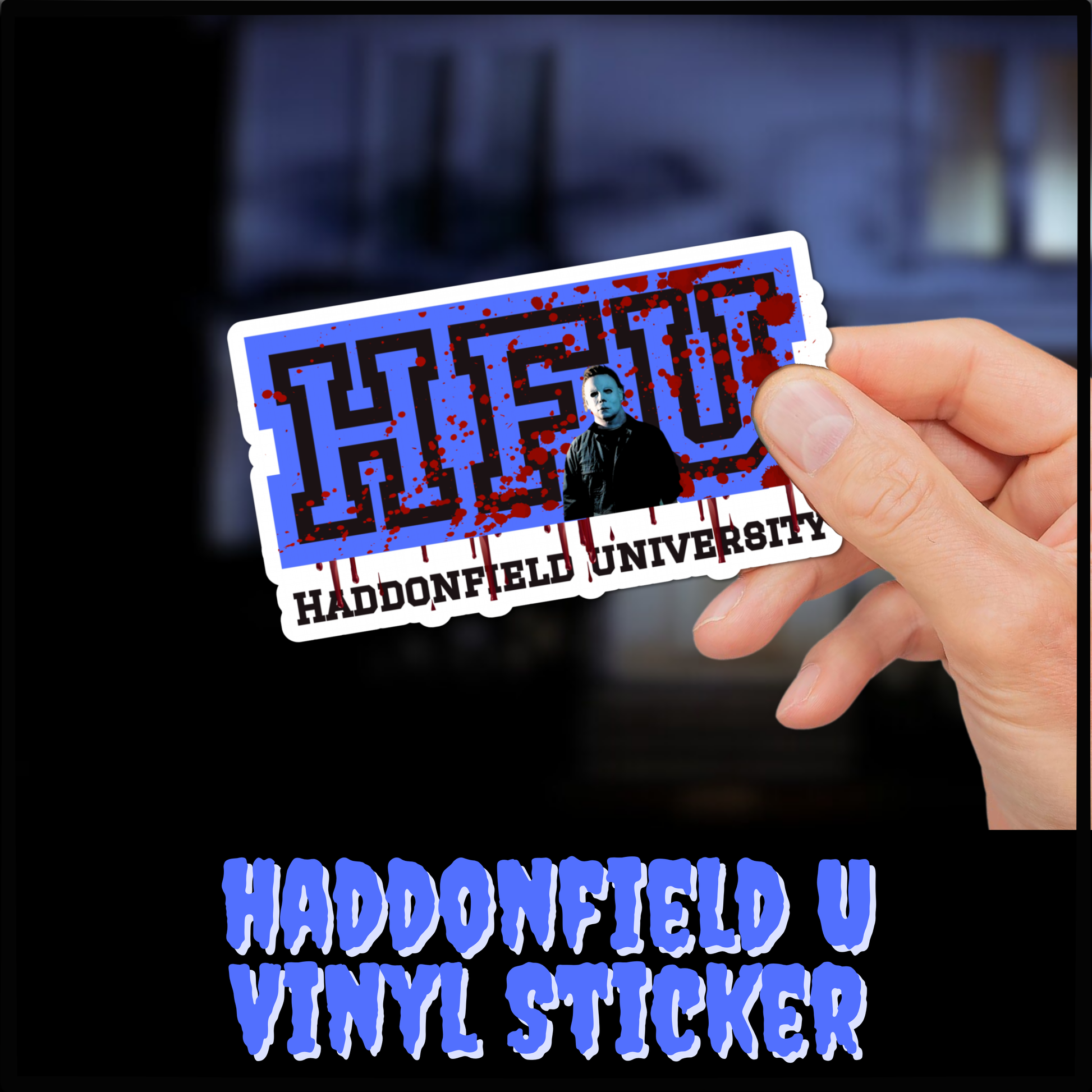 This striking sticker is inspired by the fictional Haddonfield University, located in the infamous town where the Shape himself, Michael Myers, terrorizes his victims. Featuring the bold "HFU" in deep blue and "Haddonfield University" beneath it in crisp black, the design wouldn’t be complete without Michael’s menacing figure and a splash of blood spatter for that classic horror vibe.