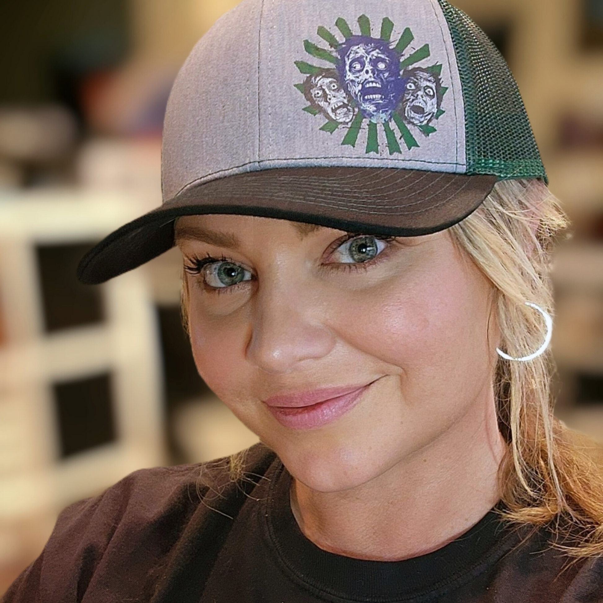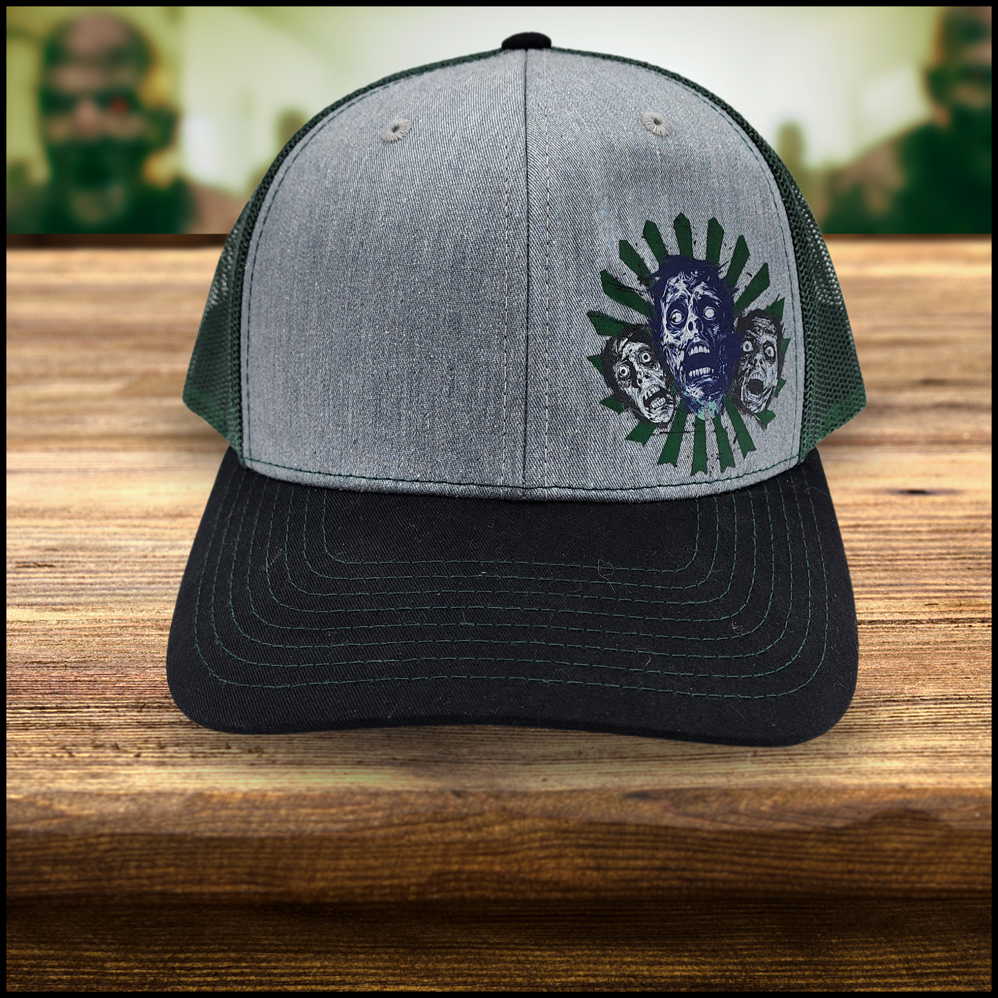 This unique design showcases three zombie heads on one side, with the middle zombie in a striking royal blue. A green spiral graphic beams out behind them, adding an extra pop of color. The hat features a grey front panel, green mesh back and snaps, and a black bill with green seams. Perfect for any zombie enthusiast!