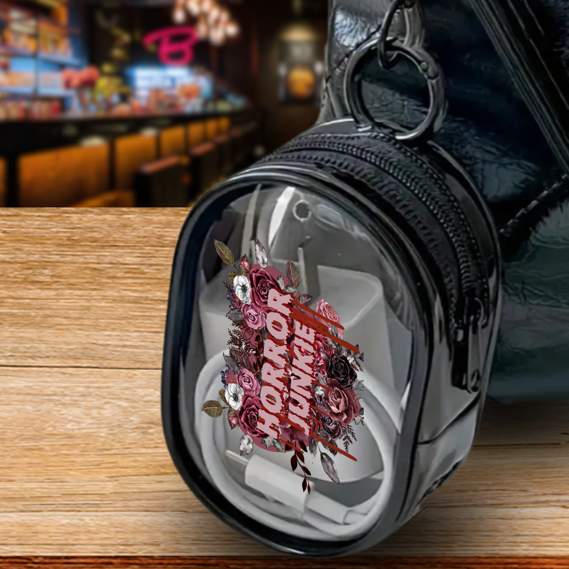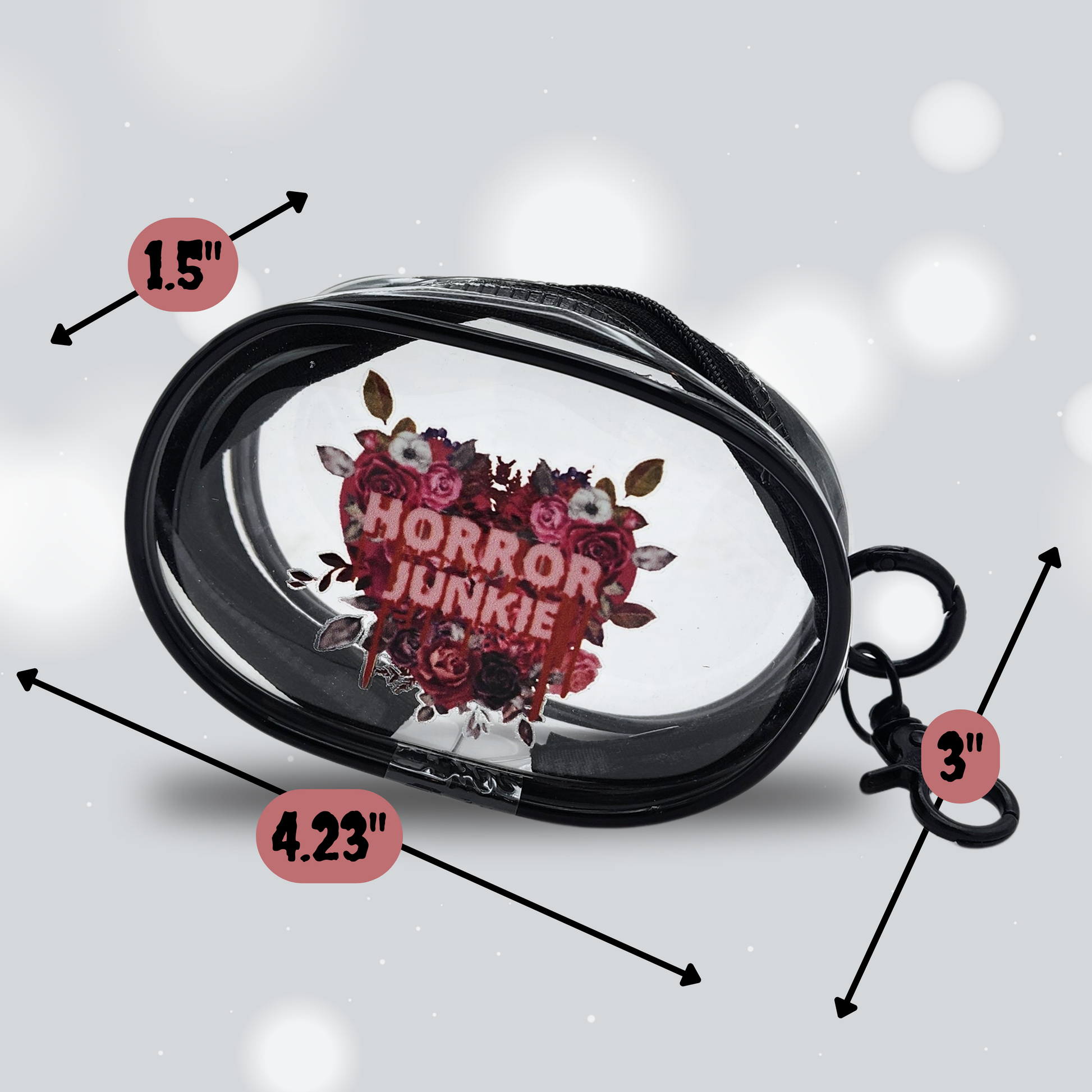 Calling all horror lovers—this one's for you! Our Horror Junkie Mini Stash Case blends bloody and beautiful with a floral-meets-slashers design, perfect for those who live for all things spooky. Whether you're stashing charging cords, cash, makeup, or other small essentials, this transparent case makes it easy to find what you need—no digging through the darkness.