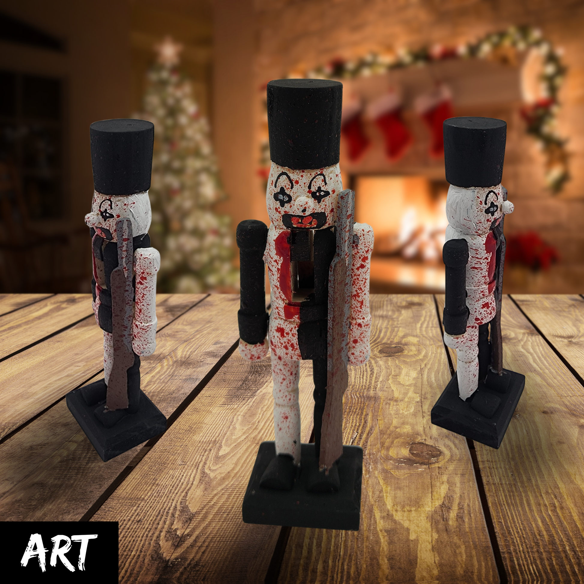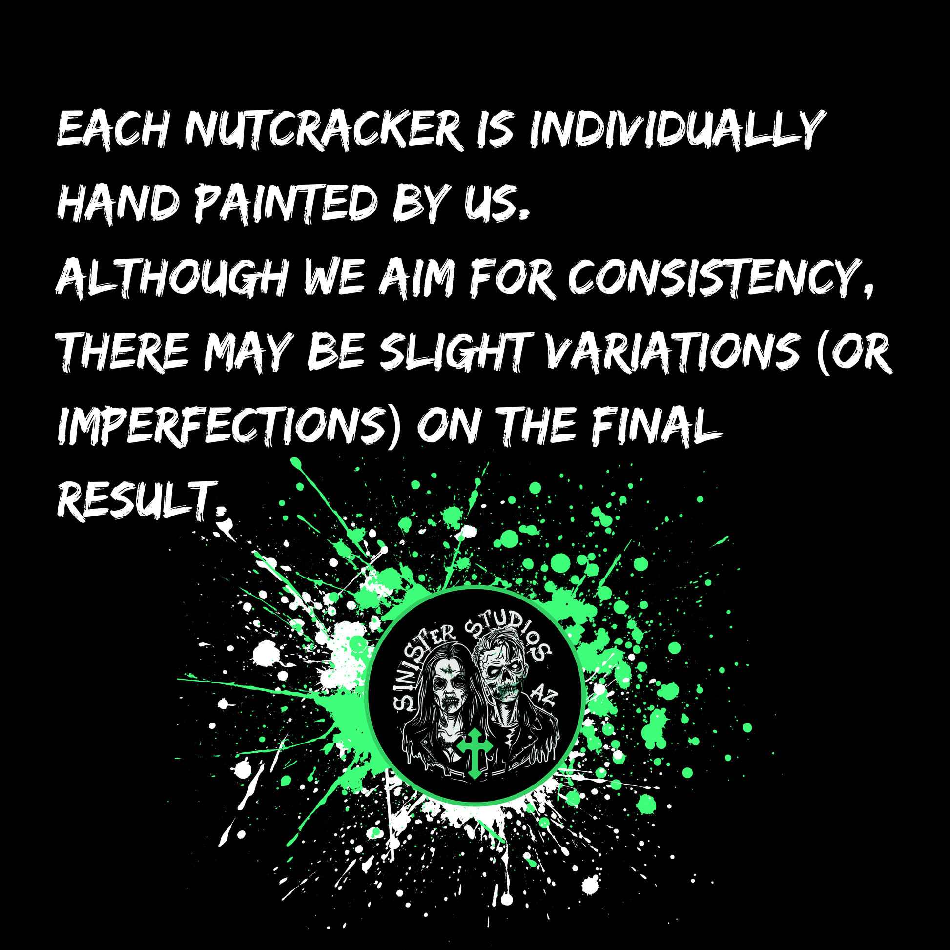 Each nutcracker is created with care and dark humor, combining the charm of classic holiday craftsmanship with a sinister edge. Because each one is hand-painted, subtle variations and imperfections give every piece its own unique character—no two are ever exactly alike.