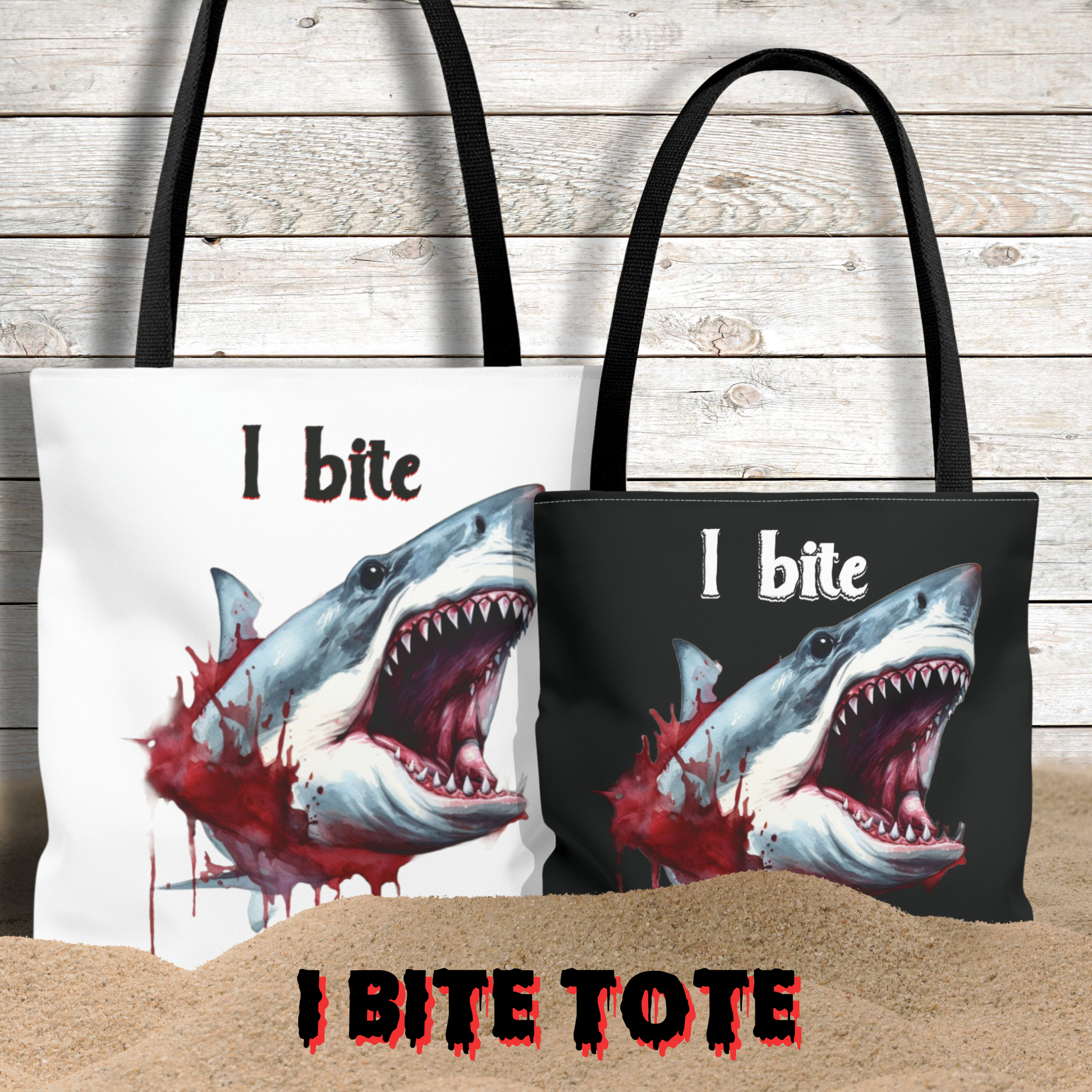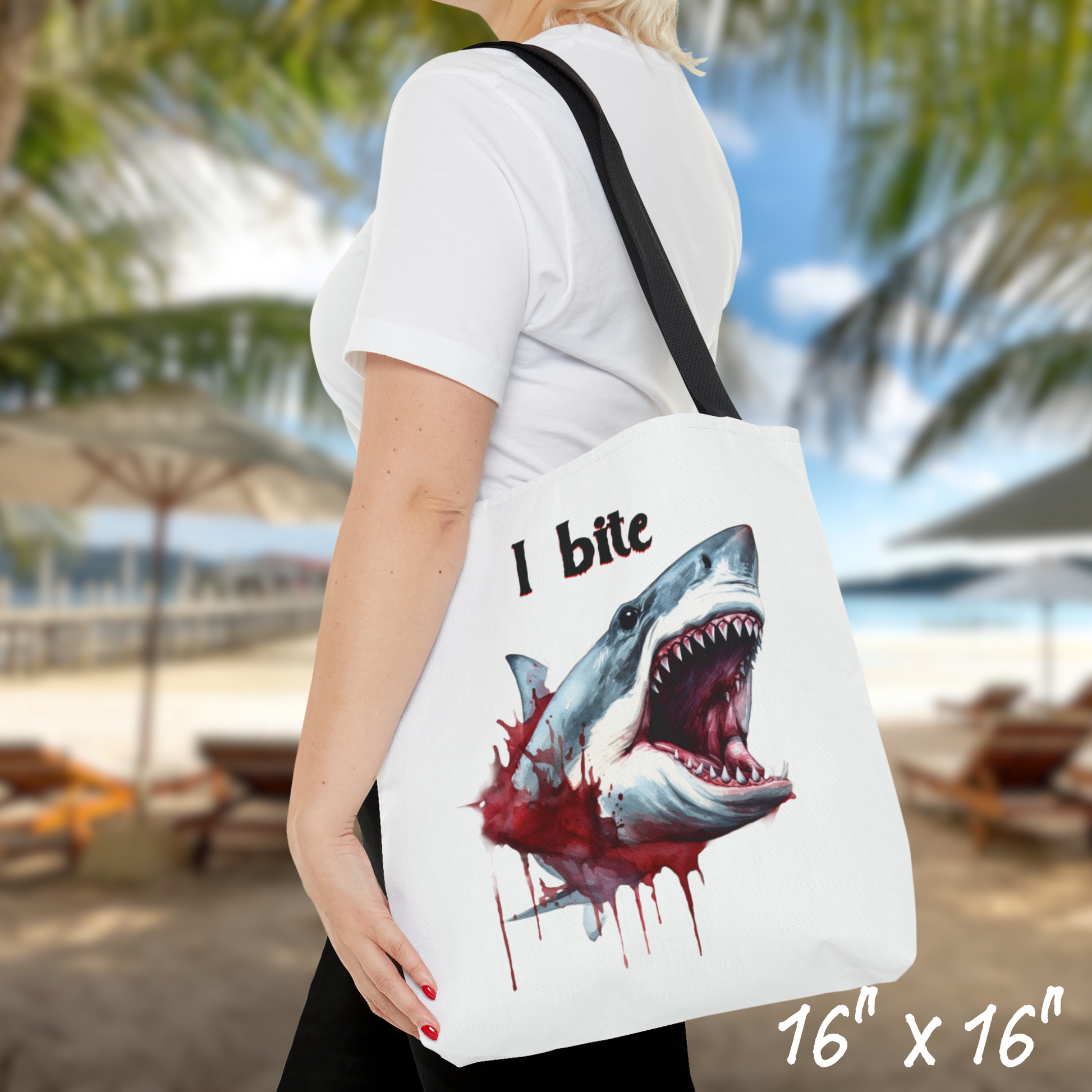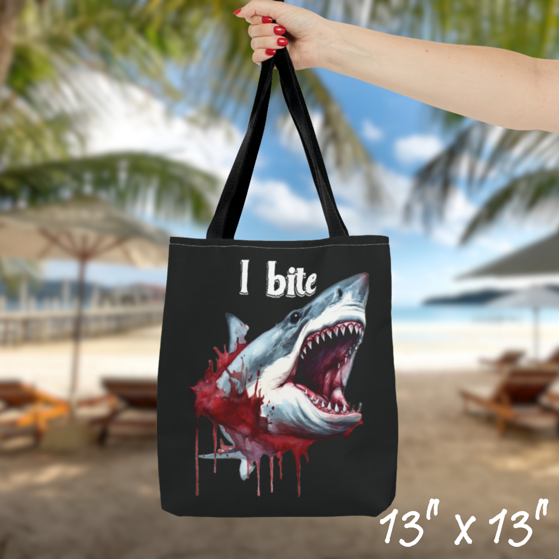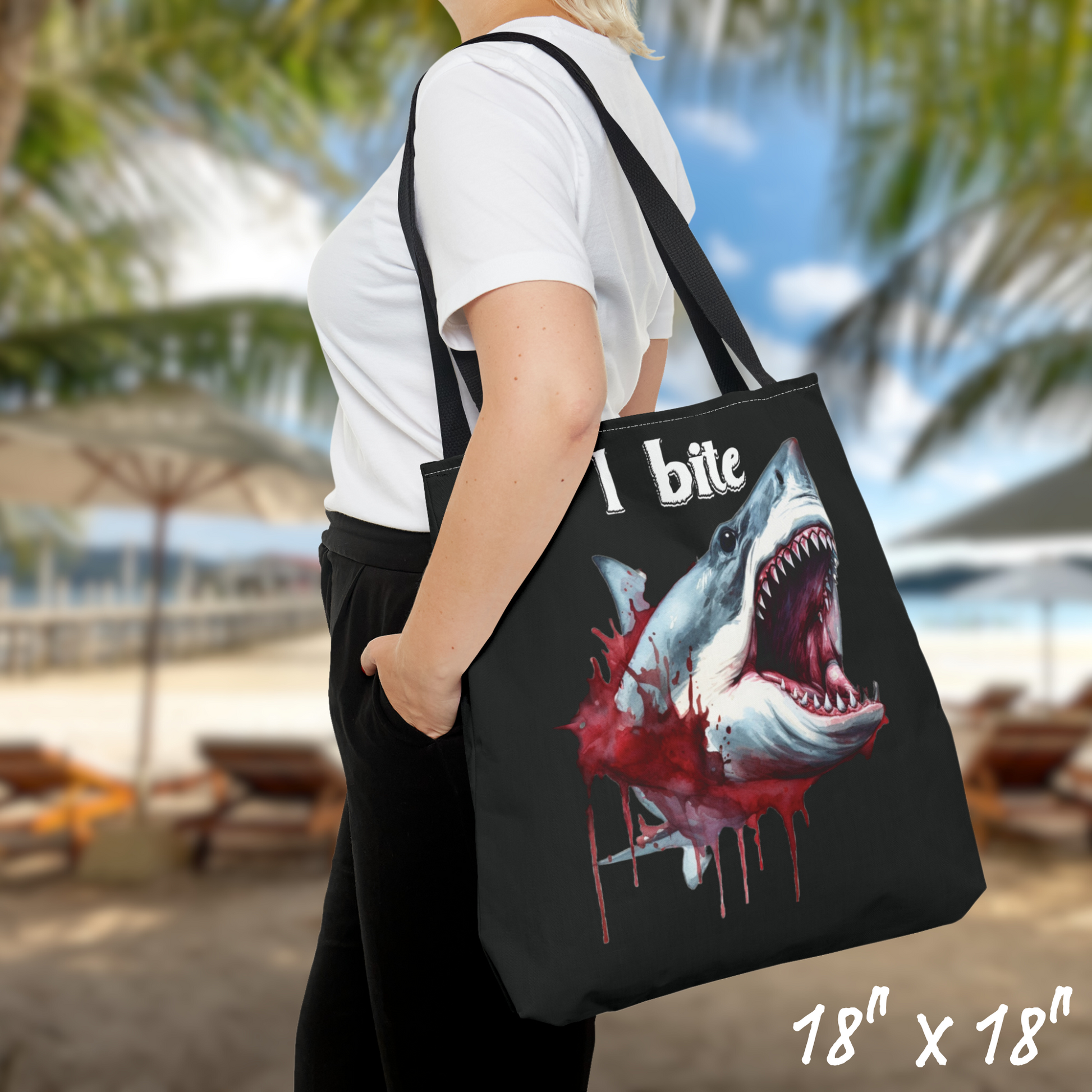 Our "I bite" shark attack Tote Bag is available in three sizes and two colors. Front and back print provides comfort with style at the beach or out in town. Made from reliable materials, lasting for seasons.