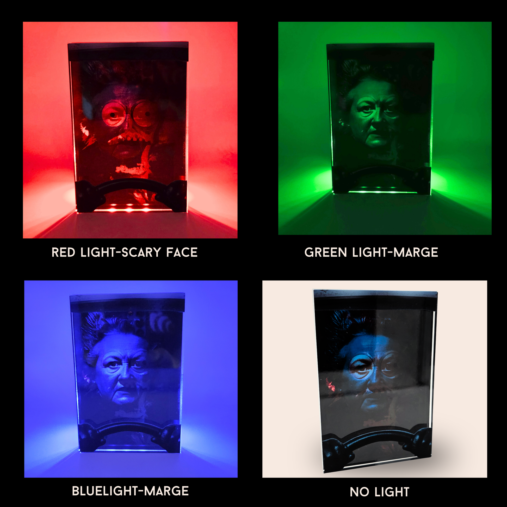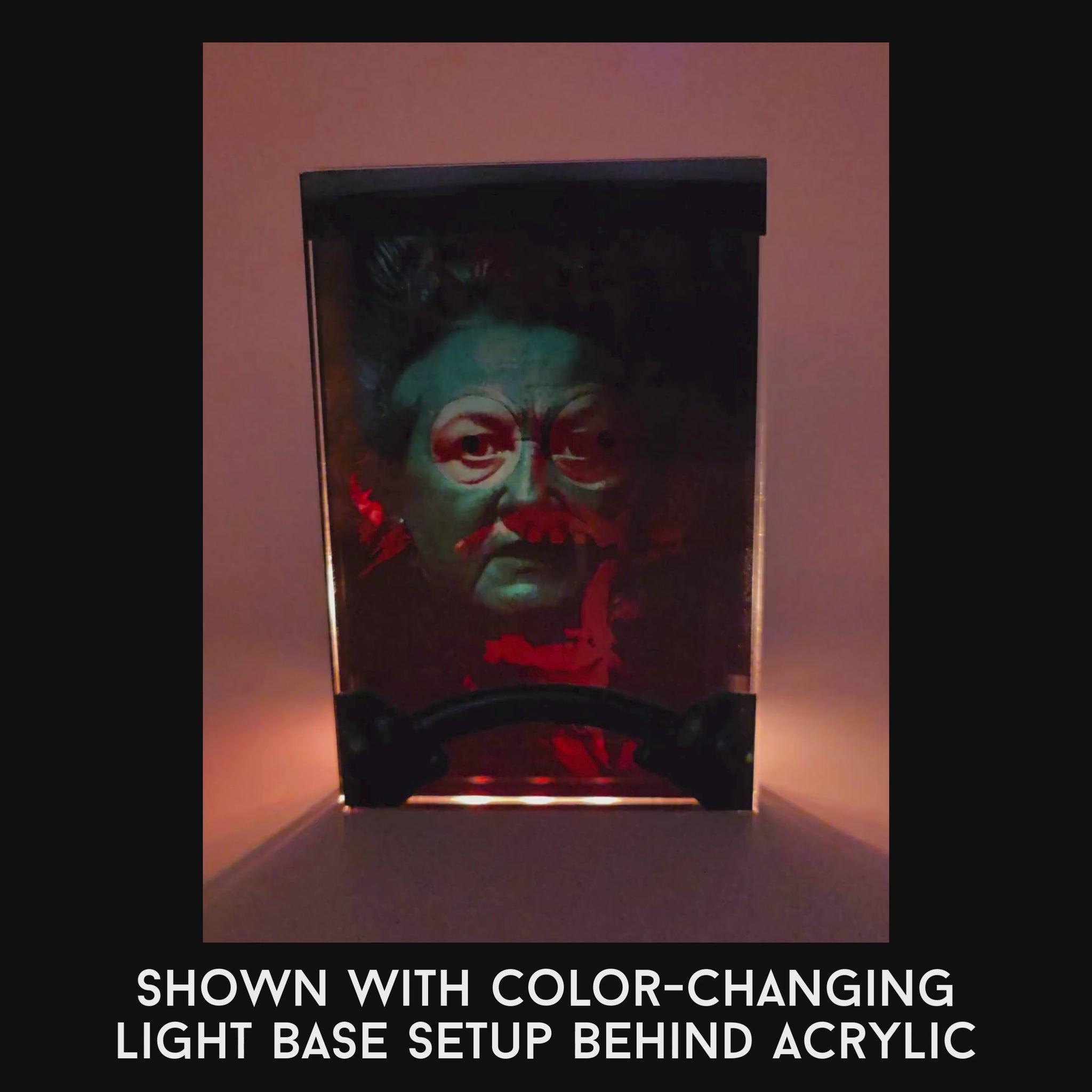 The illusion effect is created using layered acrylic inside a 4” x 6” clear magnetic frame, producing depth and a dramatic light-reactive shift between the calm driver and the distorted horror face. The transformation becomes especially intense when displayed on a color-changing LED base.