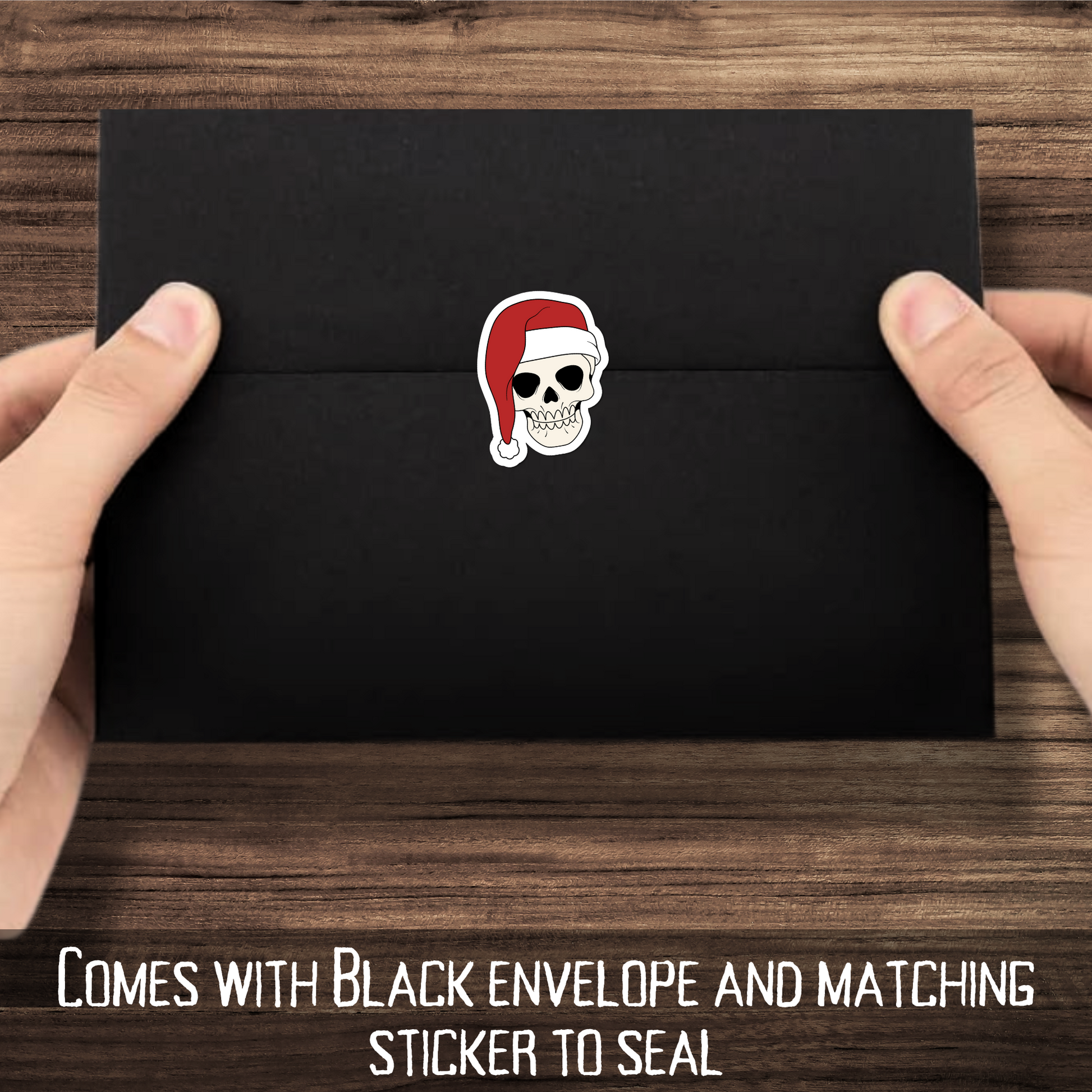 * A santa hat wearing skull sticker included to help seal your card with gothic love