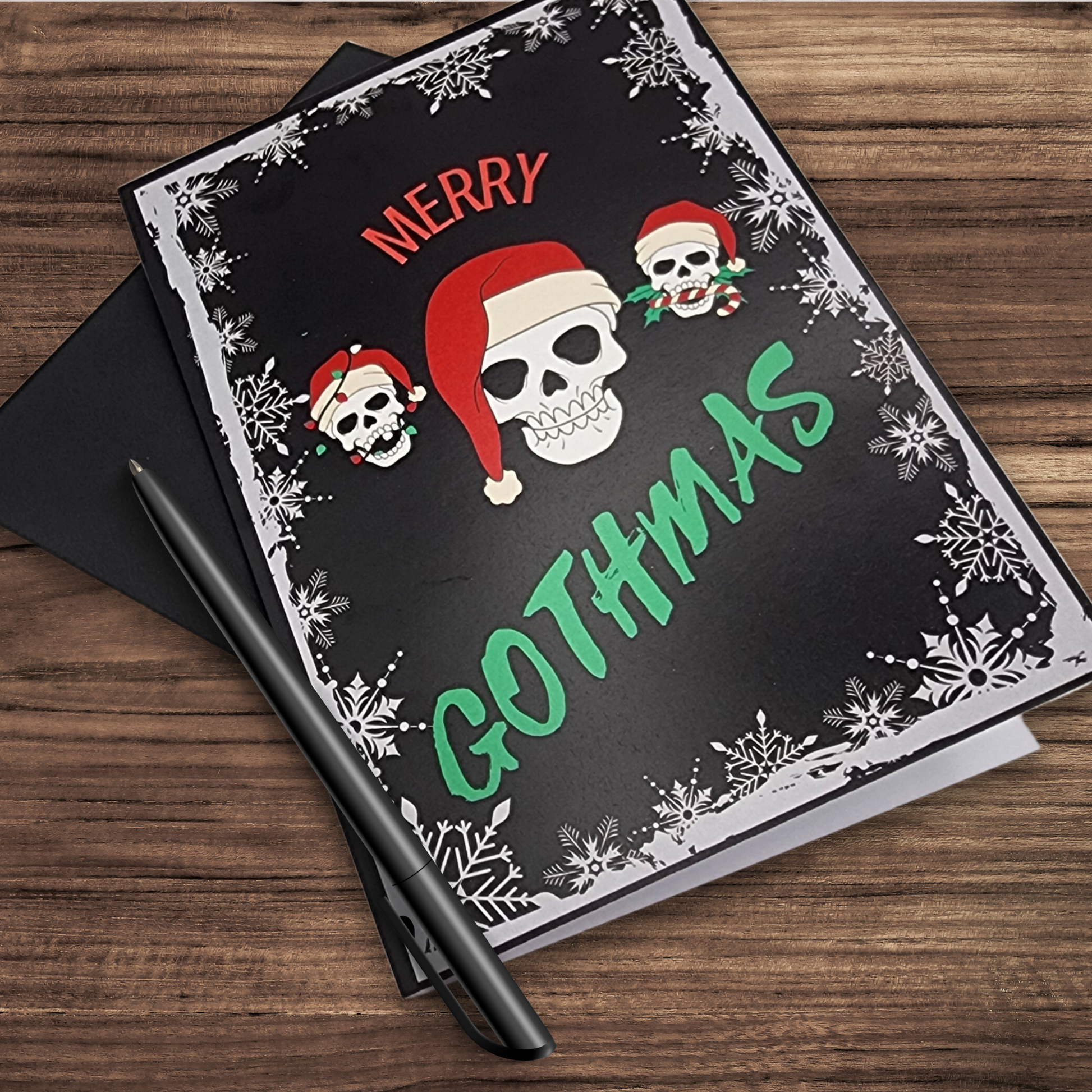 Each card comes with a sleek black envelope and a matching skull sticker to seal in your holiday spirit—or maybe your holiday mischief. Whether you're sending it to your ghoul-friends or keeping it as a unique piece of holiday decor, this card is designed to bring a wicked smile to any goth’s face.