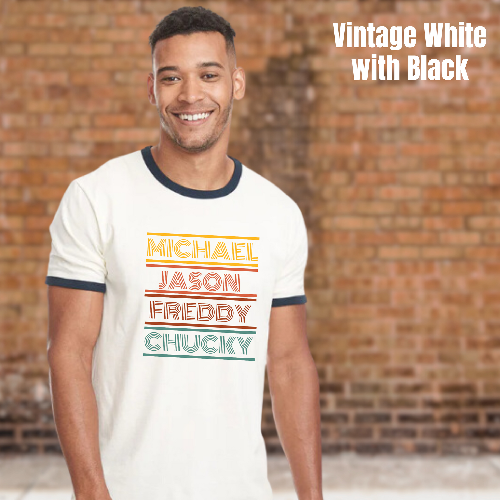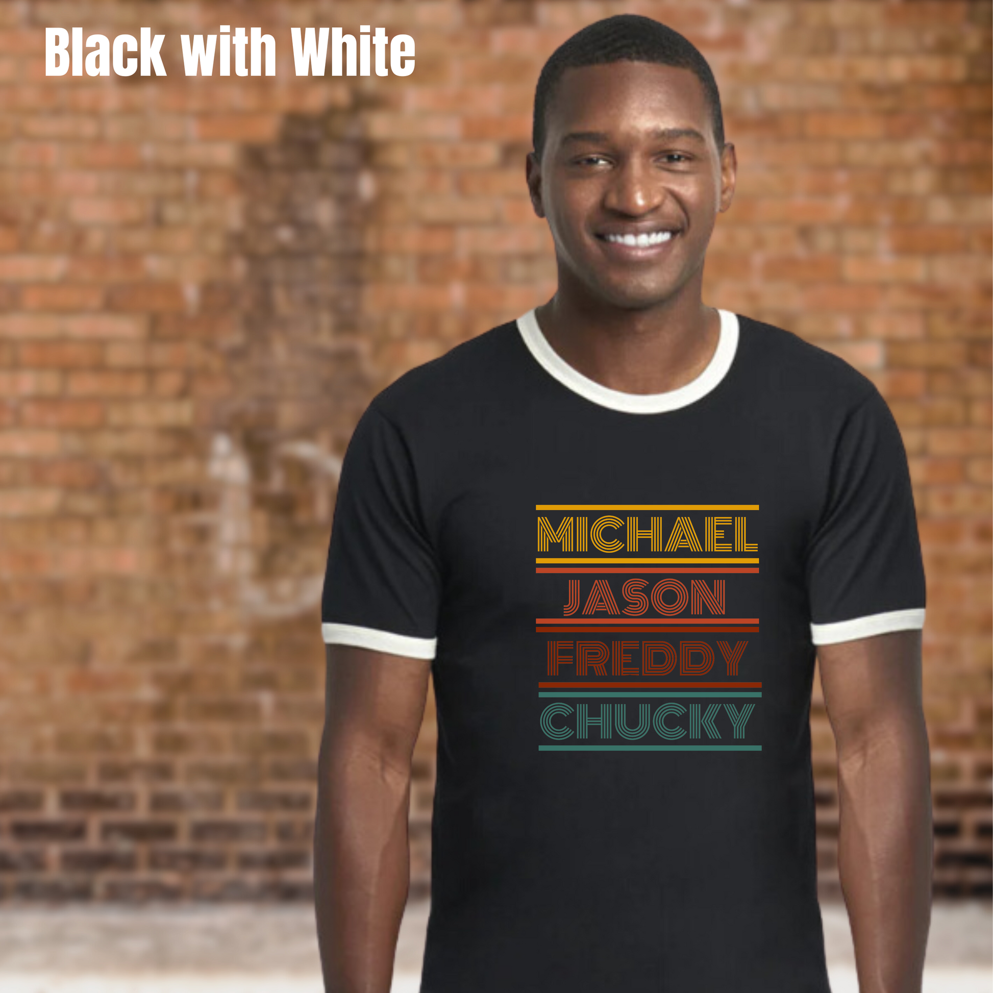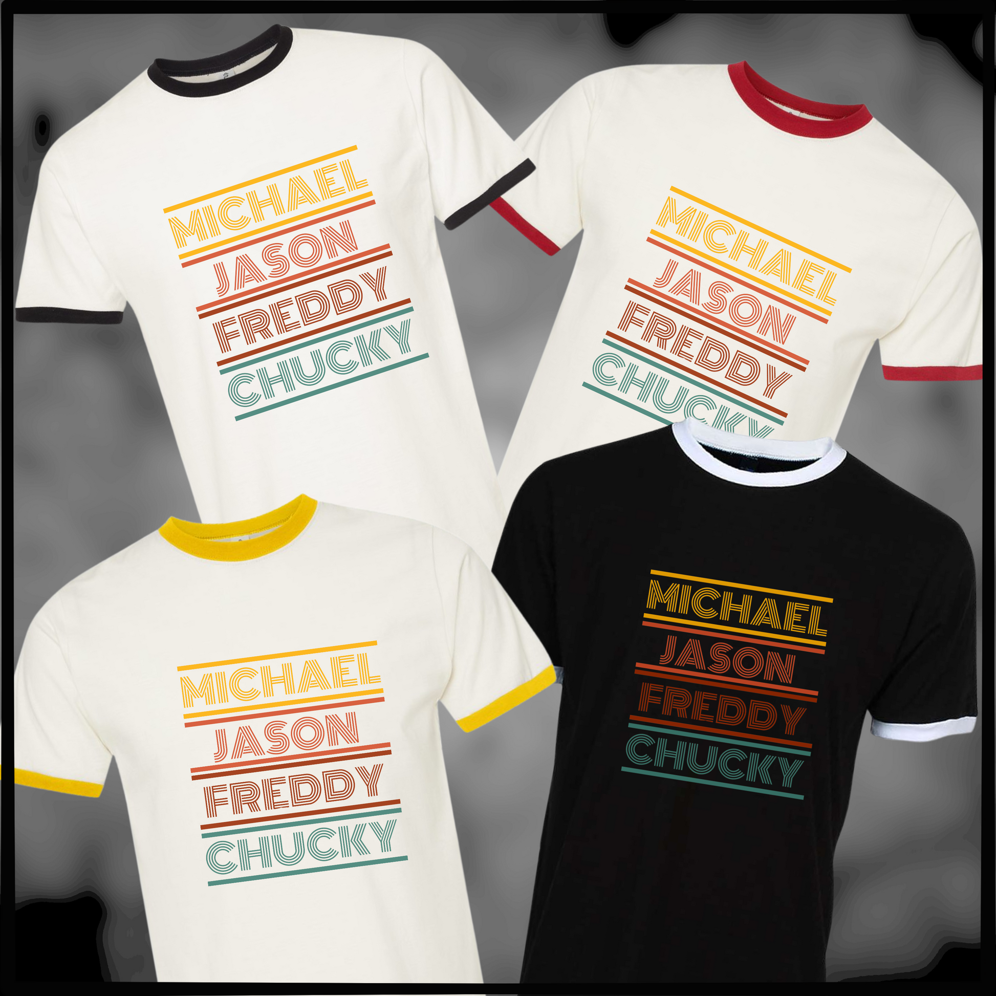 Embrace your inner horror fan with our Michael-Jason-Freddy-Chucky ringer tee, perfect for adding a retro vibe to your wardrobe. This simple design, featuring a 70s style font in shades of yellow, orange, red, and teal, is sure to stand out.