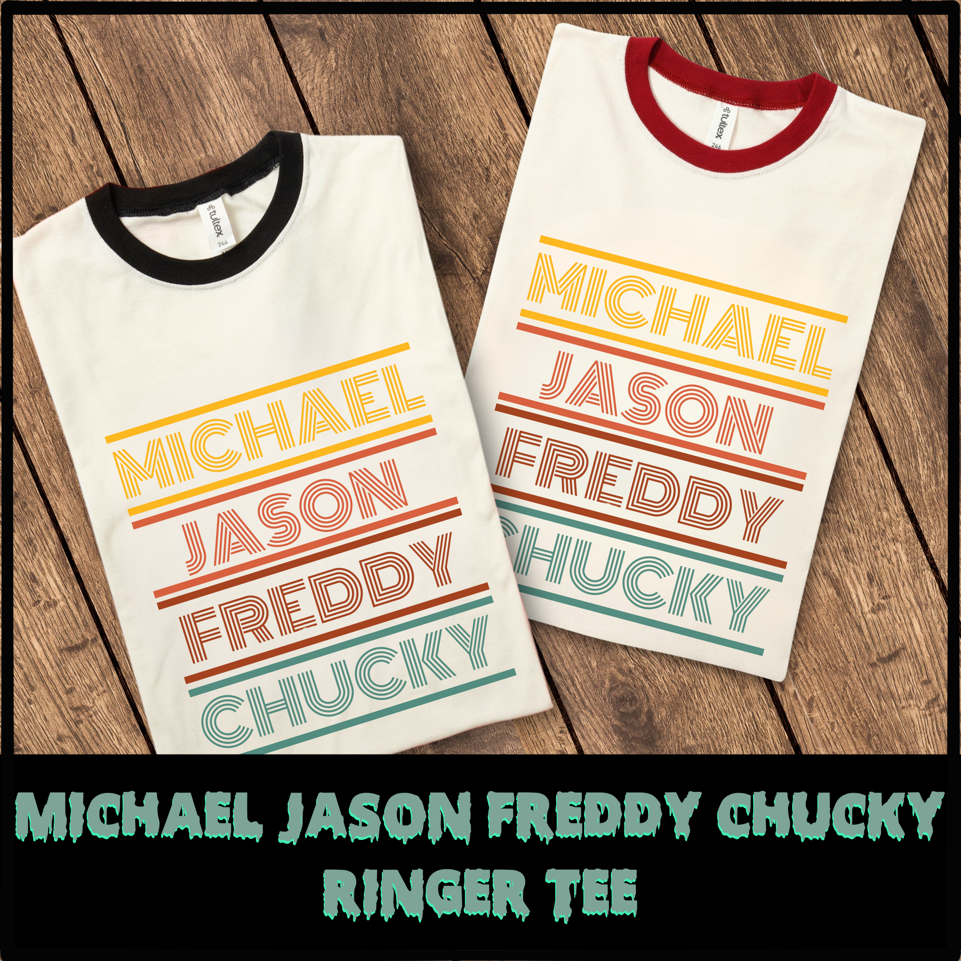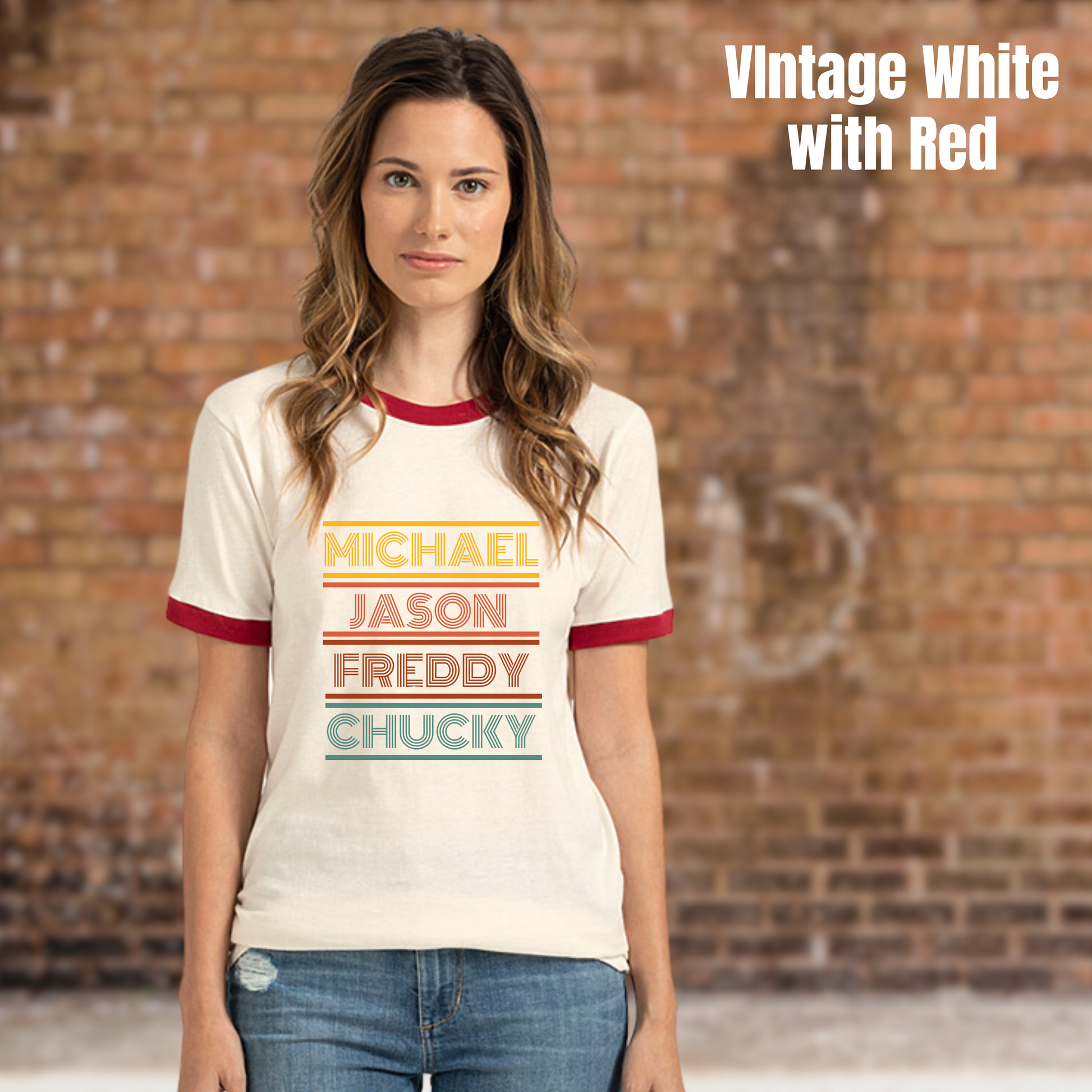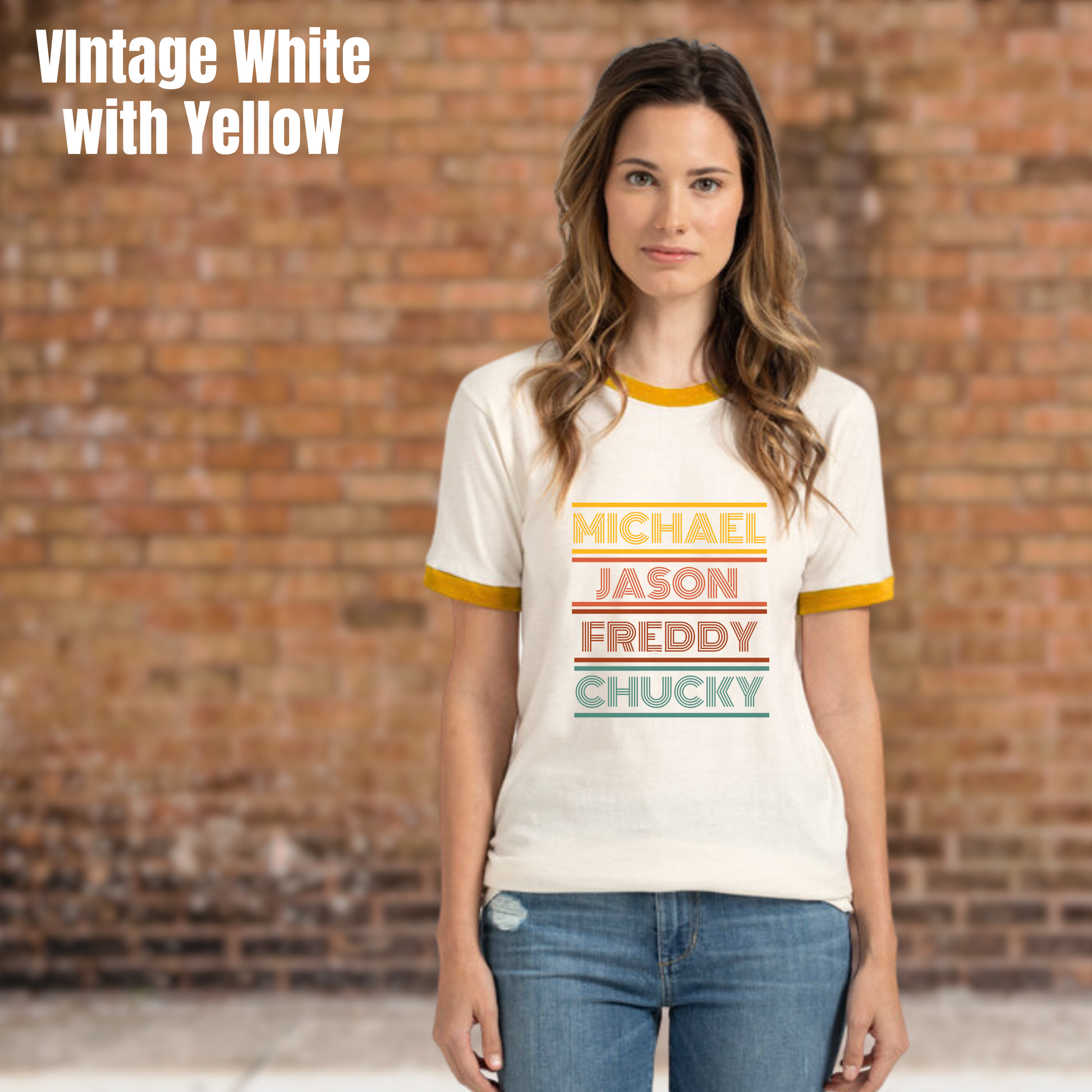 Embrace your inner horror fan with our Michael-Jason-Freddy-Chucky ringer tee, perfect for adding a retro vibe to your wardrobe. This simple design, featuring a 70s style font in shades of yellow, orange, red, and teal, is sure to stand out.