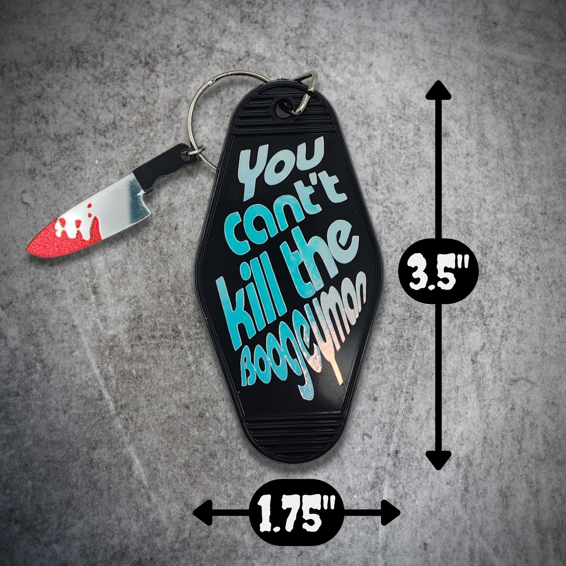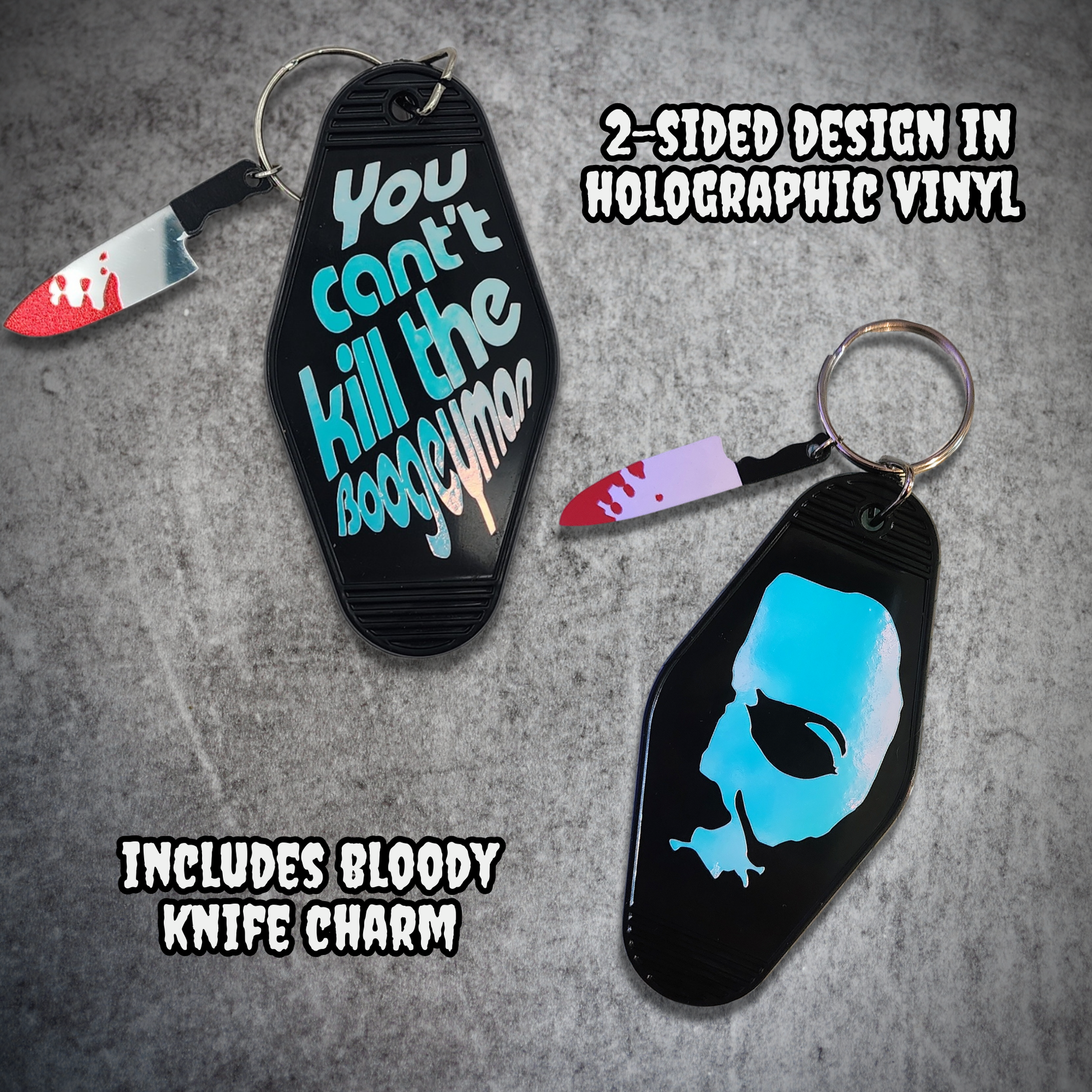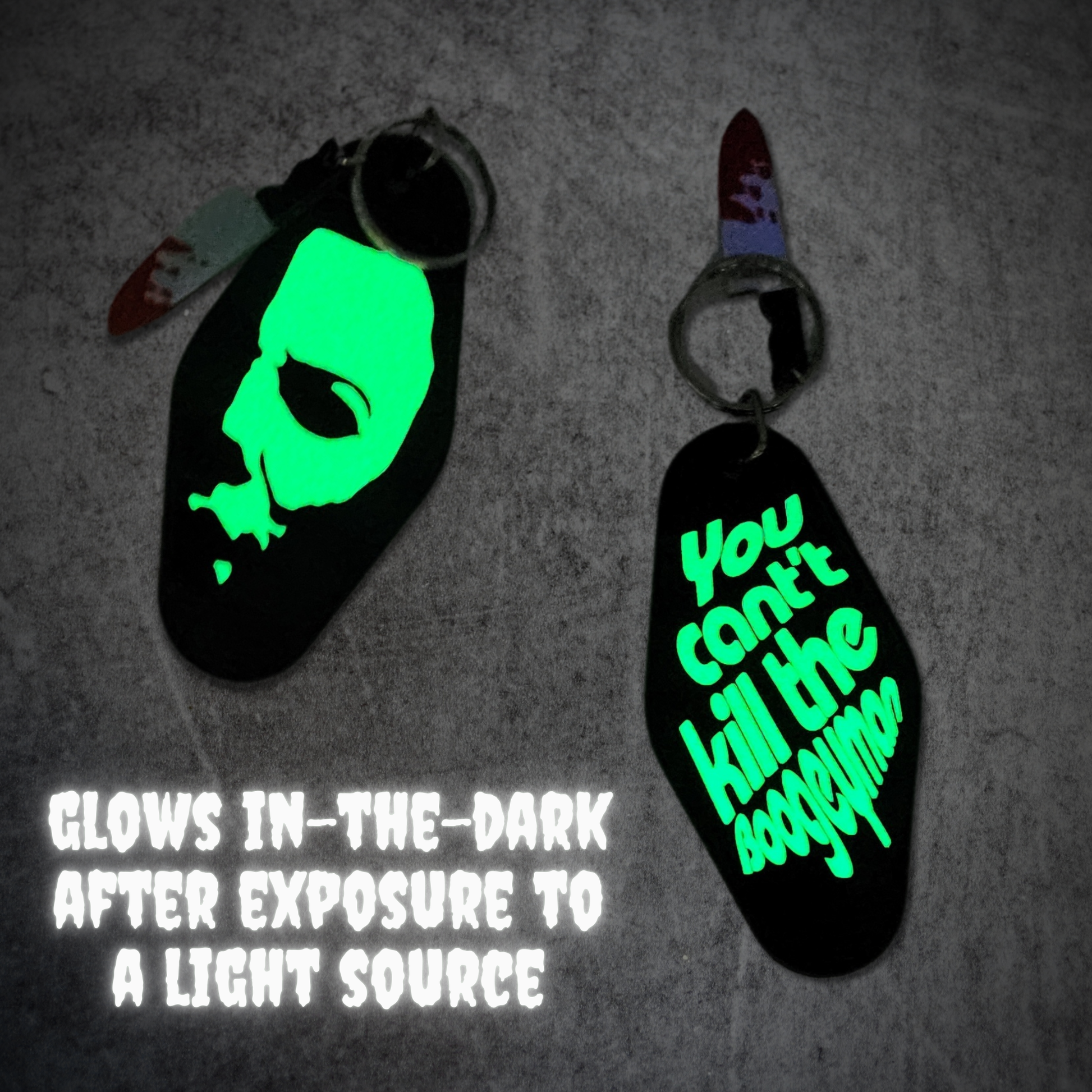 Michael Myers Glow-in-the-Dark Motel Keychain | “You Can’t Kill the Boogeyman” Retro Horror Tag with Knife Charm | Slasher Fan Gift