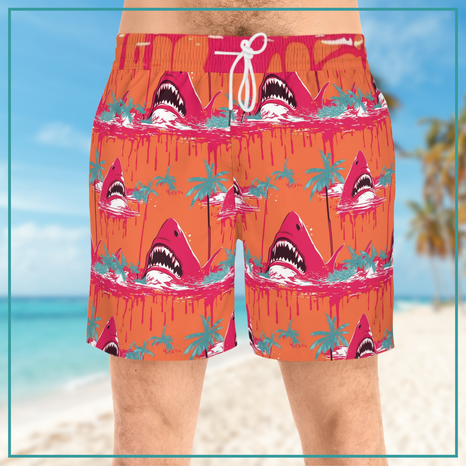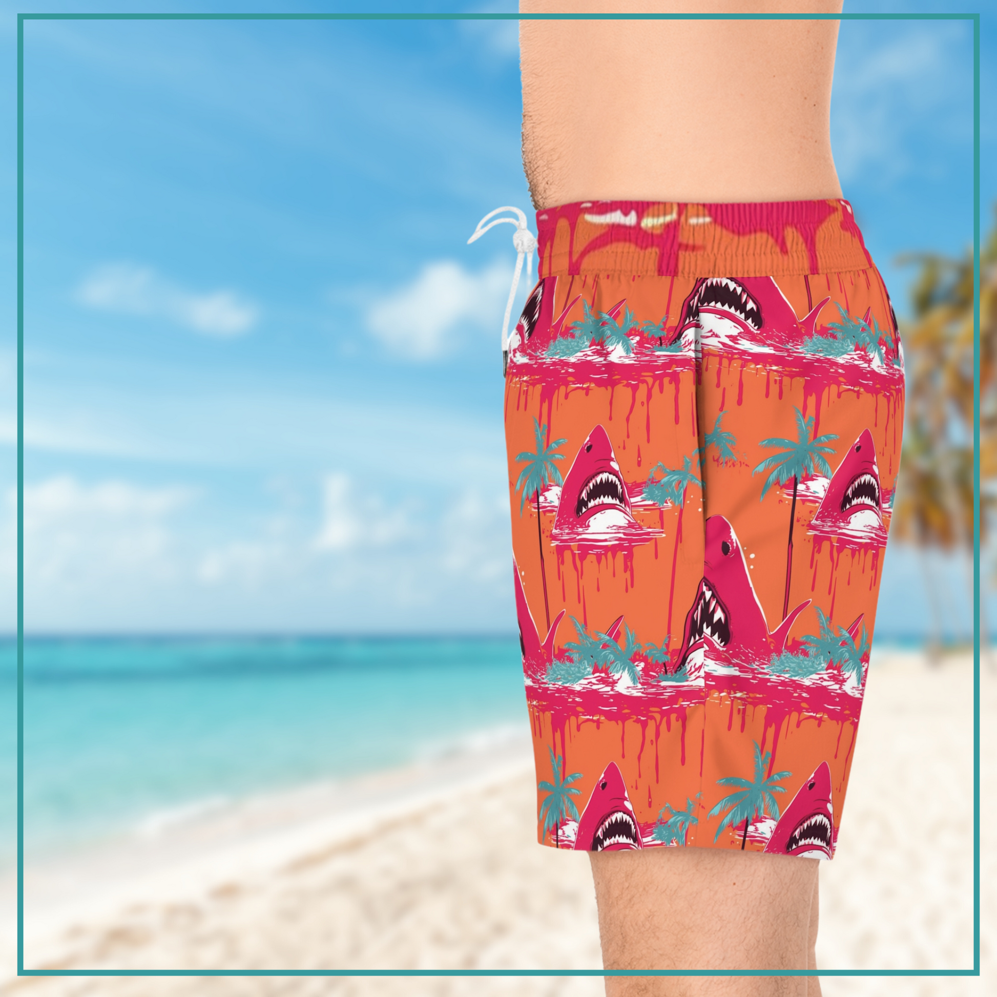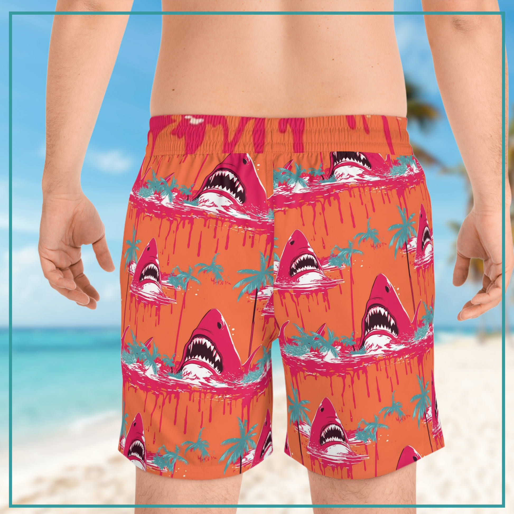 The striking design features hot pink sharks with menacingly bloody mouths and teal palm trees against a vibrant orange backdrop, creating a head-turning look that captures the essence of sunny days by the coast.