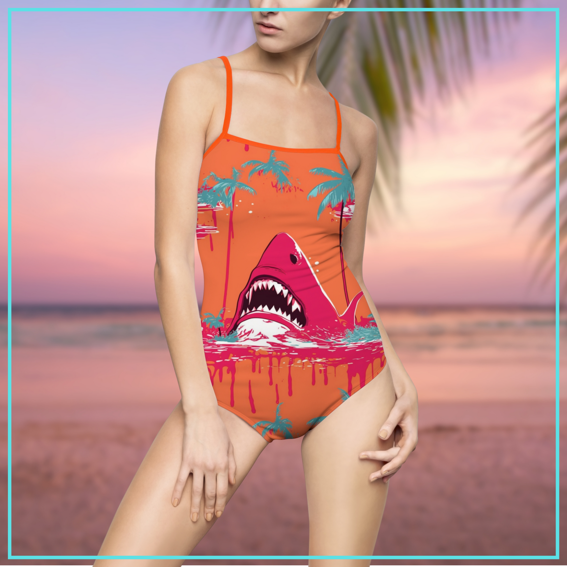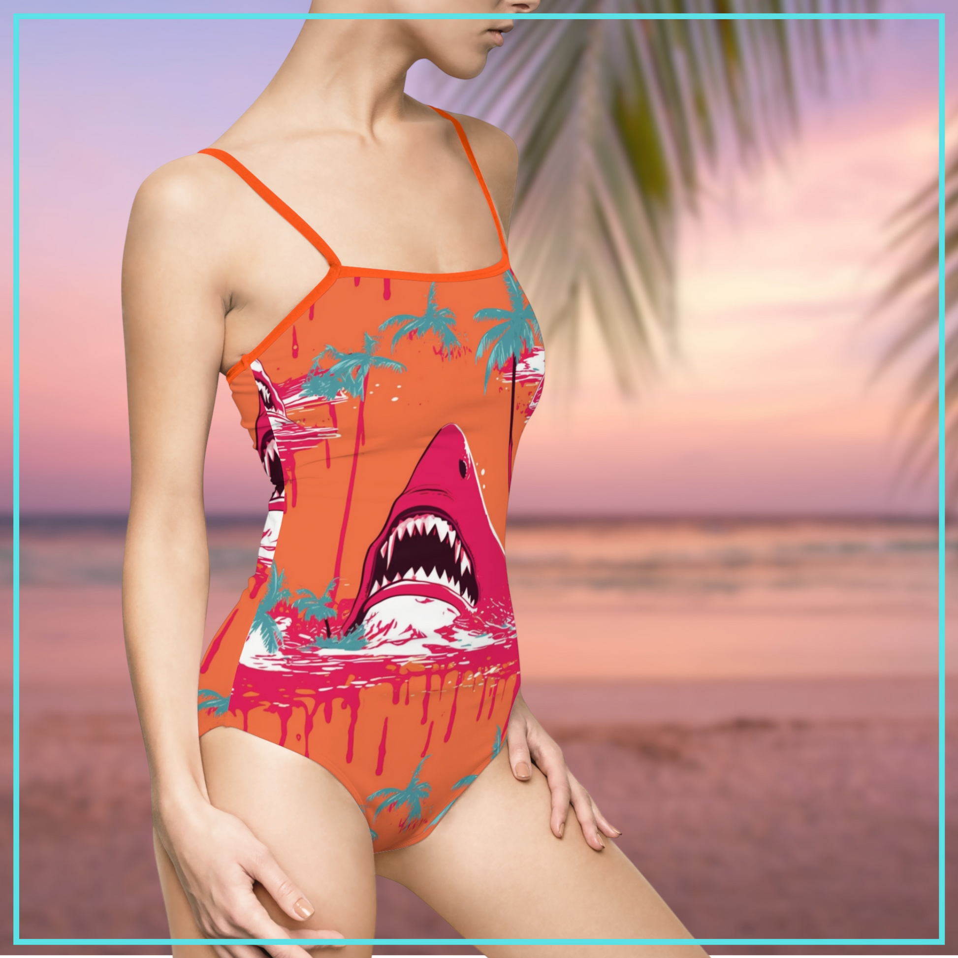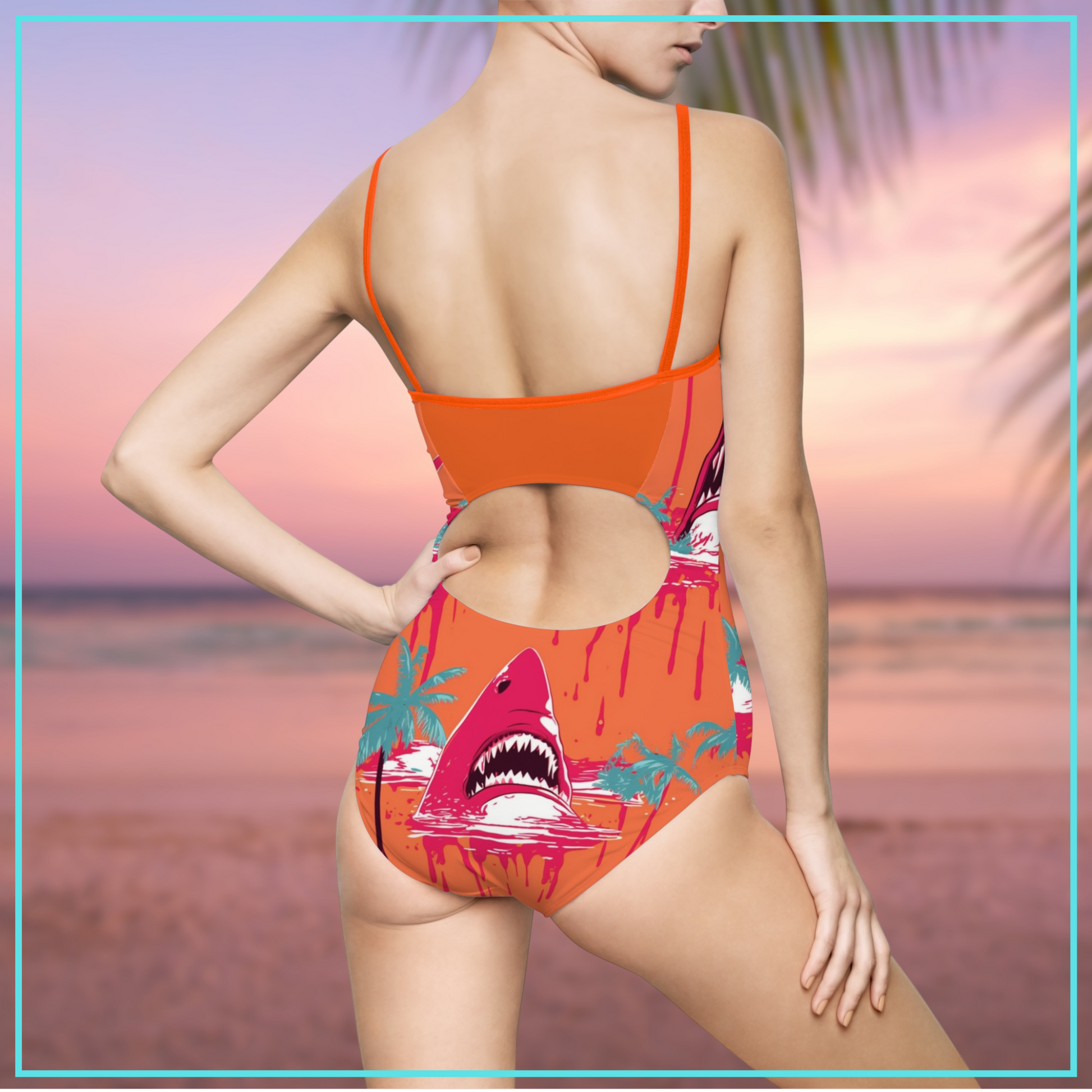 Presenting our Neon Sharks strappy one-piece swimsuit, showcasing hot pink sharks with menacing open mouths and teal palm trees against a vibrant orange background.