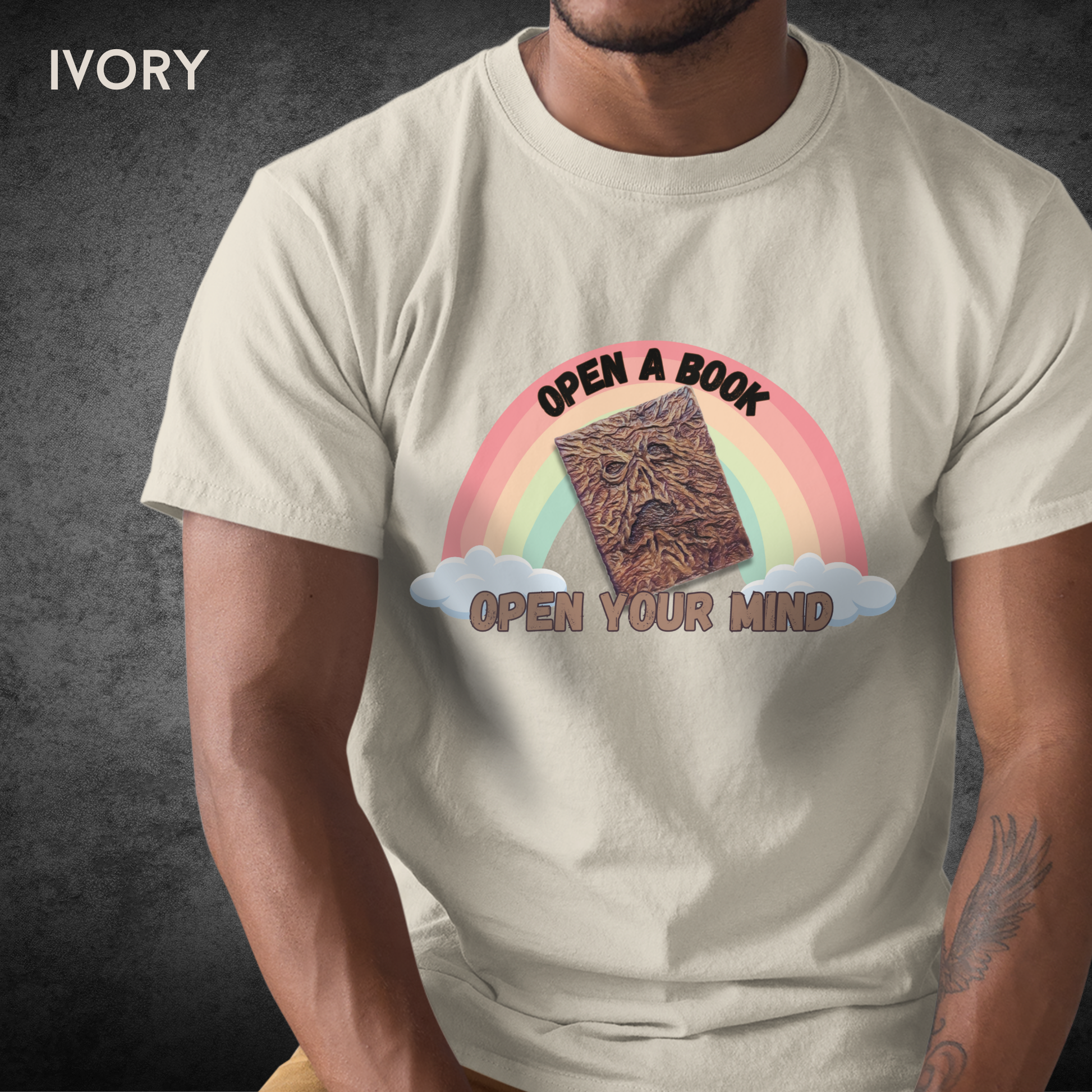 Expand your mind...if you dare. Our Open a Book, Open Your Mind unisex tee features the infamous Necronomicon reimagined in a surreal, retro-inspired design. The iconic book from the Evil Dead floats beneath a soft rainbow arc, blending horror nostalgia with a tongue-in-cheek literary message that horror fans, readers, and cult-classic lovers will instantly recognize.