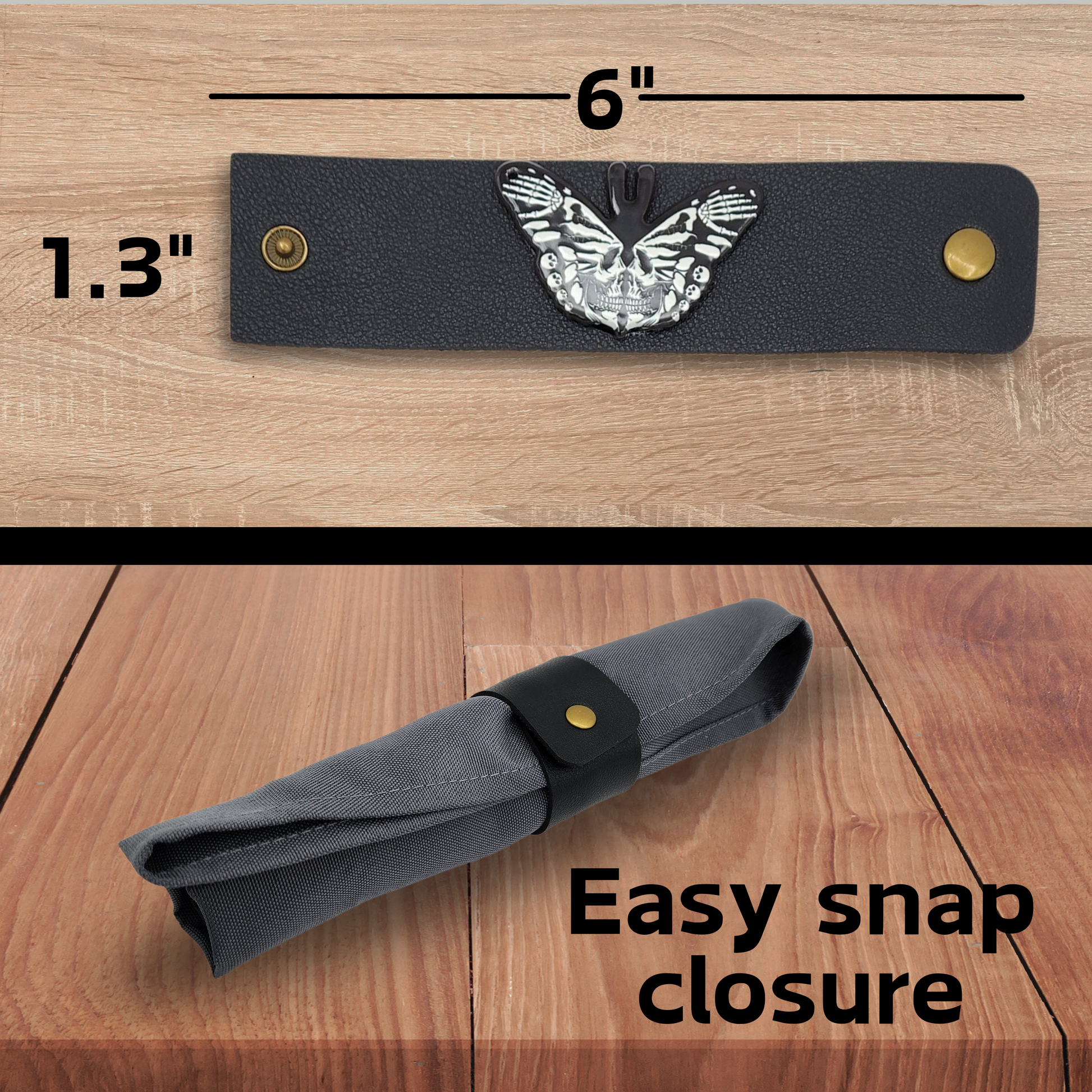 Looking to add a gothic flair to your table? Our Ouija Moth Napkin Ring Set is the perfect touch! The set includes two of each design: one featuring a Ouija planchette with a detailed moth, and the other displays a moth in a stunning gothic skeletal style. Both designs are beautifully displayed on sleek black faux leather straps (1.3" x 6"), finished with an easy-to-close brass-style snap. Handcrafted and shipped with pride straight from Arizona, USA.