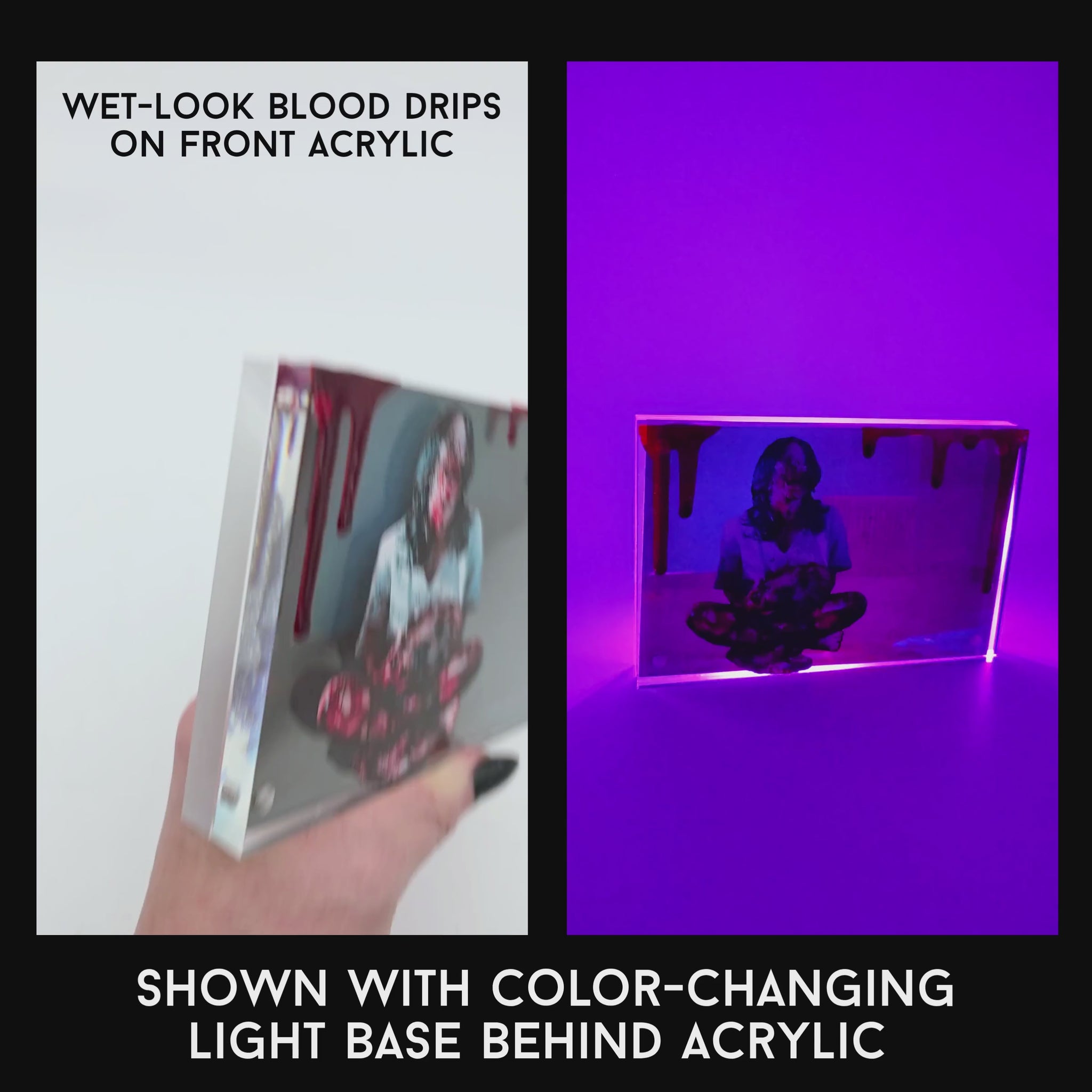 This layered acrylic artwork creates a striking 3D visual effect, giving depth and dimension that shifts depending on lighting, especially when paired with a backlight or optional RGB LED base. It’s designed to look incredible on display while also serving as a perfect autograph piece for horror conventions like Monsterpalooza.