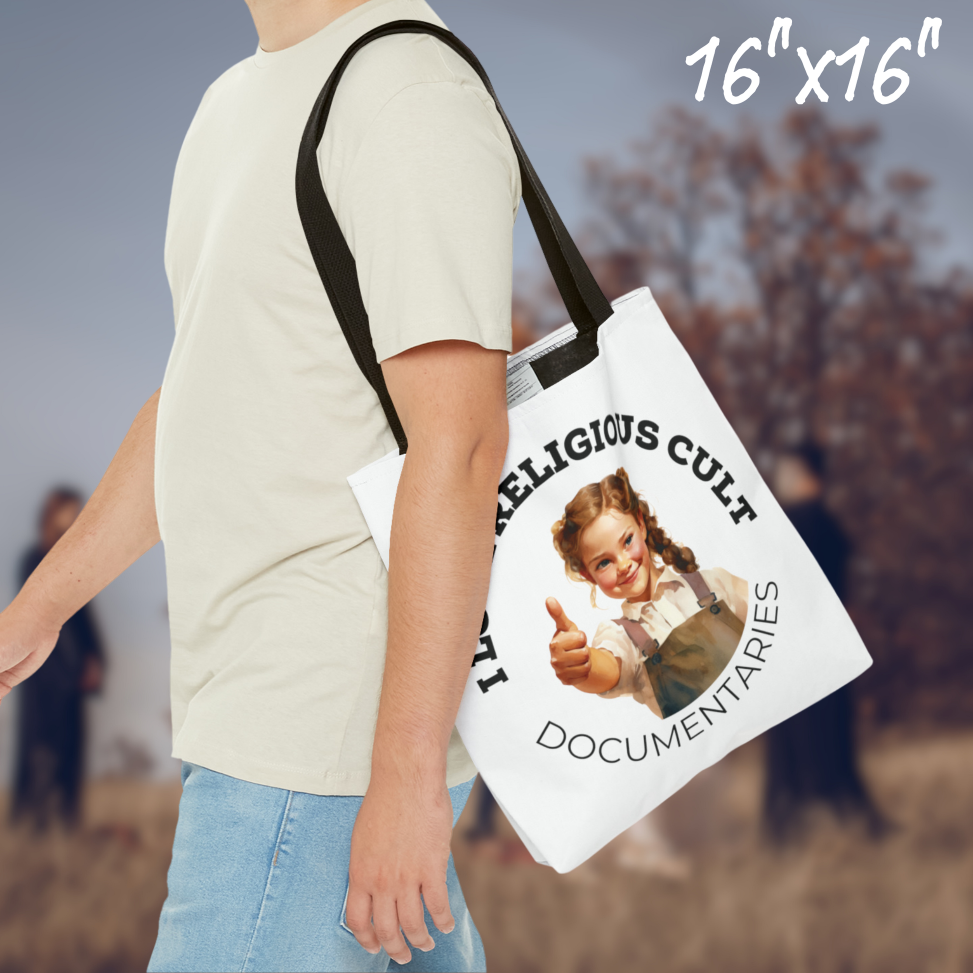 Our "I Love Religious Cult Documentaries" tote bag features a cute vintage little girl surrounded by the text design. These bags come in 3 sizes and 2 color options. These bags are sturdy and can handle plenty of use whether its used as a grocery bag, shopping bag or as your daily purse.