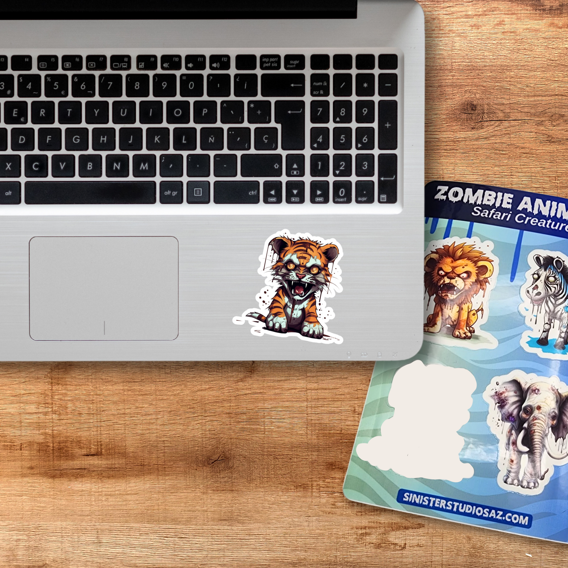 This sheet features four unique stickers showcasing zombie versions of a zebra, lion, tiger, and an elephant. Printed on glossy water-resistant vinyl and sealed with a sleek laminate, these stickers not only capture attention but also stand strong against scratches and wear. Effortlessly peel them off the paper backing, ready to be applied to any surface of your choosing.