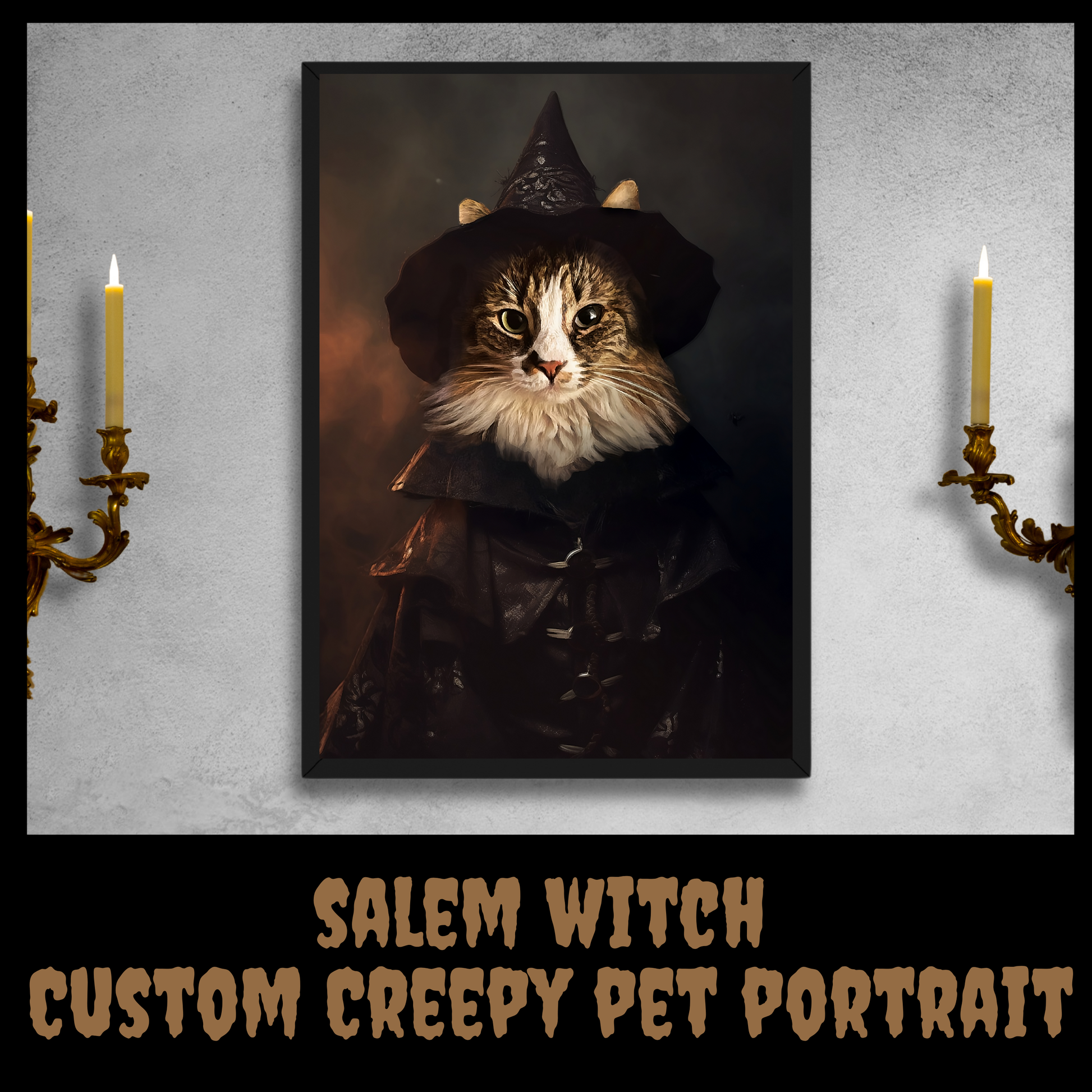Elevate the eerie ambiance of your living space with a customized portrait featuring your pet transformed into "Salem Witch"