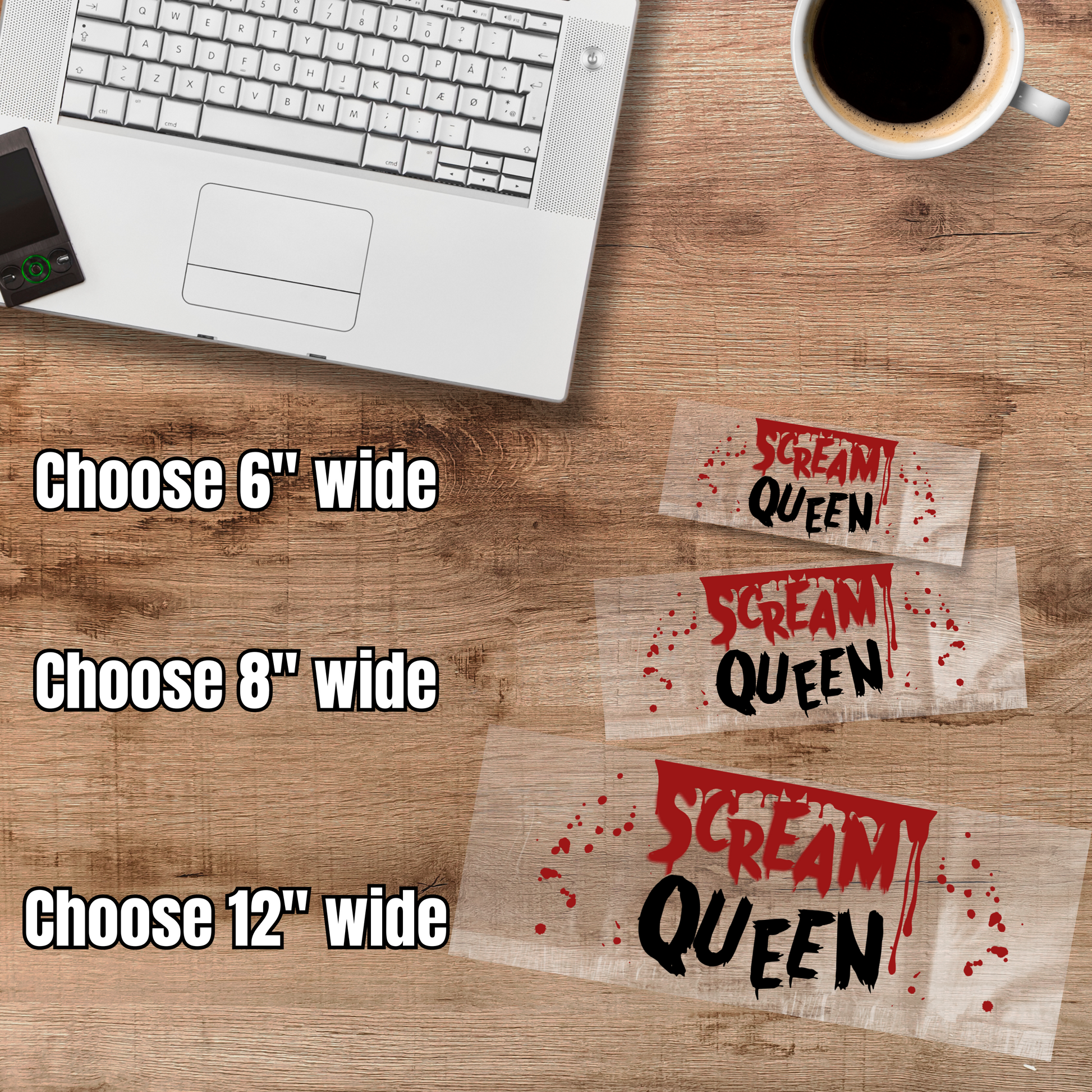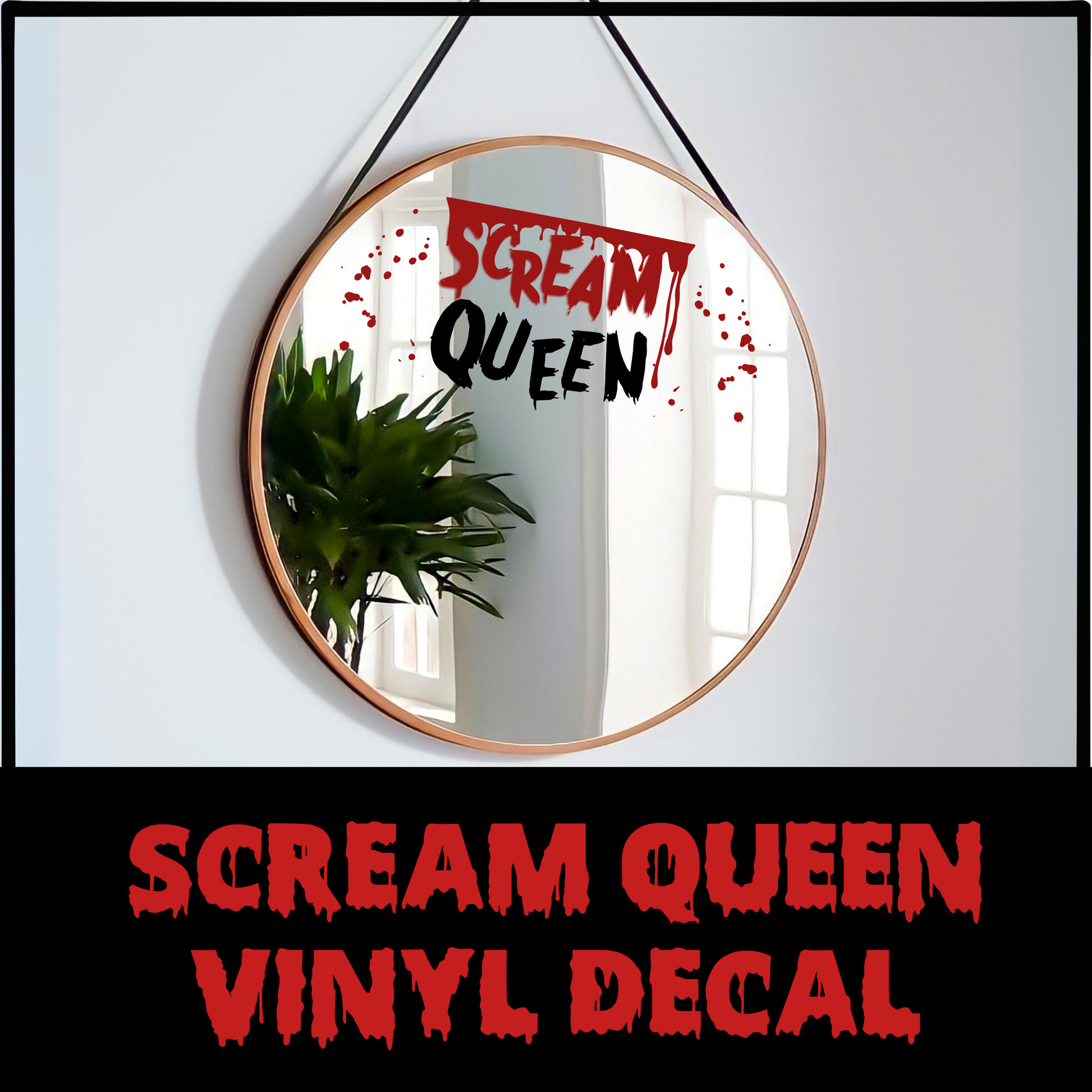 Our Scream Queen Vinyl Decal is the perfect way to show off your love for the scream queens of horror. The word "Scream", along with blood spatter, comes in a striking **metallic red**, while the word "Queen" is available in either black or white gloss vinyl—we recommend the white for dark surfaces like tinted car windows.