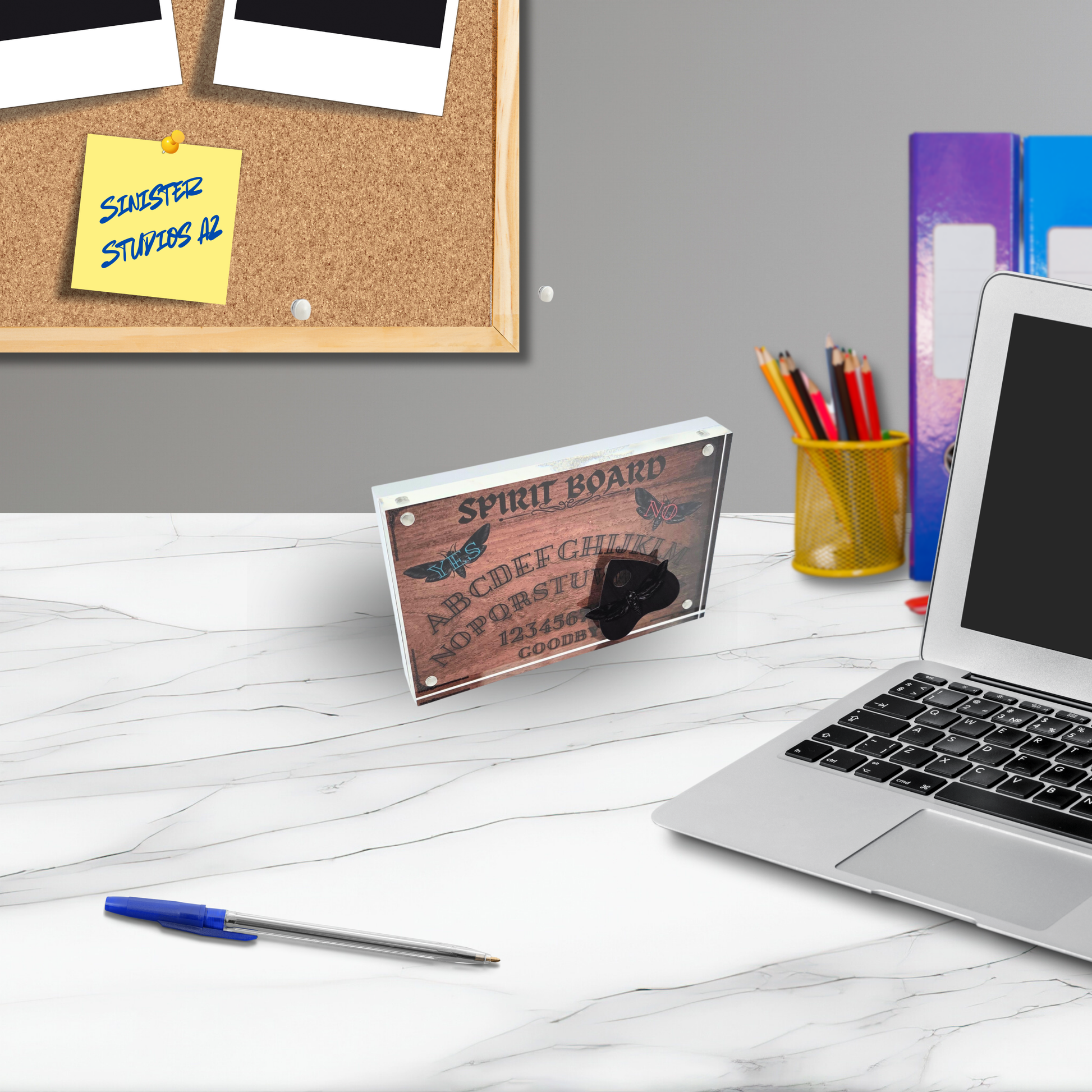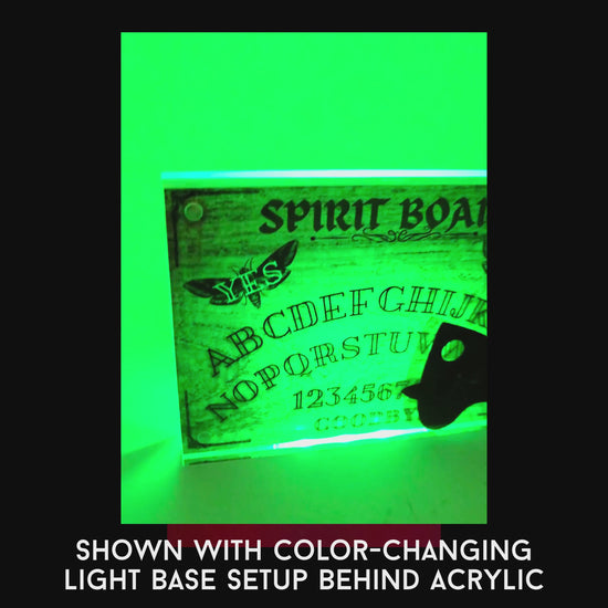 This gothic-inspired display features a vintage wood-look spirit board design layered inside a 6” x 4” clear acrylic frame, creating a dimensional illusion that shifts dramatically when paired with a color-changing LED base.