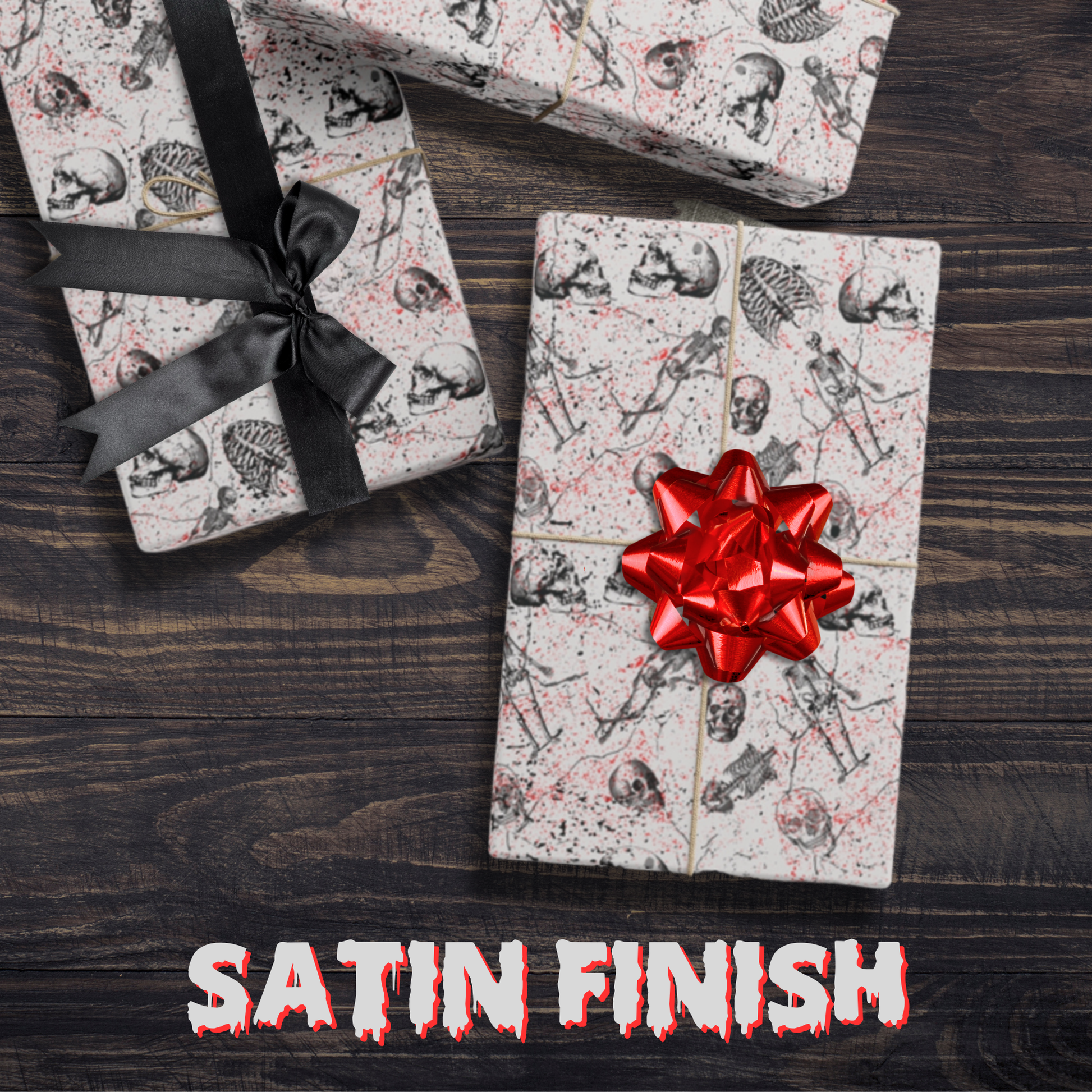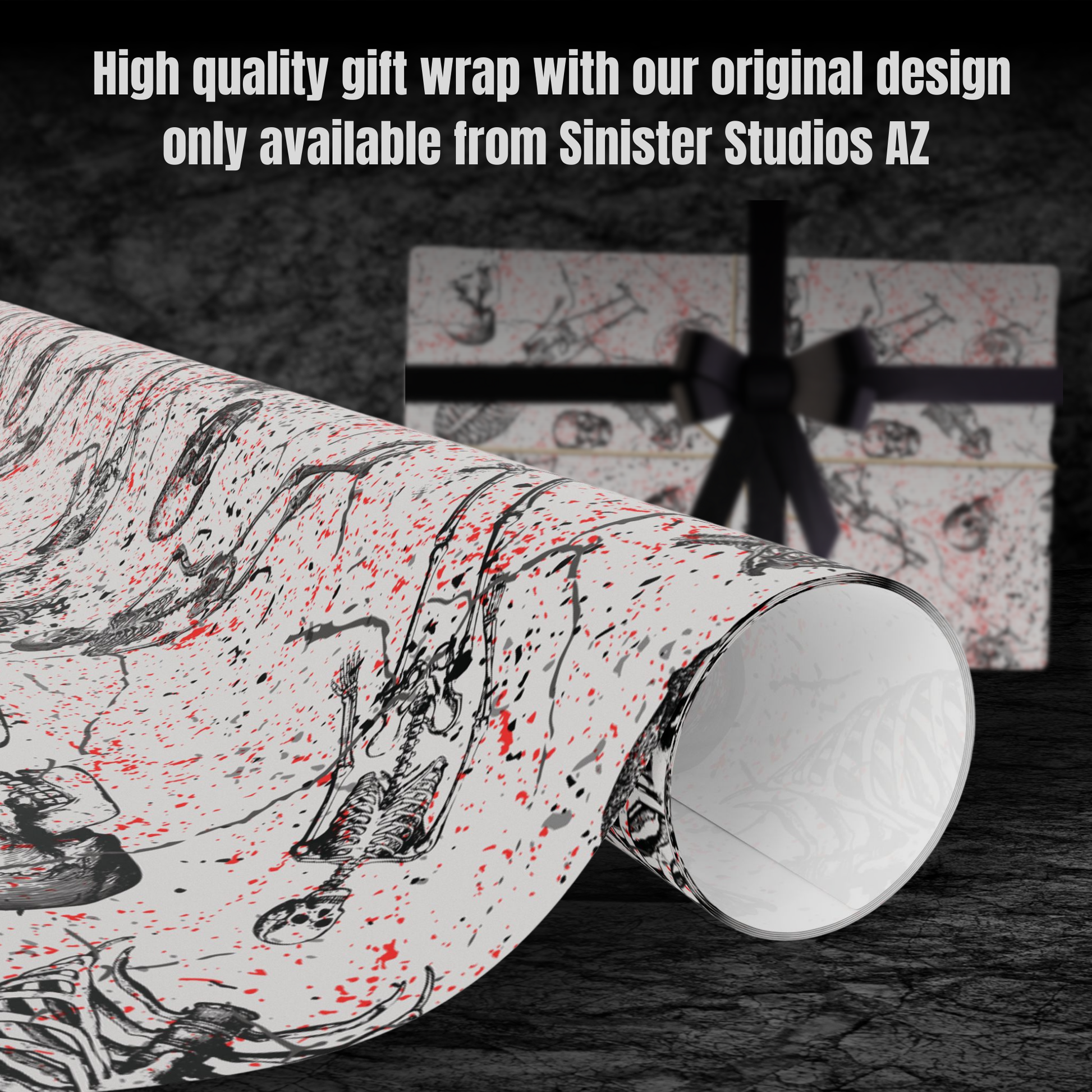 Varying skeleton parts along with some blood red spatter on a light grey background, adds a gothic grungy touch to this thick high quality gift wrapping paper.