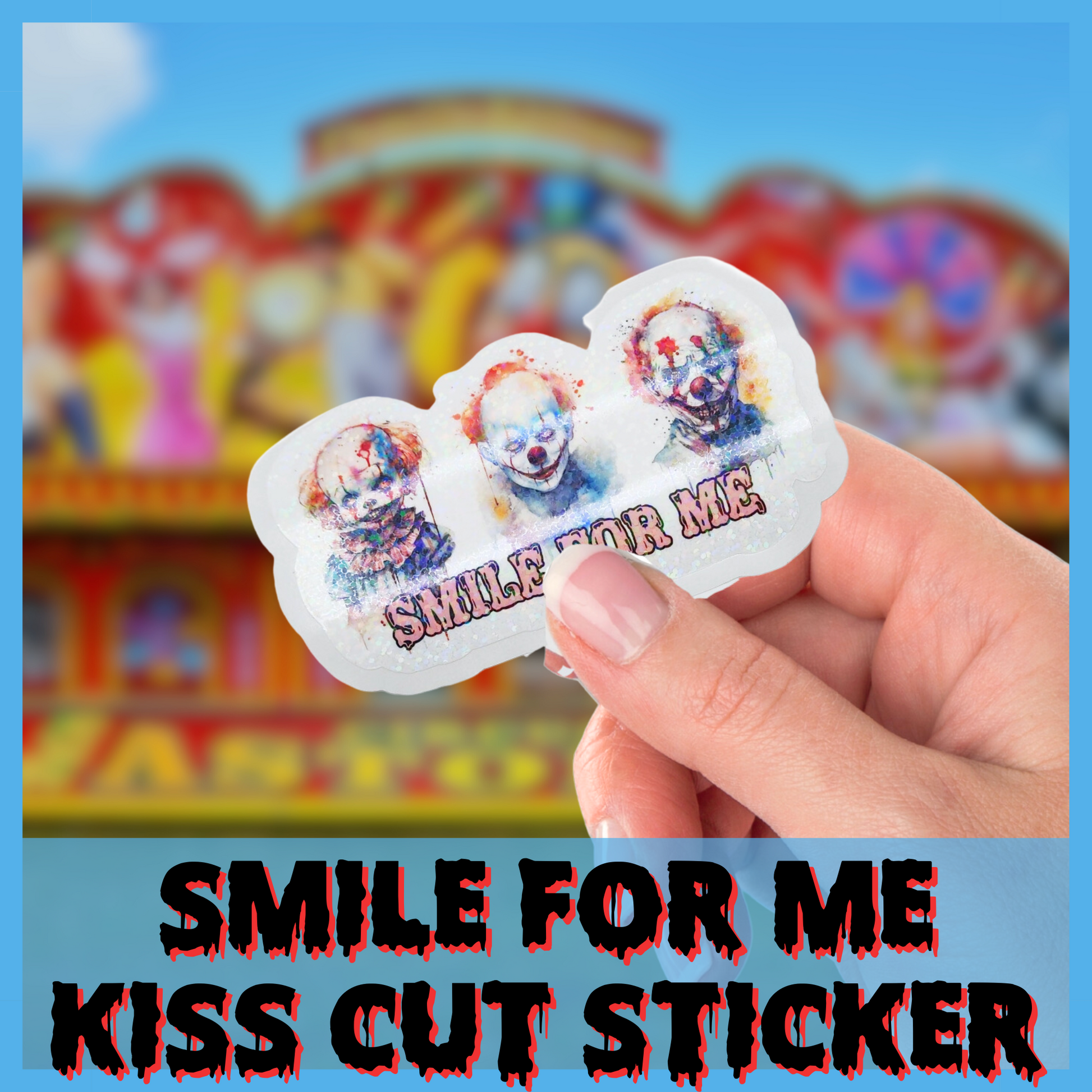 Our unsettling jesters invite you to "smile for me" through our kiss-cut, easily-peeled vinyl sticker. Take your pick from two sizes and two finishes, adding a touch of horror to your collection.