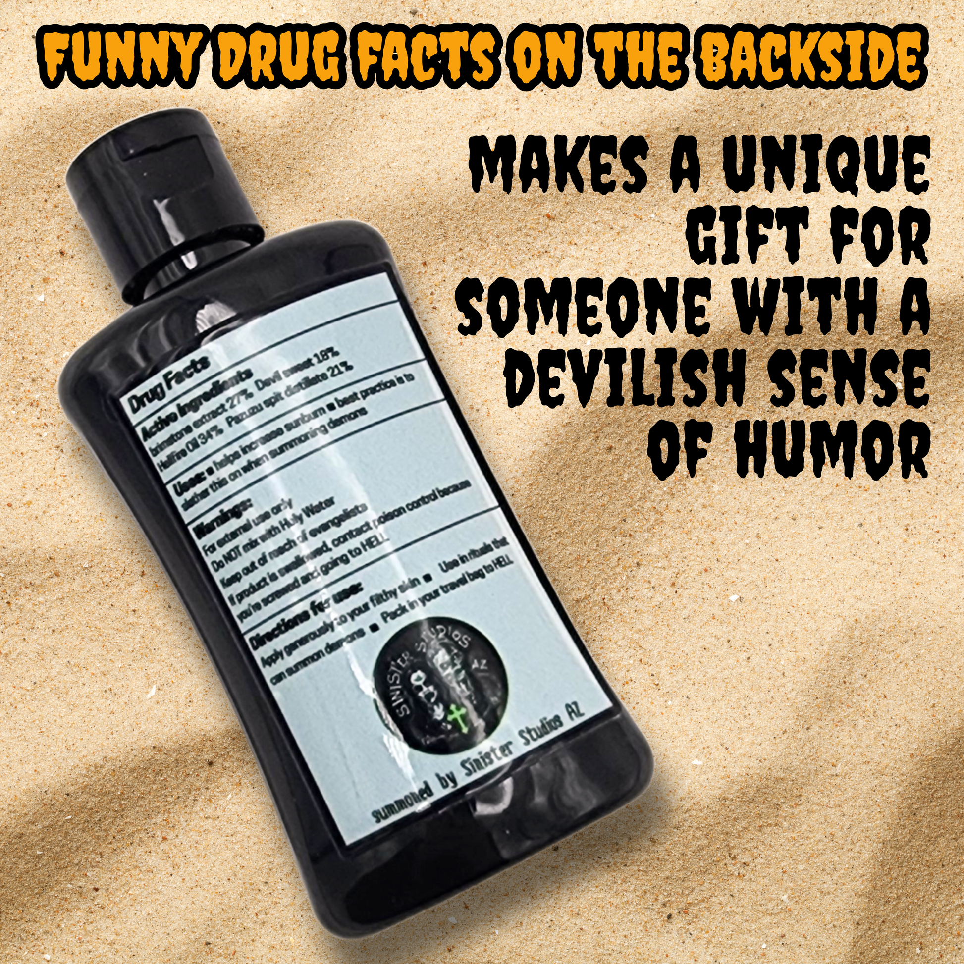 The sleek black bottle features flaming SPF 666 artwork on the front and a fake “drug facts” label on the back loaded with devilishly funny ingredients (like demon extract and pure evil). A great novelty gift for horror lovers, goth beachgoers, spooky travelers, and anyone with a wicked sense of humor.
