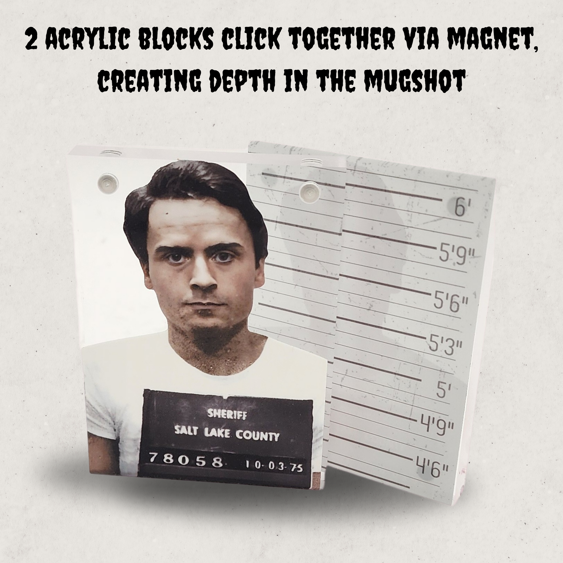 This acrylic features Ted Bundy, America's infamous serial killer. His mugshot includes the date of his arrest, the county jail that took him in, and the height chart behind him—accurately reflecting his real stature.
